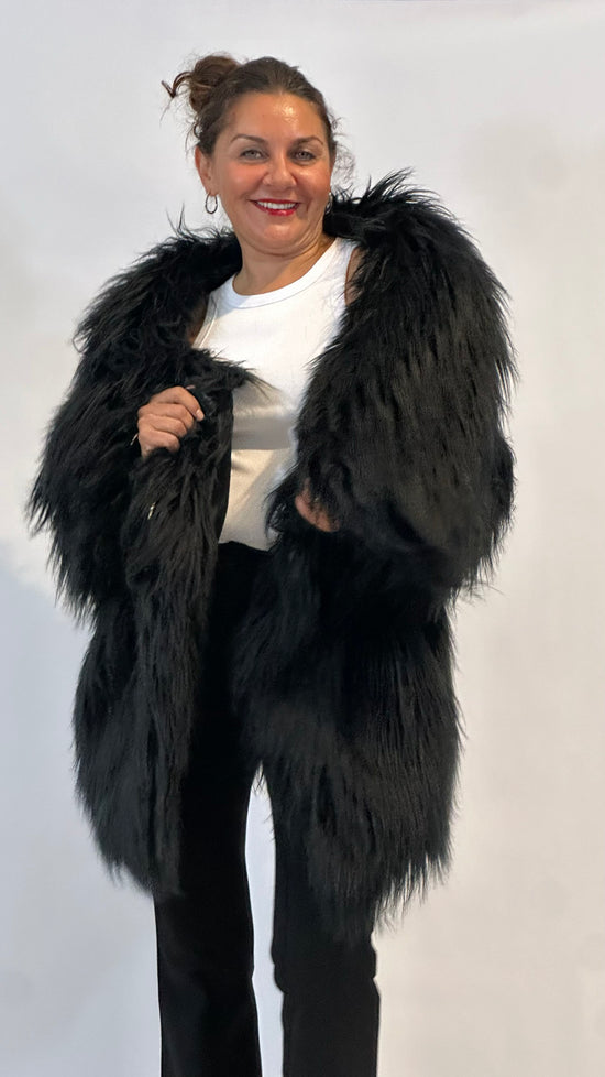 Wrap yourself in the relaxed style of this asymmetrical faux fur coat that can be worn open or closed with a beautiful draped front detail – cowl-draped cut with slit pockets and metal ring clasp.