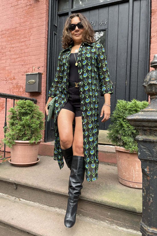 Versatile design that can be worn as a dress, jacket or a kaftan on your swimsuit for the beach. It’s made with organic cotton in a lovely Turkish tulip pattern. The signature evil eye at the nape of the neck will protect you from bad luck according to Turkish tradition.
