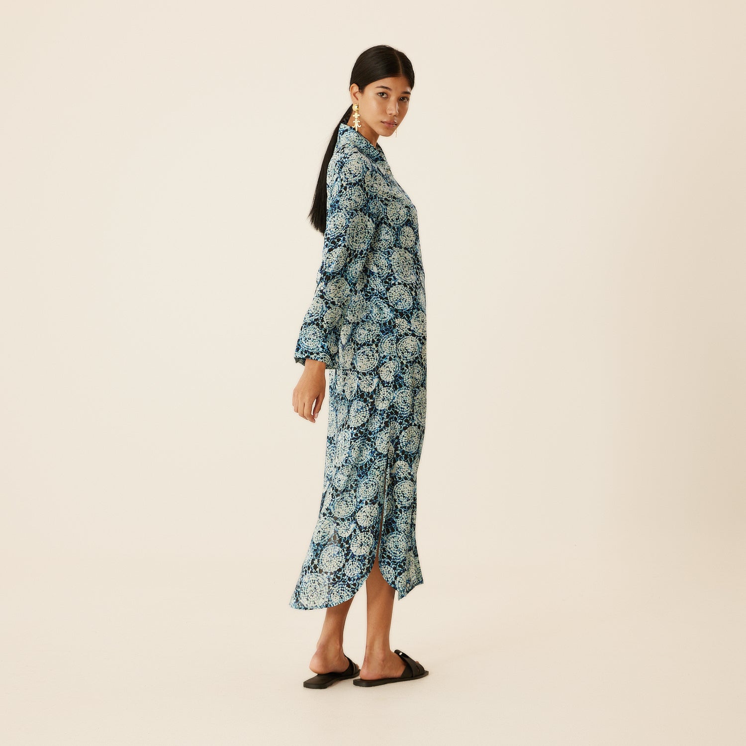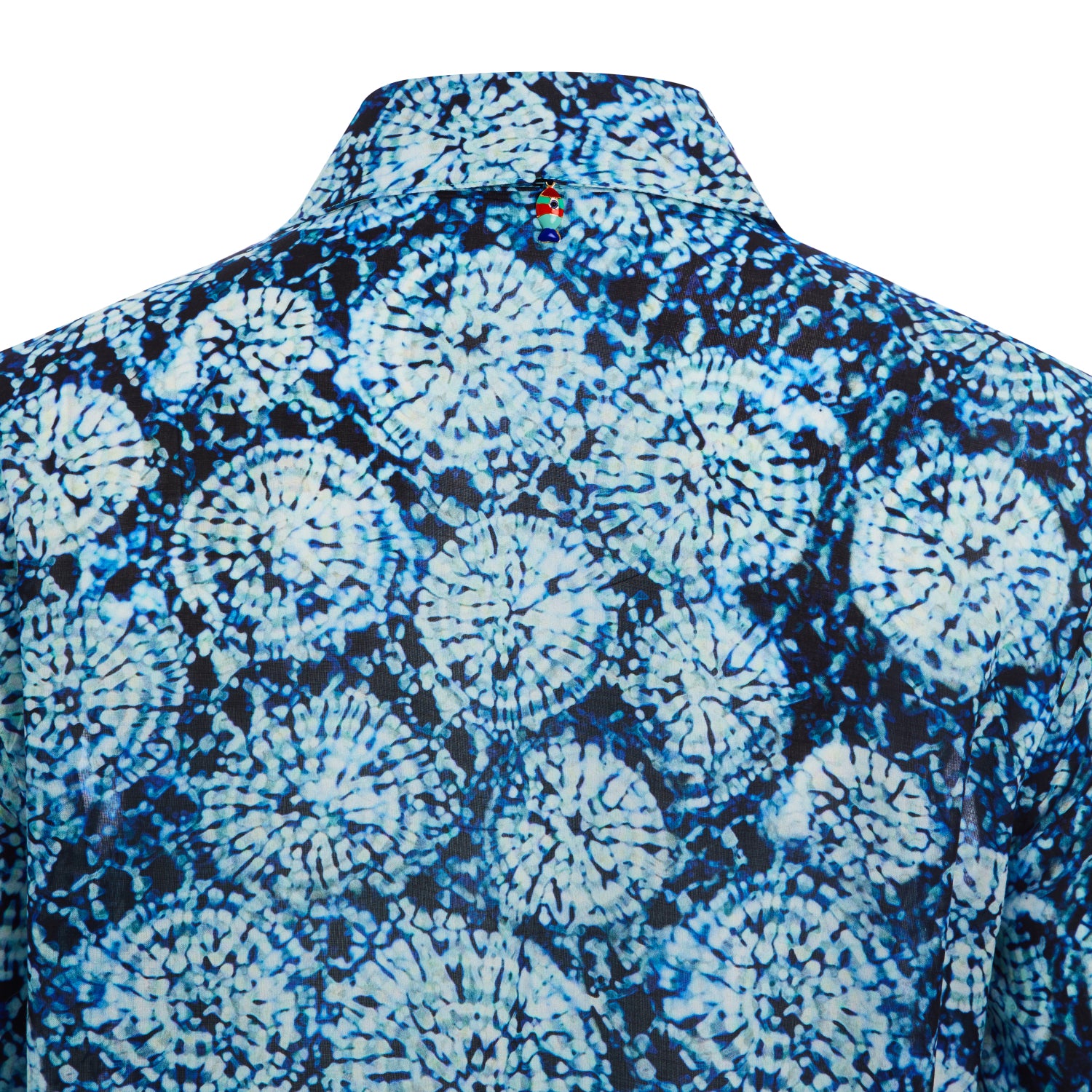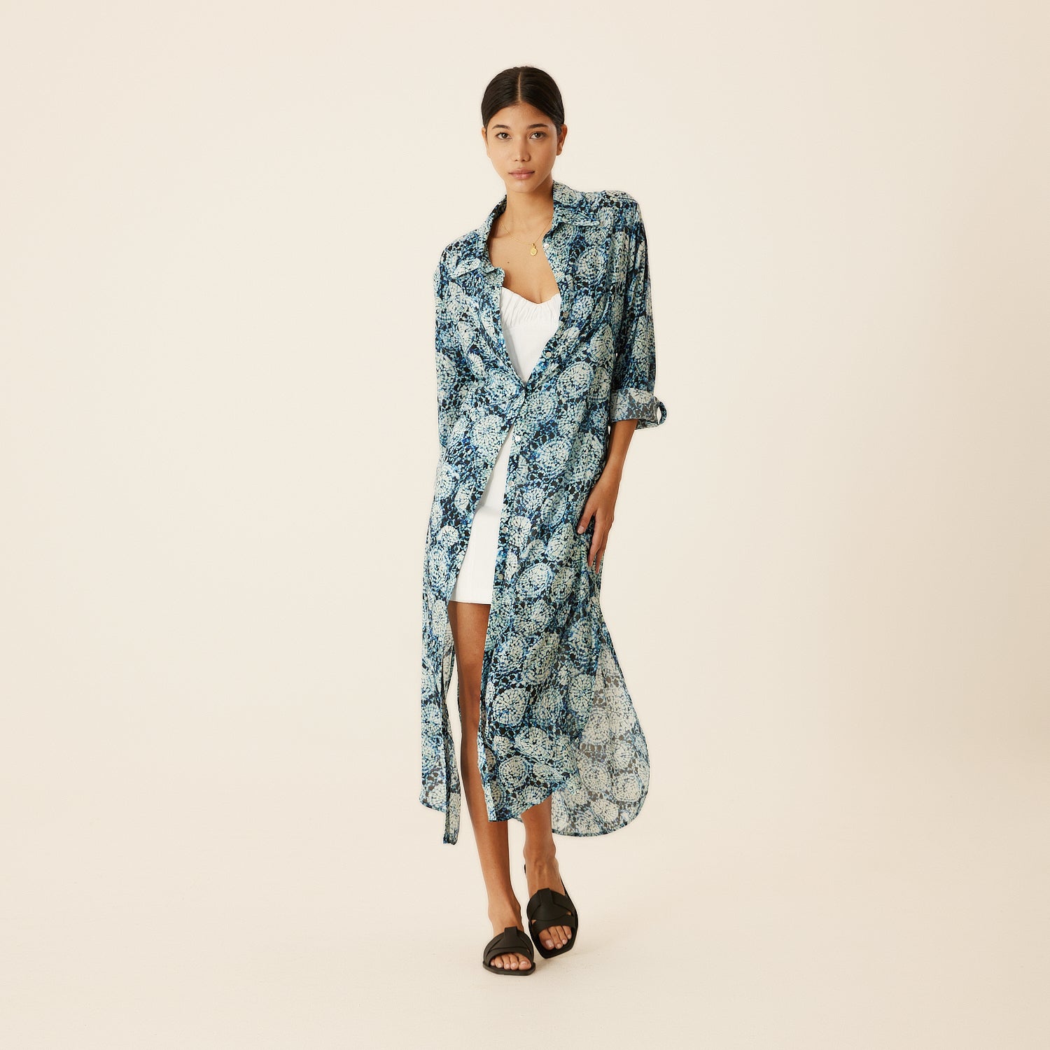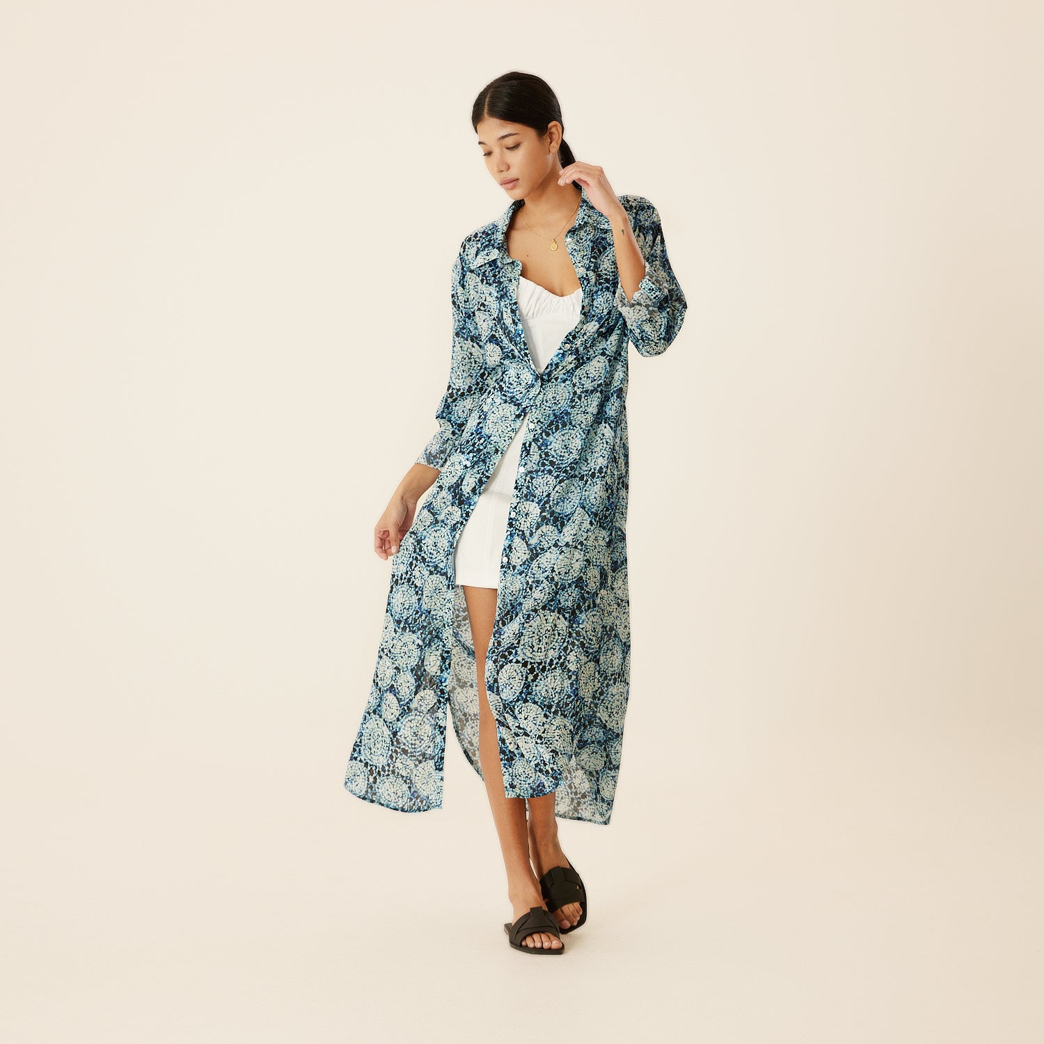 Charming aqua patterned shirt dress, has a silky touch flowing fabric. Perfect casual wear, easily adaptable for the beach or city. Can also be worn as a Kaftan over your swimsuit. It has a comfortable fit and 3/4 sleeve length. Carrying the signature Evil Eye of N‘ONAT In the back of the neck to protect you from bad luck.