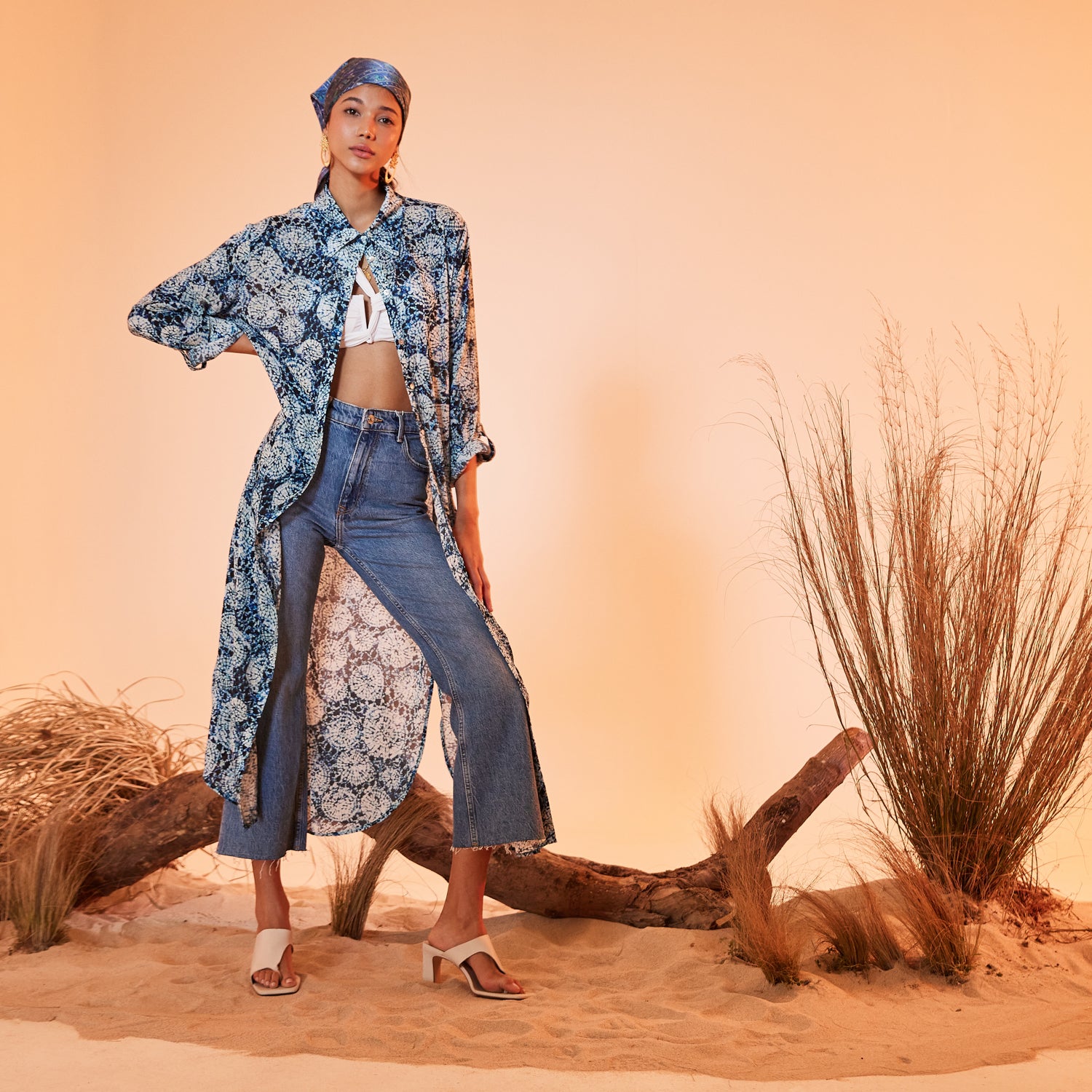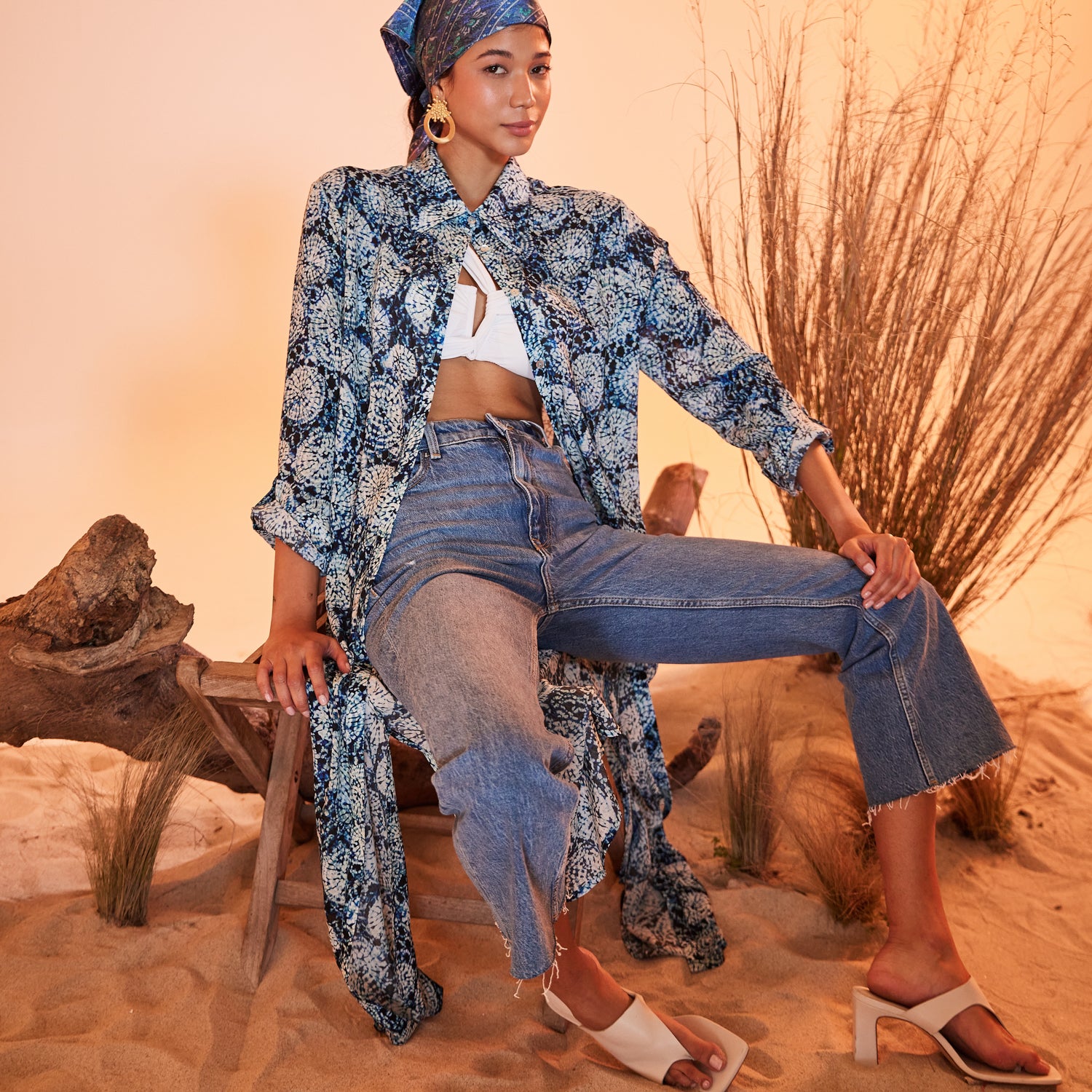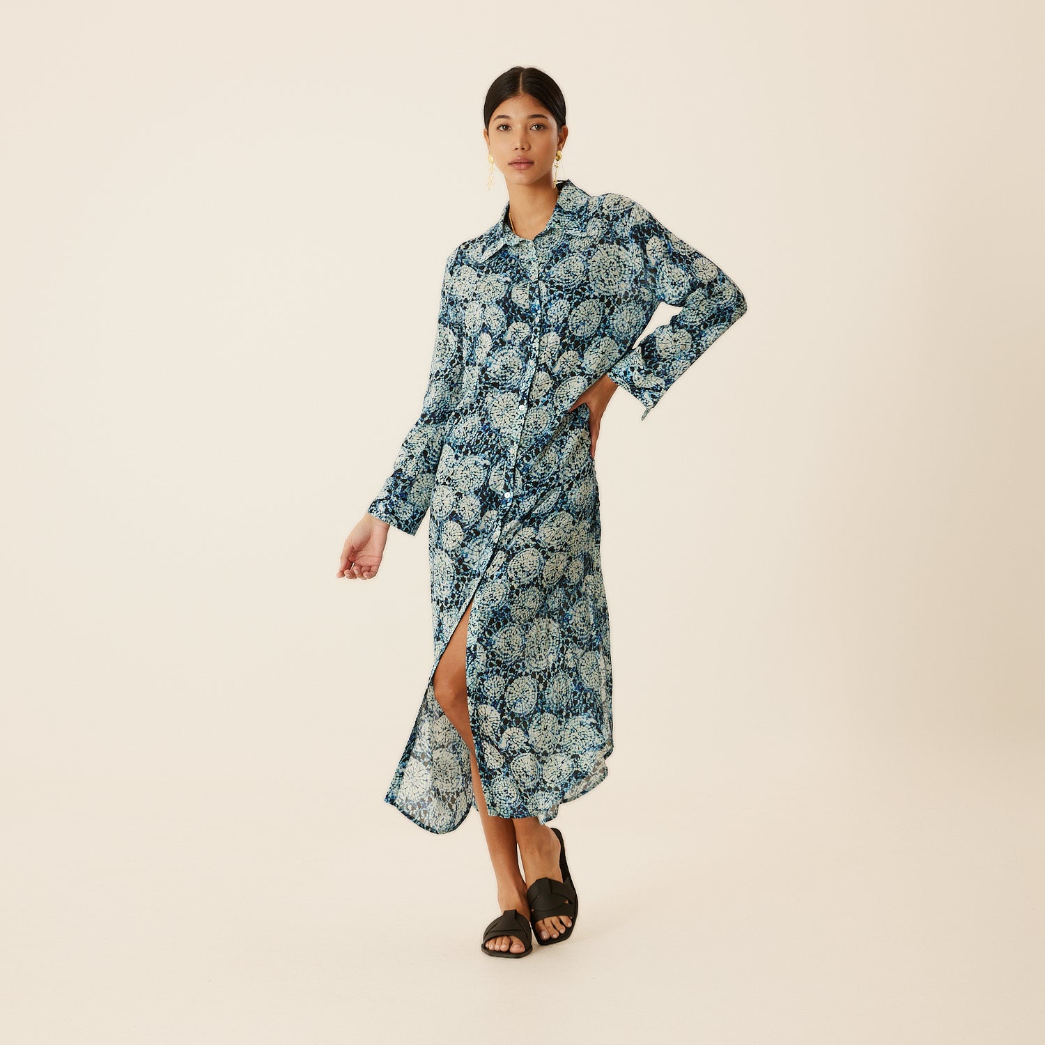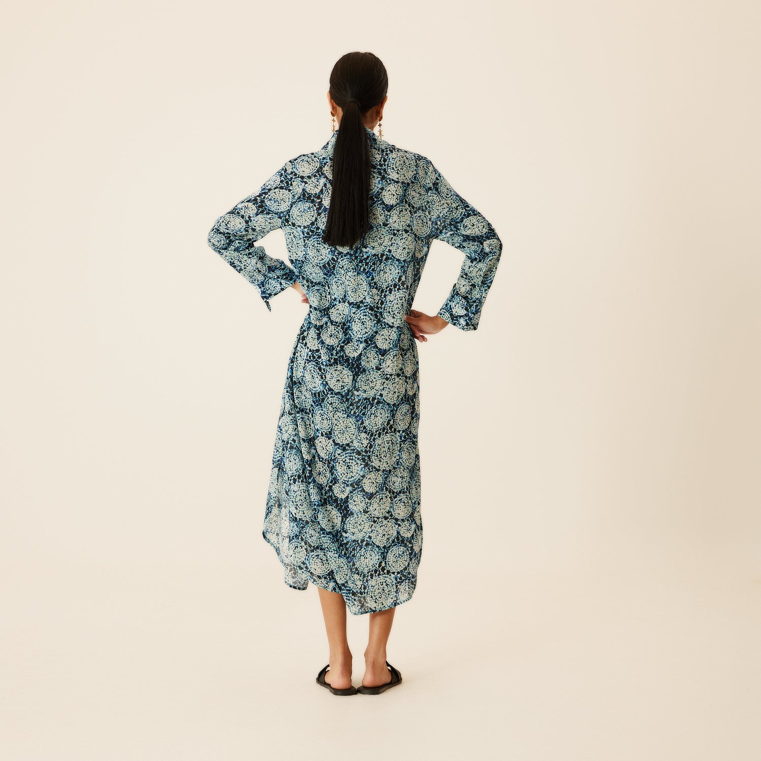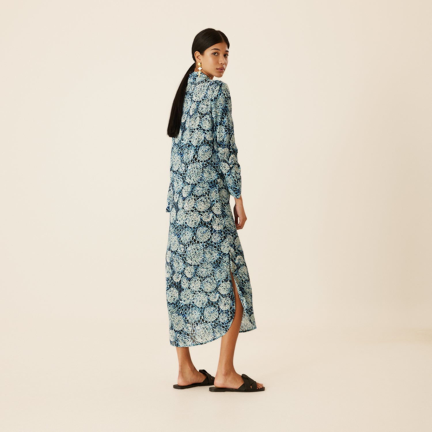 Charming aqua patterned shirt dress, has a silky touch flowing fabric. Perfect casual wear, easily adaptable for the beach or city. Can also be worn as a Kaftan over your swimsuit. It has a comfortable fit and 3/4 sleeve length. Carrying the signature Evil Eye of N‘ONAT In the back of the neck to protect you from bad luck.