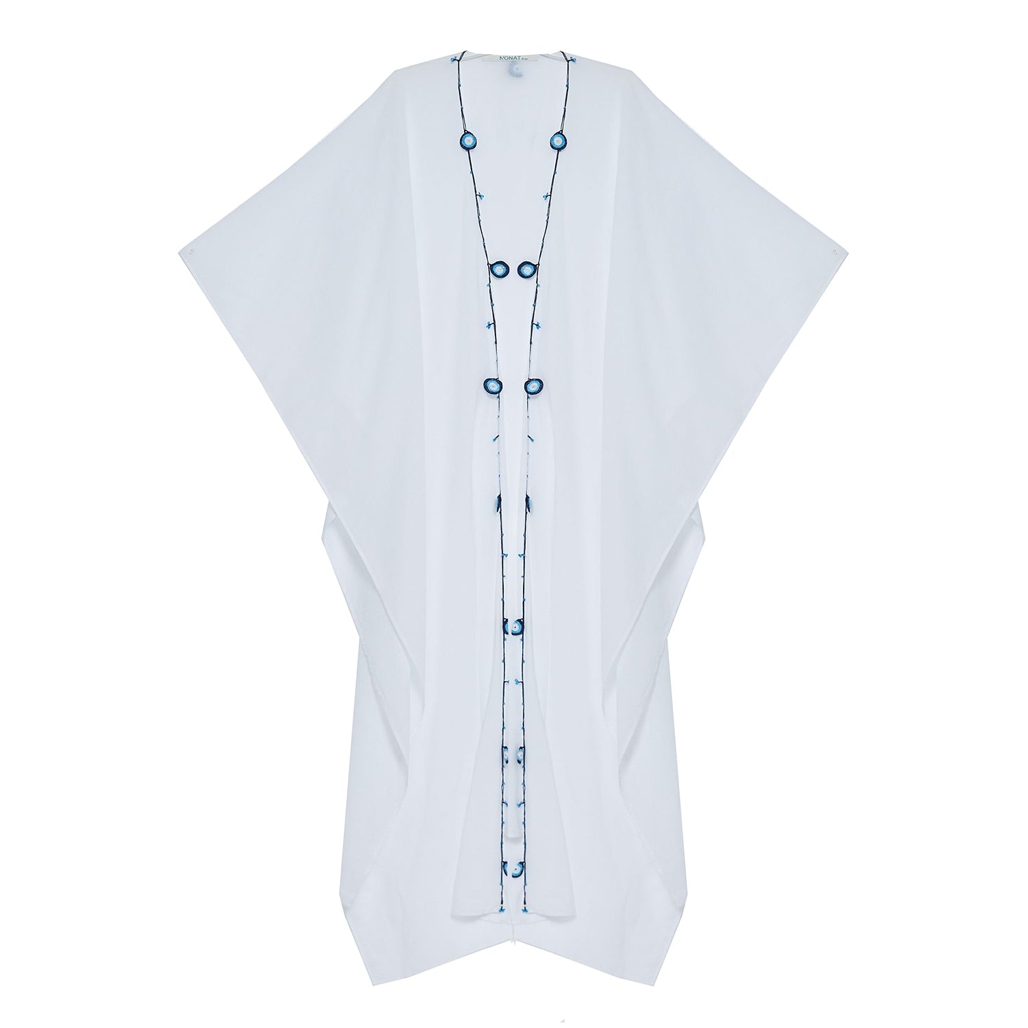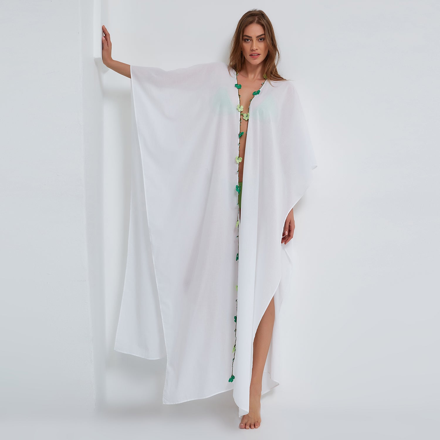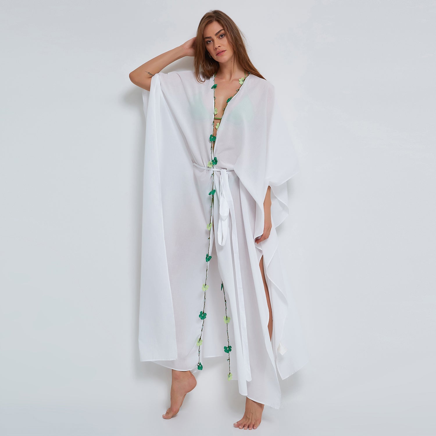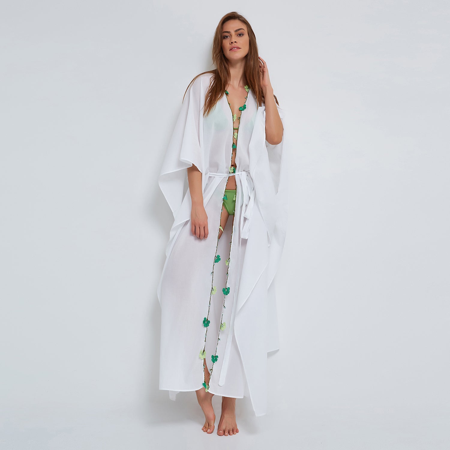 This cape style of open front tunic is adorned with hand needlework, each tunic has its own (unique) artisanal design. It’s made of organic cotton and comes with a belt that goes through slits at the waist to wrap your body. It is versatile; can be worn as open tunic or wrapped kaftan.