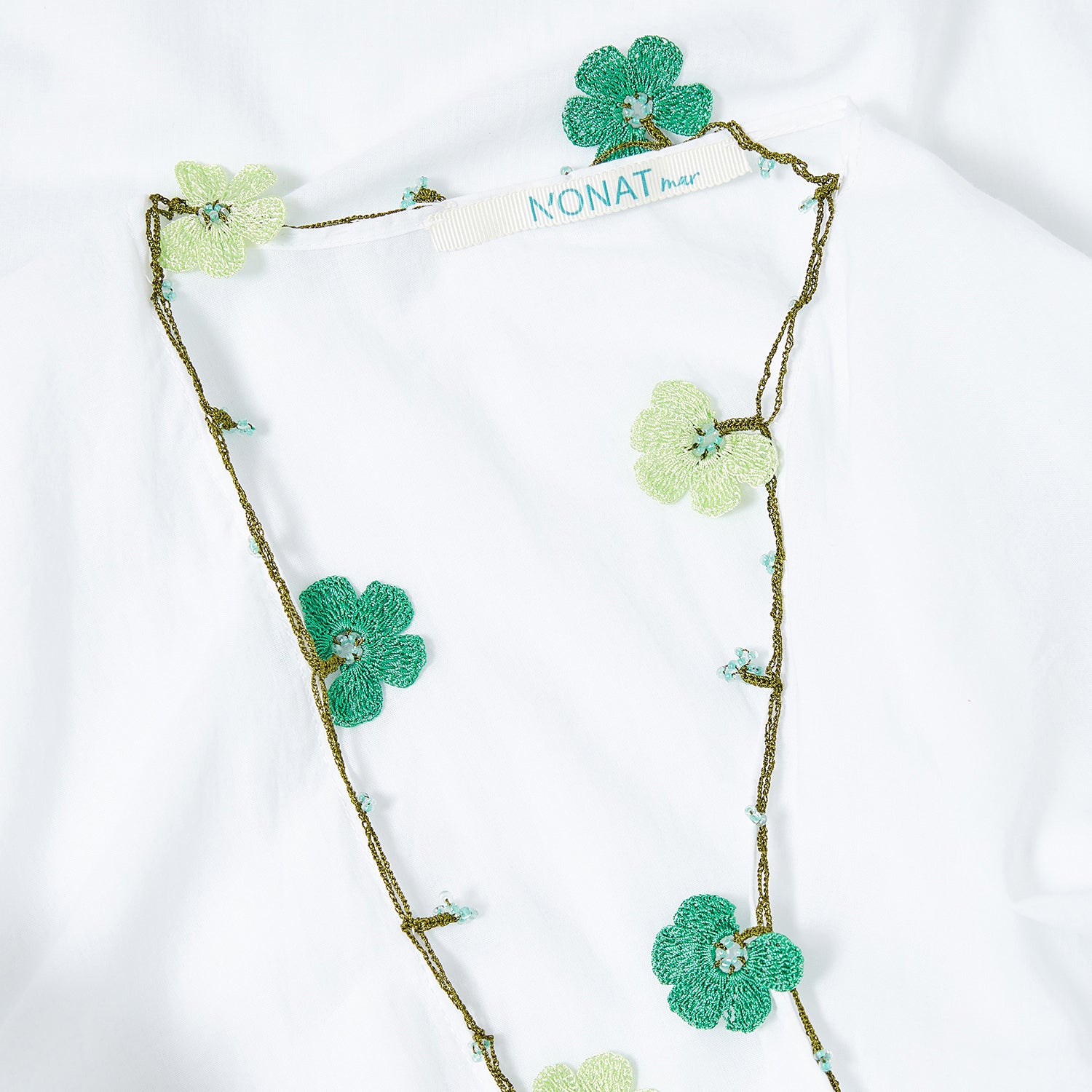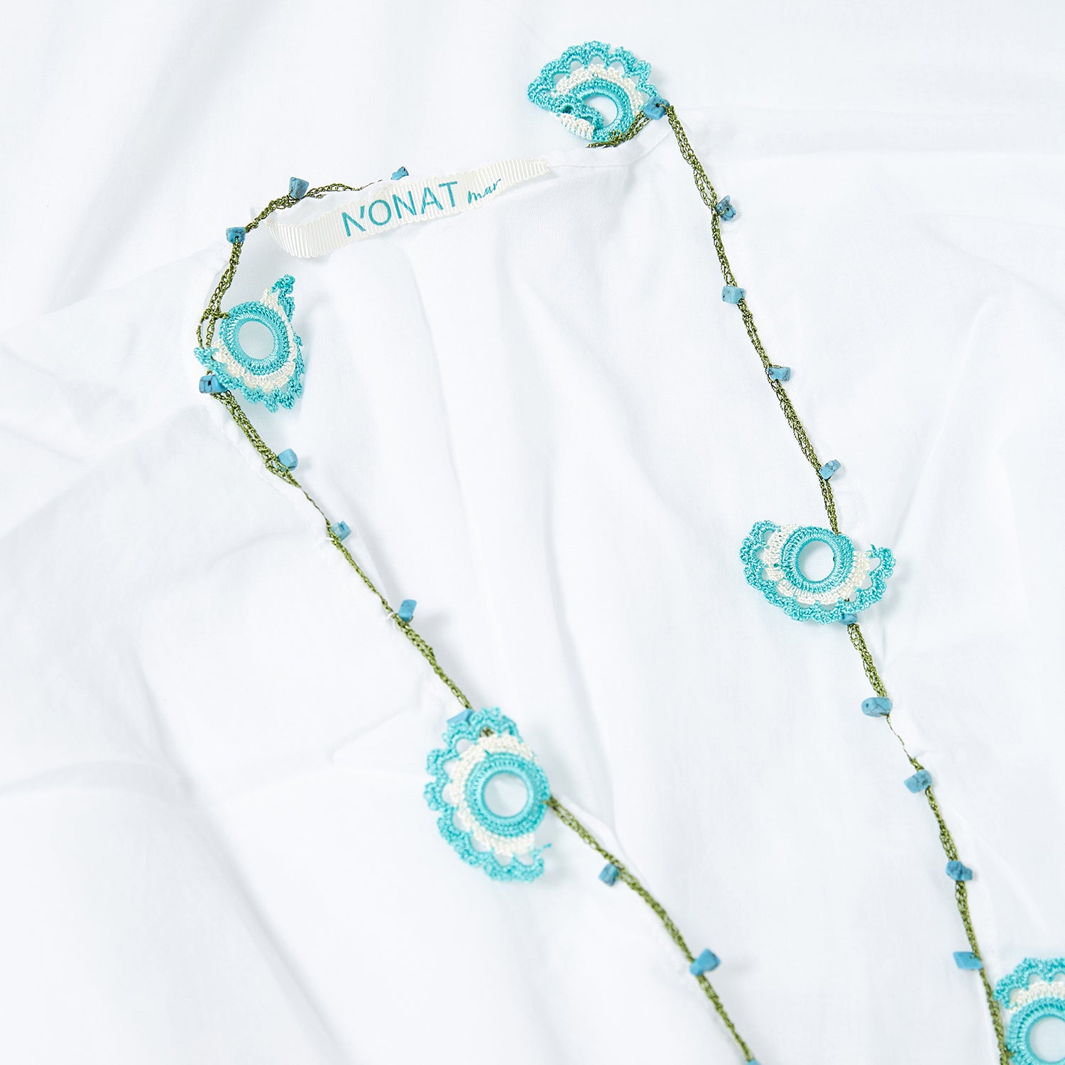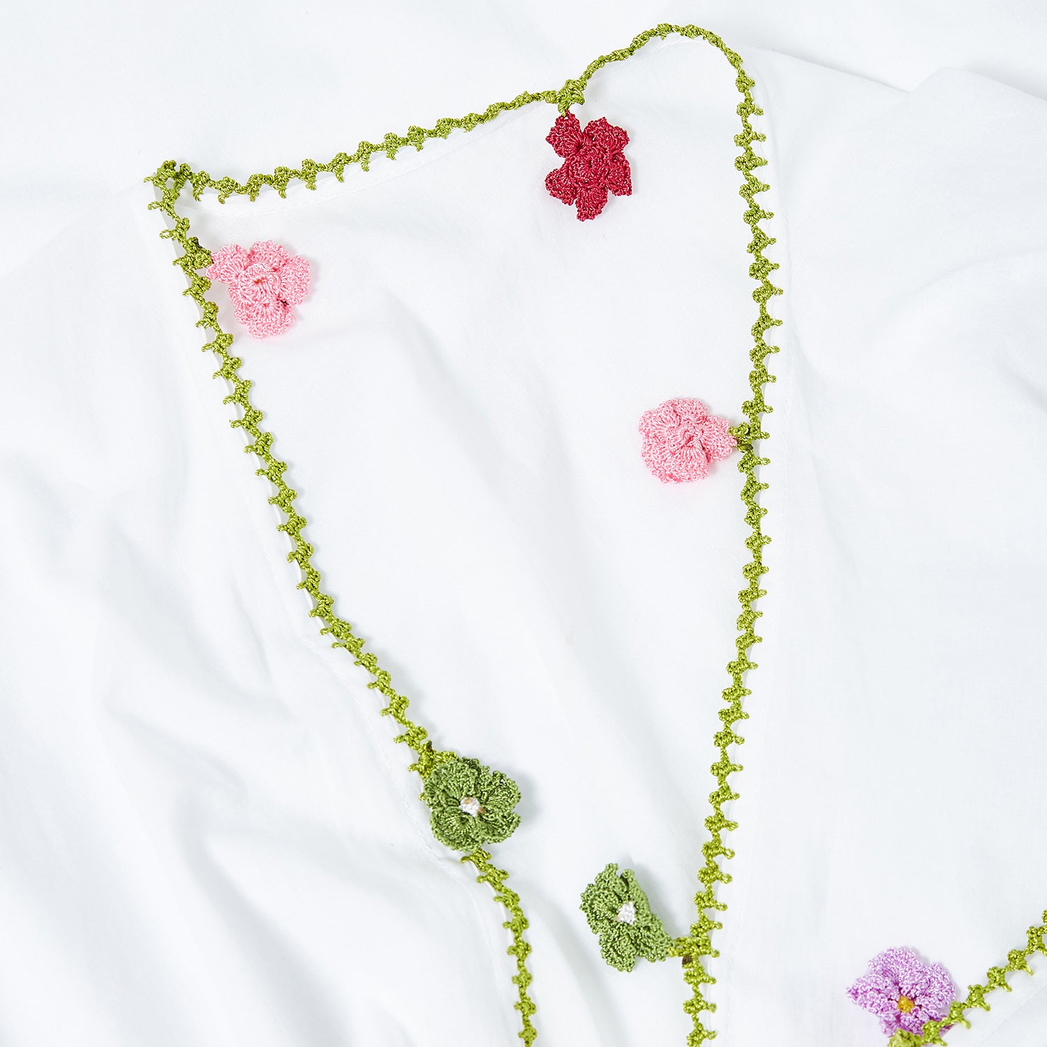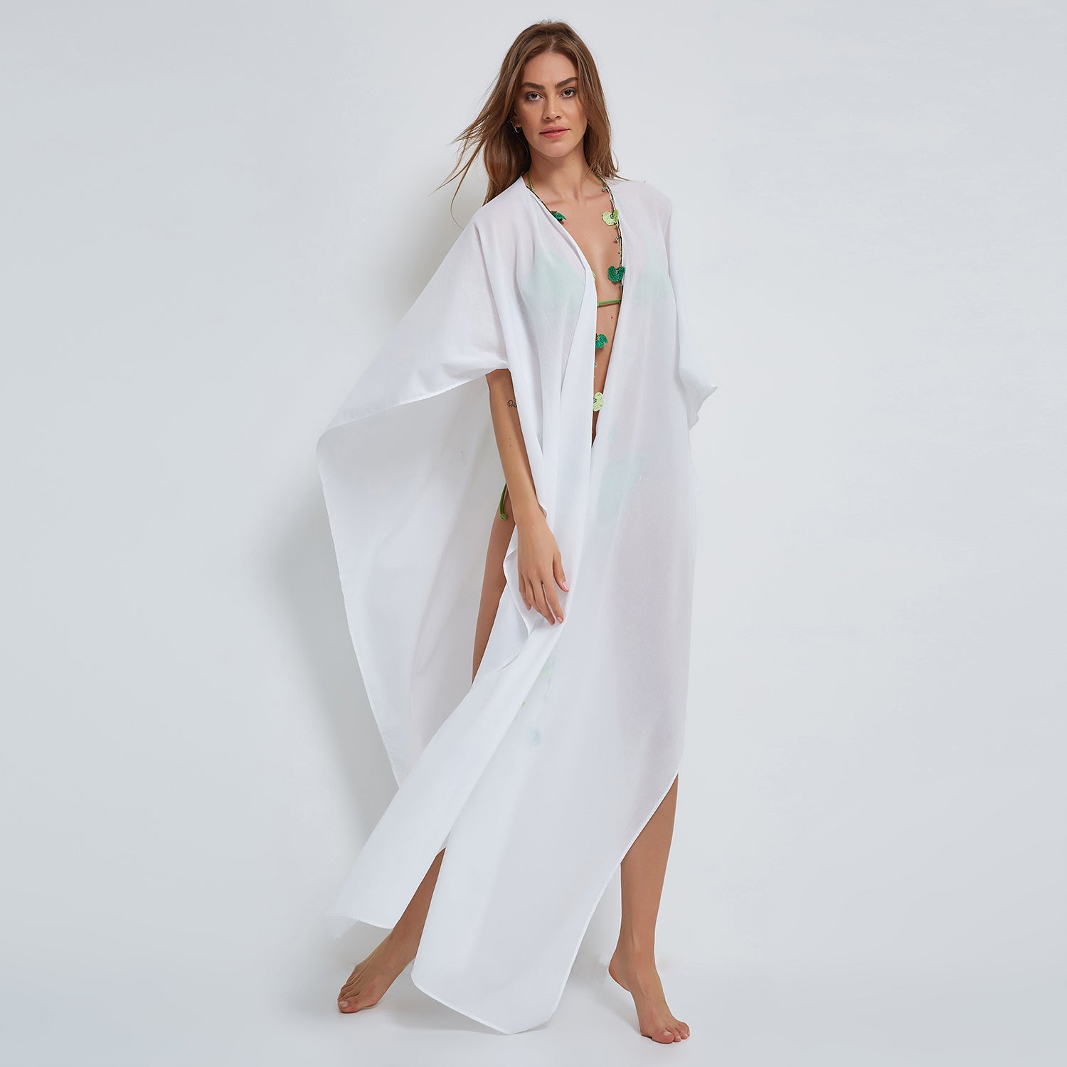 This cape style of open front tunic is adorned with hand needlework, each tunic has its own (unique) artisanal design. It’s made of organic cotton and comes with a belt that goes through slits at the waist to wrap your body. It is versatile; can be worn as open tunic or wrapped kaftan.