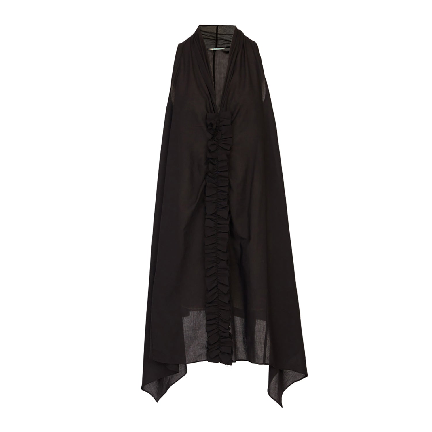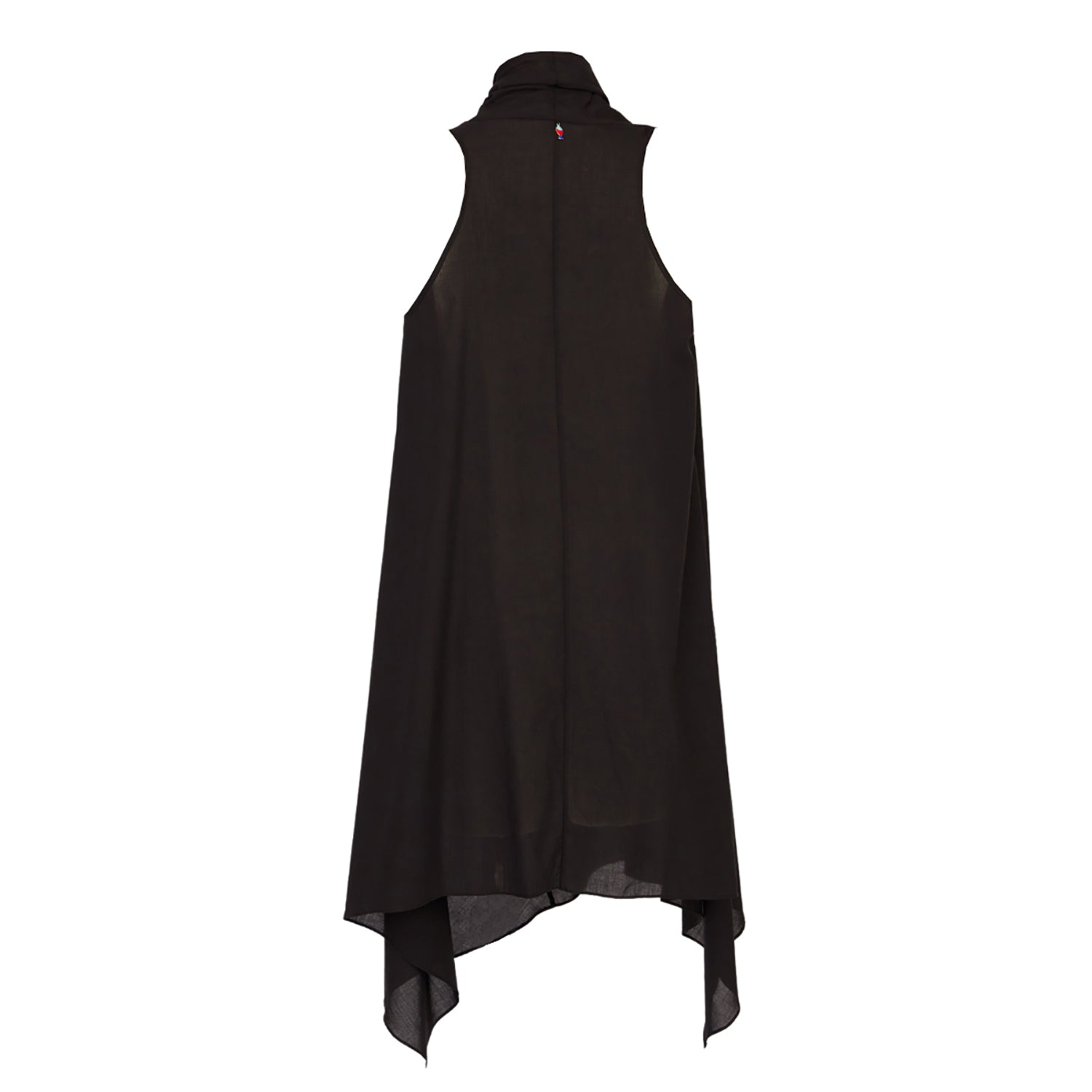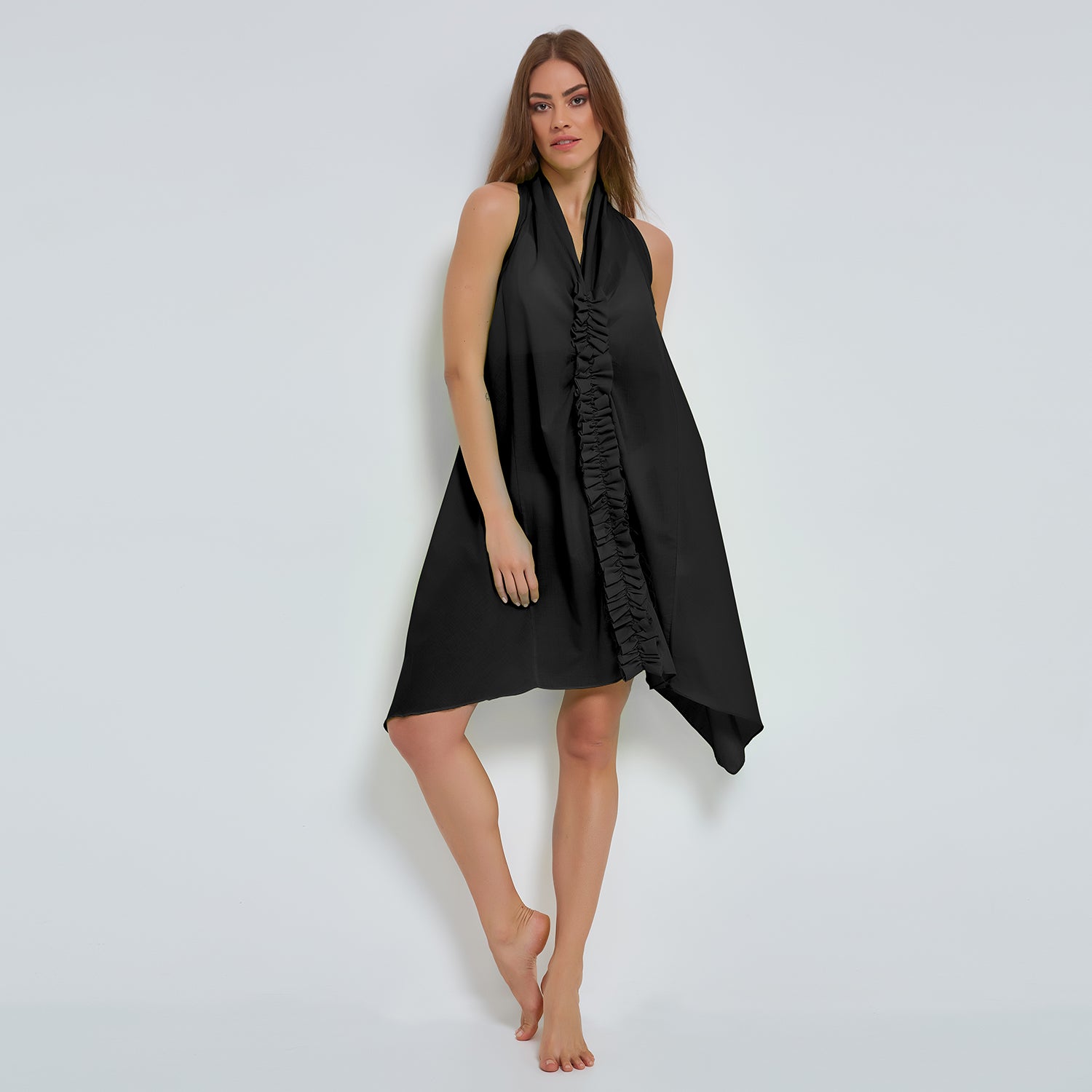 An asymmetrical dress is flowing with seamless ruffles cascading down the front. It is a slip-on and go type of dress. It is made of organic cotton, takes you to the beach or to the city. A signature evil eye the nape of the neck of the dress will protect you from the bad luck.