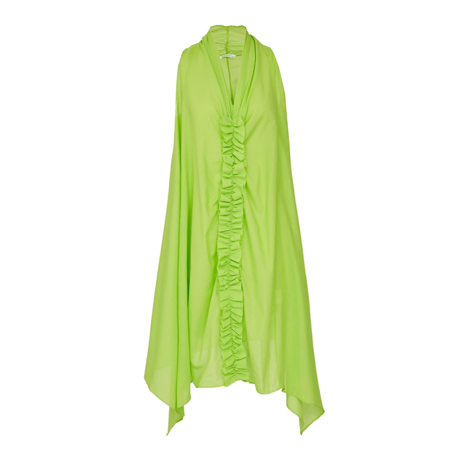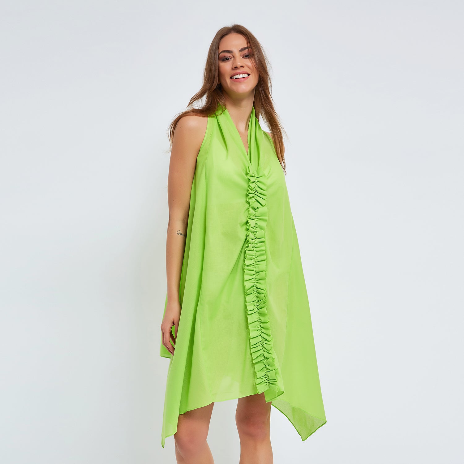An asymmetrical dress is flowing with seamless ruffles cascading down the front. It is a slip-on and go type of dress. It is made of organic cotton, takes you to the beach or to the city. A signature evil eye the nape of the neck of the dress will protect you from the bad luck.