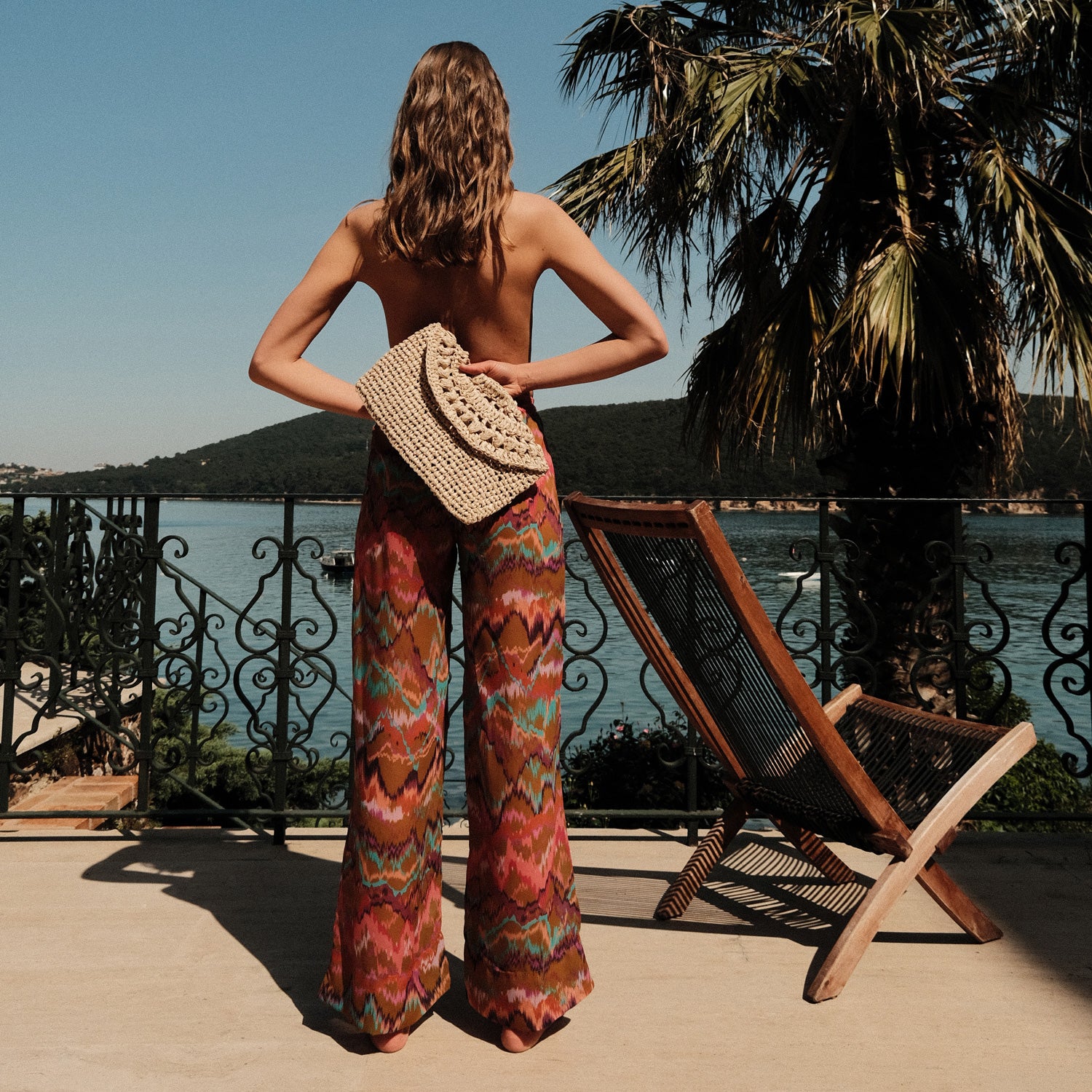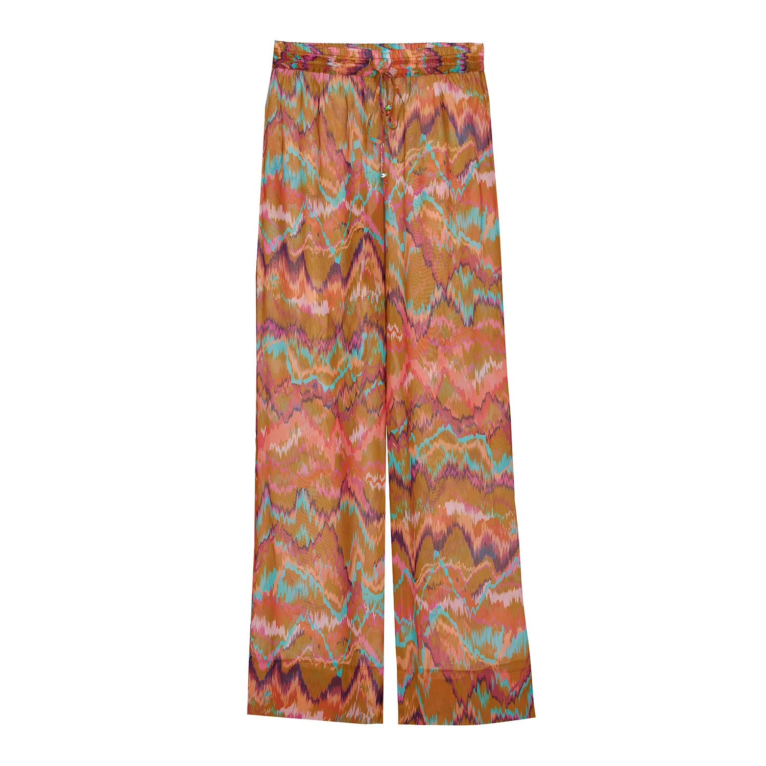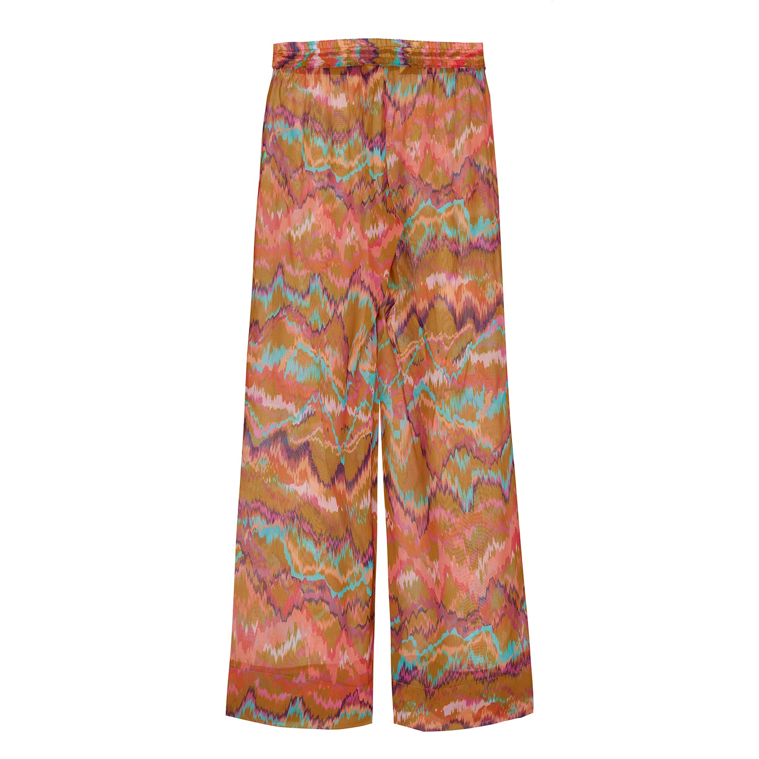 These pull-on trousers are very comfortable to wear with an elastic waist that has a drawstring with signature evil eye beads attached as stoppers. It is made of semi-see through silky polyester. Perfect for lounging at home or at the beach. Can be matched with Zig-zag Tunic from our collection.