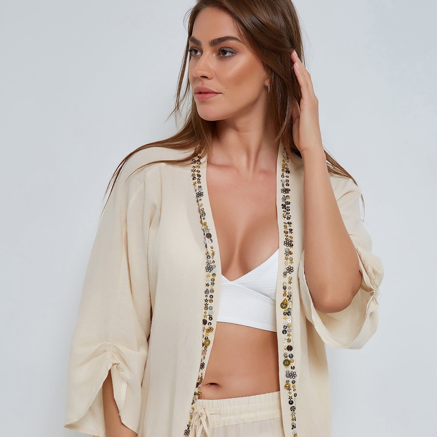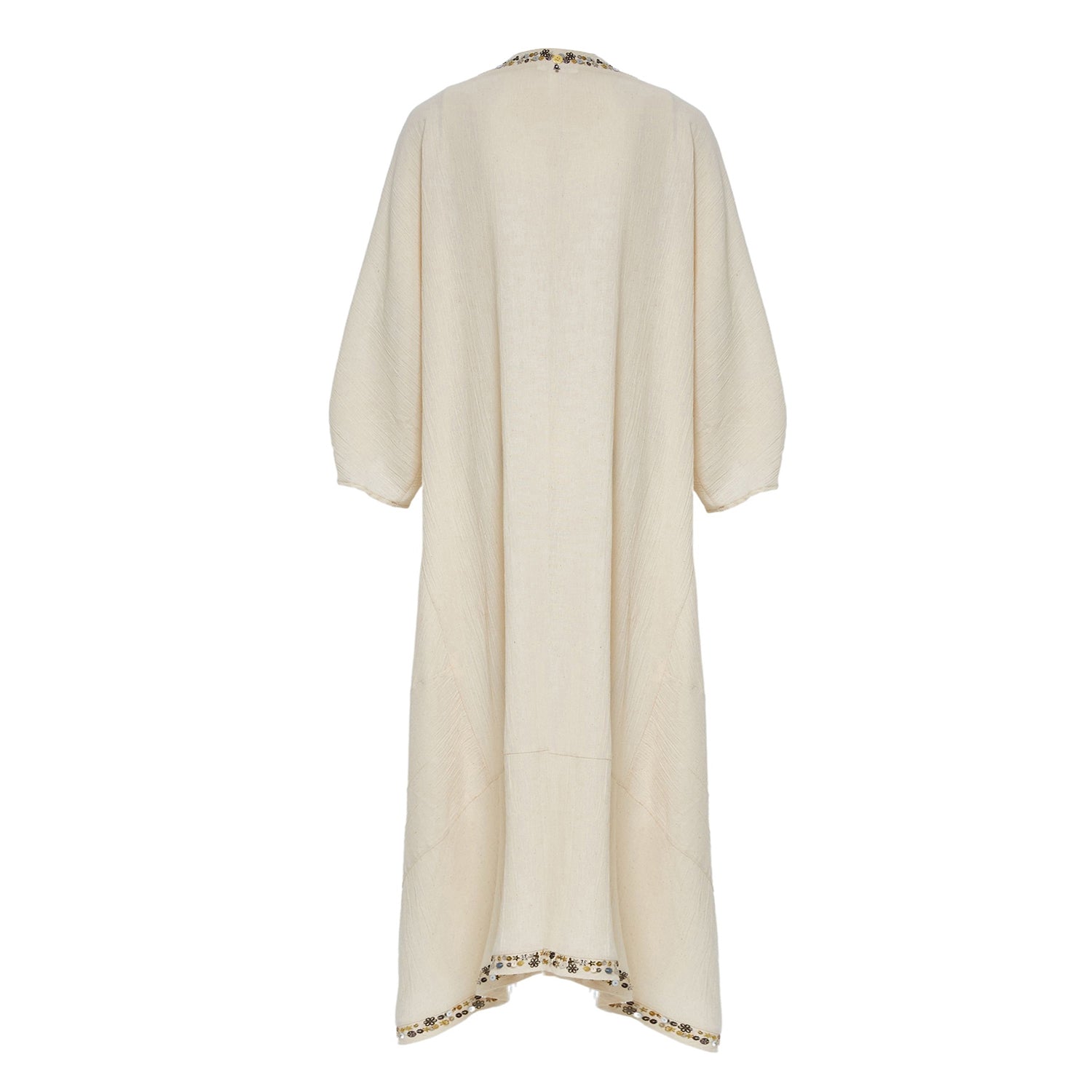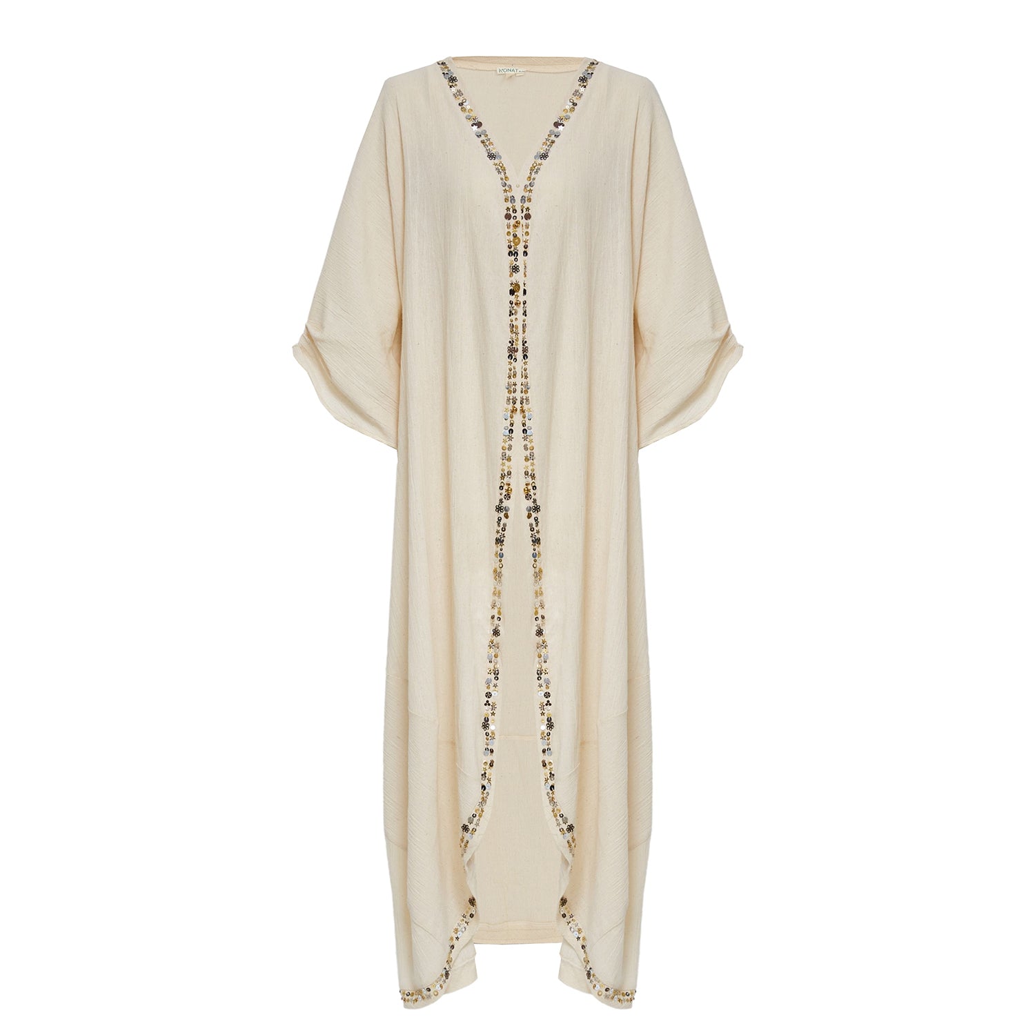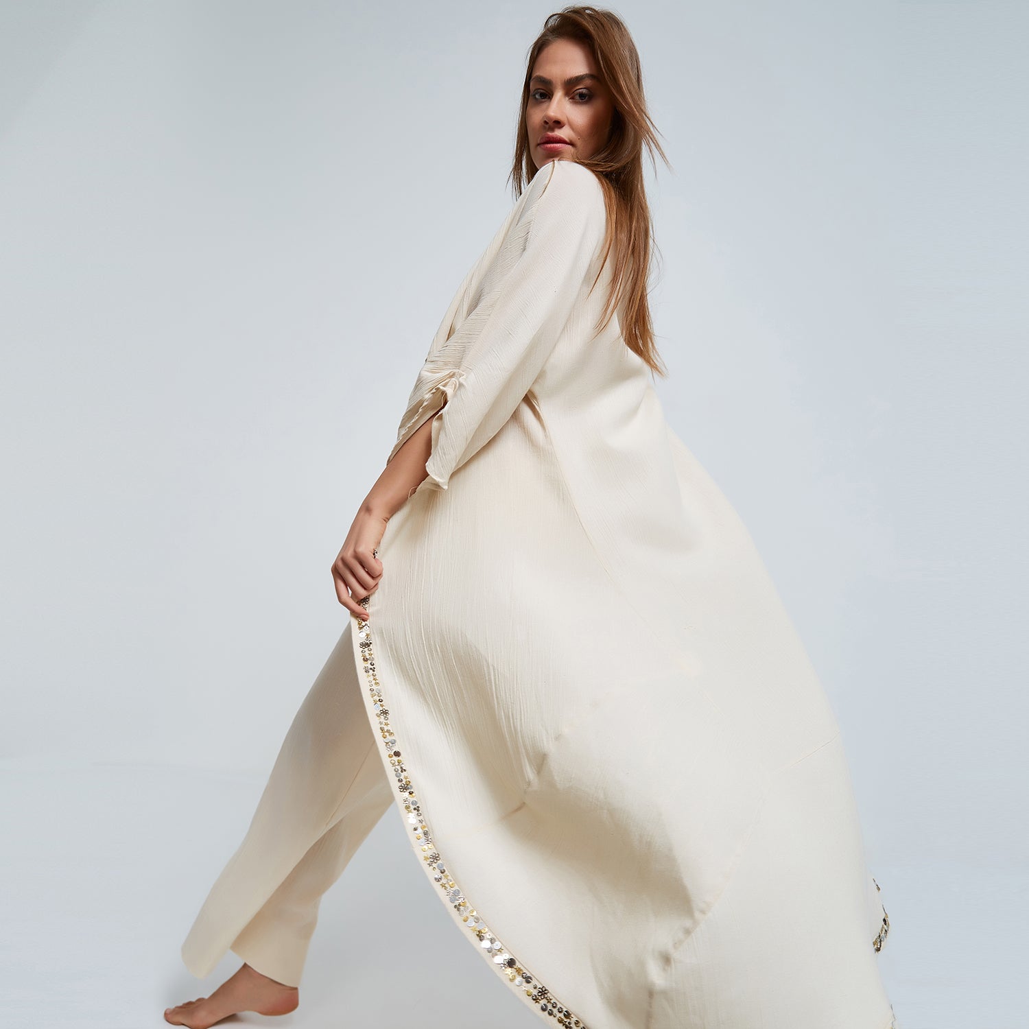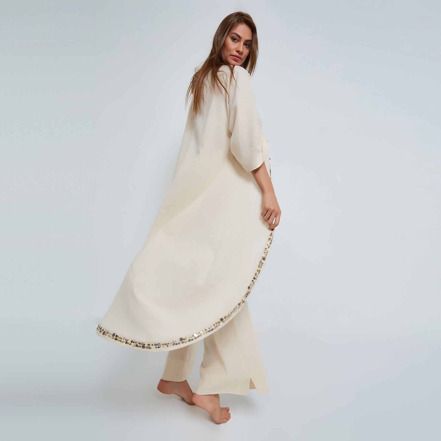A chic flowing kaftan adorned with metal sequins and tiny bells that make you feel like dancing with every step you take. So versatile that can go anywhere from the beach or even to a cocktail party. The signature evil eye at the nape of the neck, will protect you from bad luck. Can be paired with matching trousers.