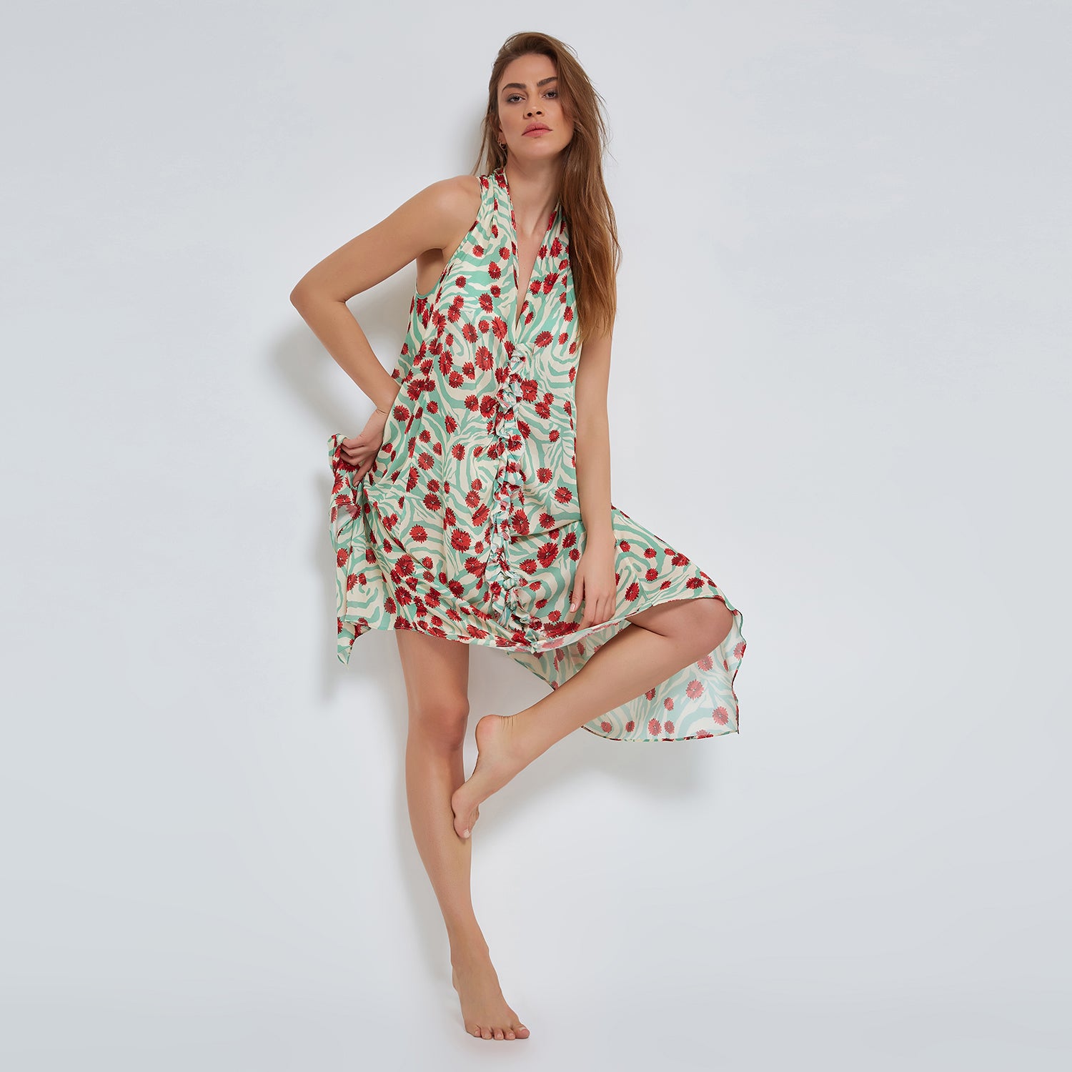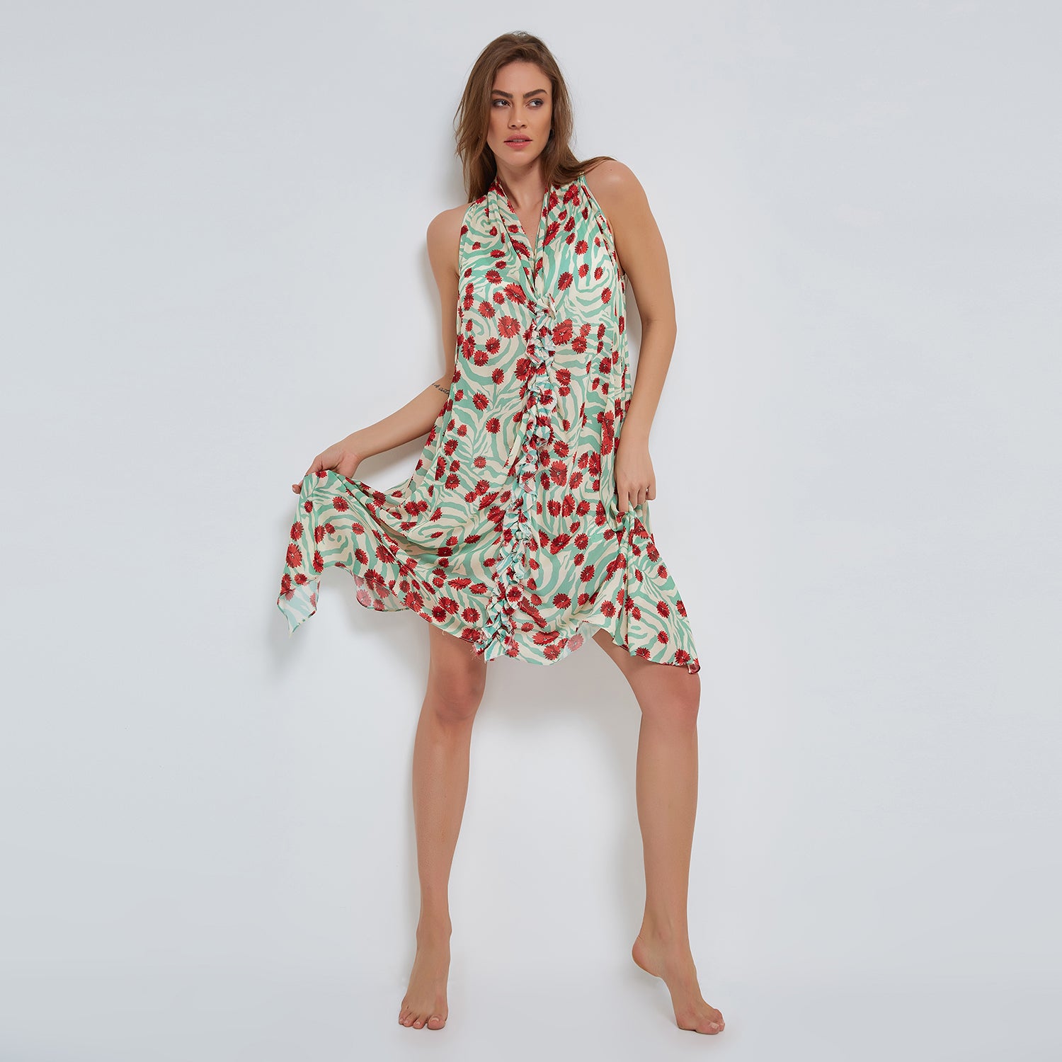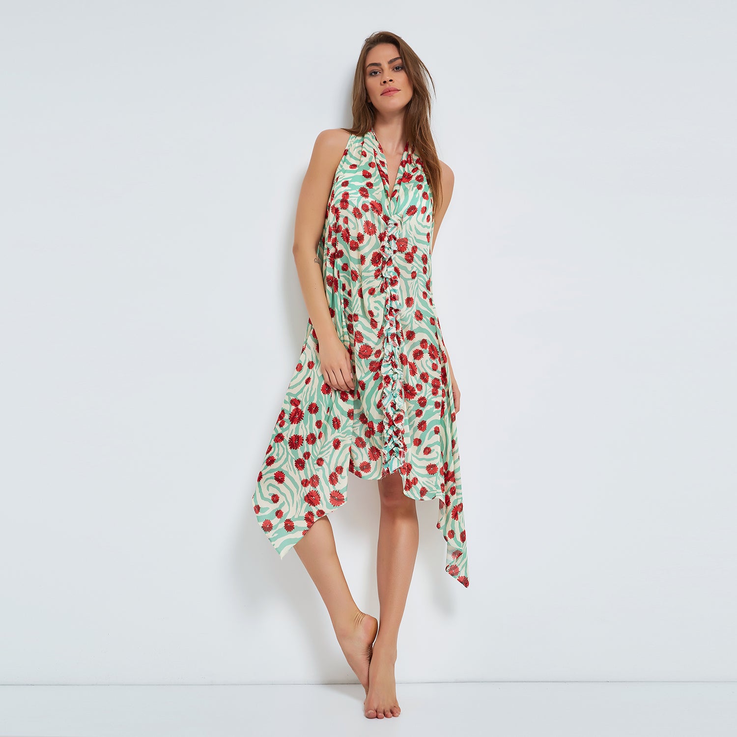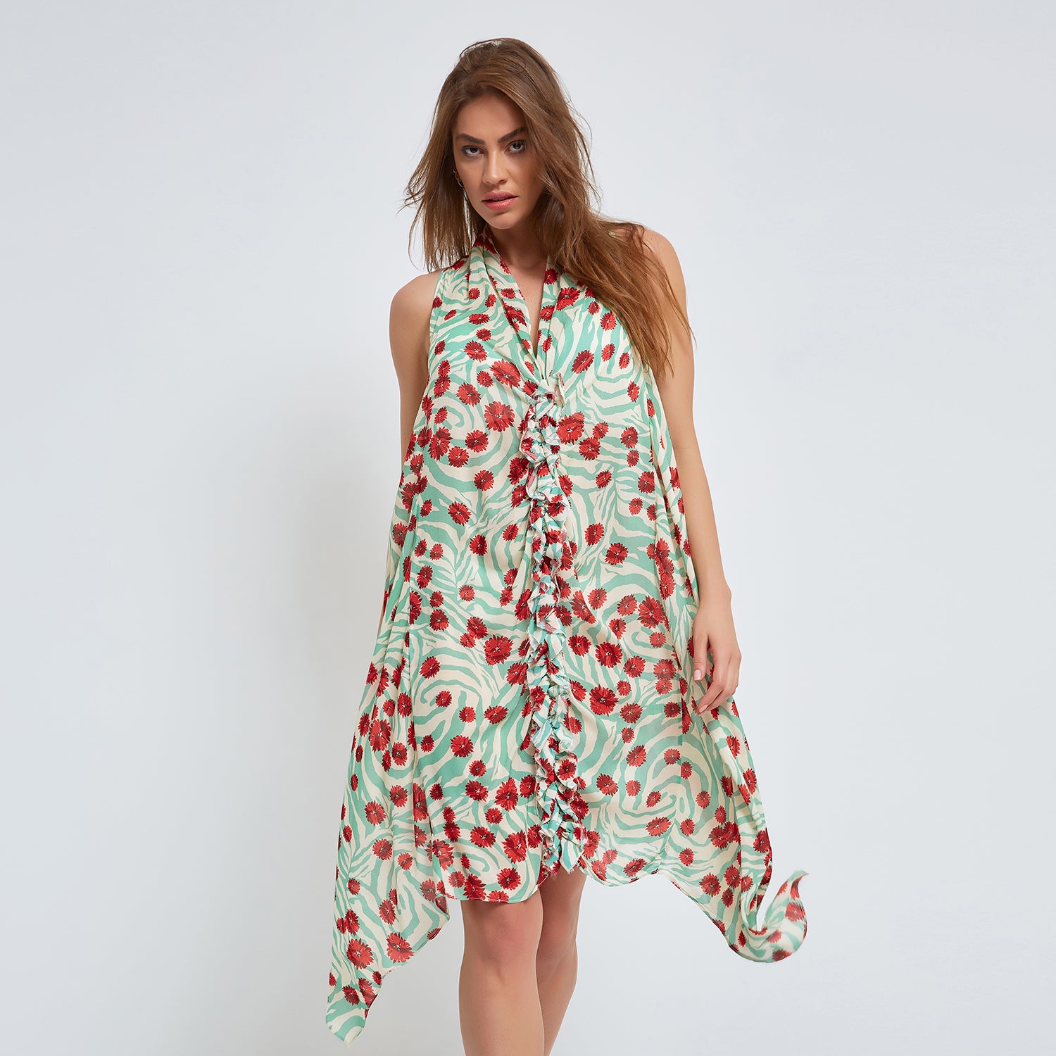 An asymmetrical dress is free flowing with seamless ruffles cascading down the front. It is a slip-on and go type of dress. It is made of the finest viscose that caresses your body. It takes you to the beach or to the city. A signature evil eye at the nape of the back in the dress will protect you from the bad luck.