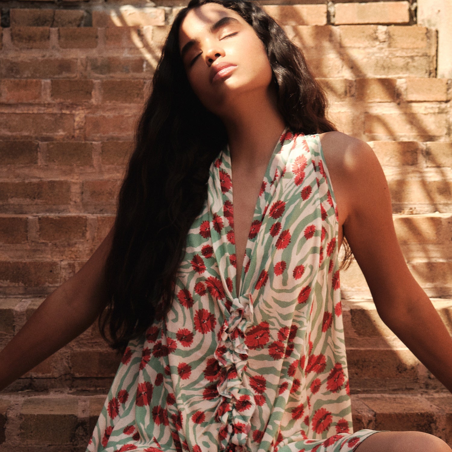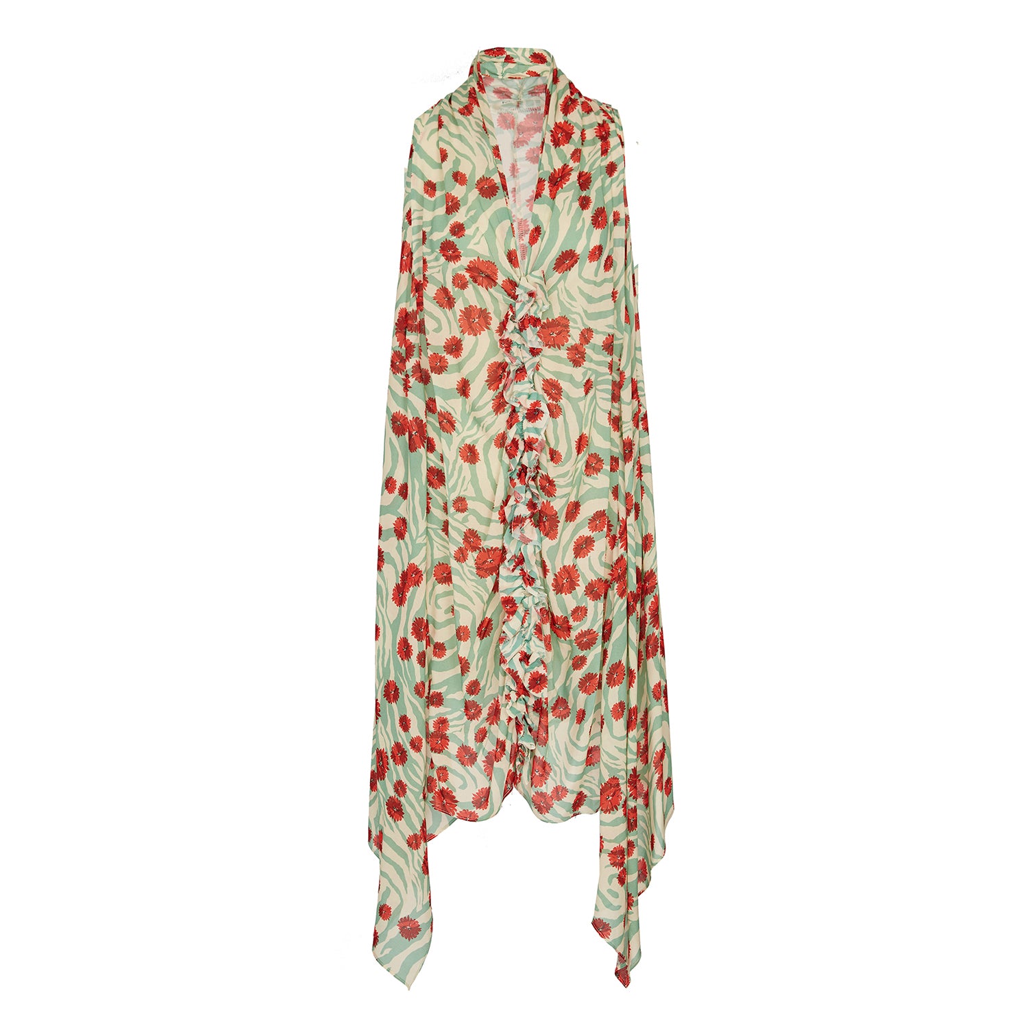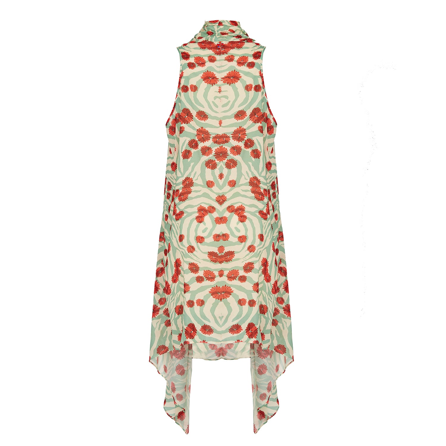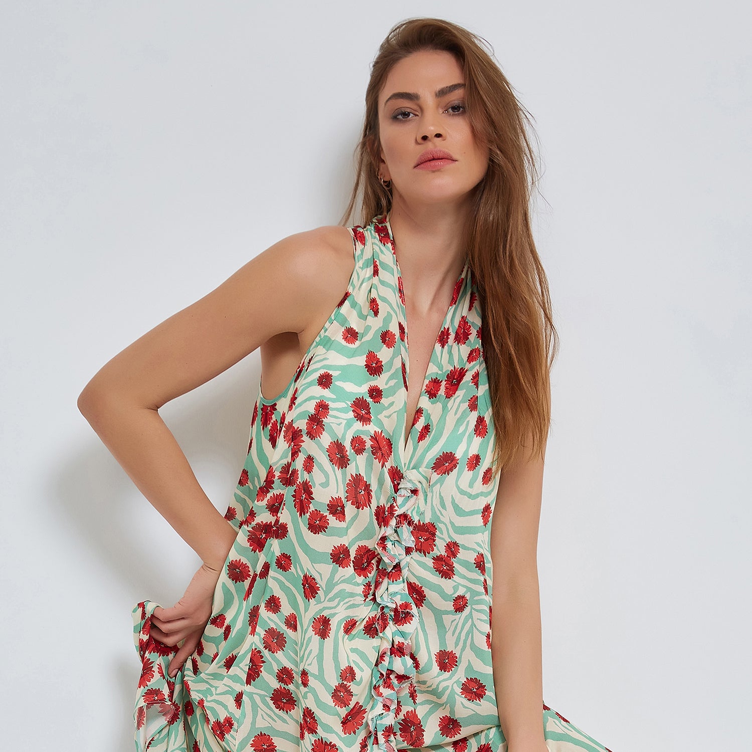 An asymmetrical dress is free flowing with seamless ruffles cascading down the front. It is a slip-on and go type of dress. It is made of the finest viscose that caresses your body. It takes you to the beach or to the city. A signature evil eye at the nape of the back in the dress will protect you from the bad luck.