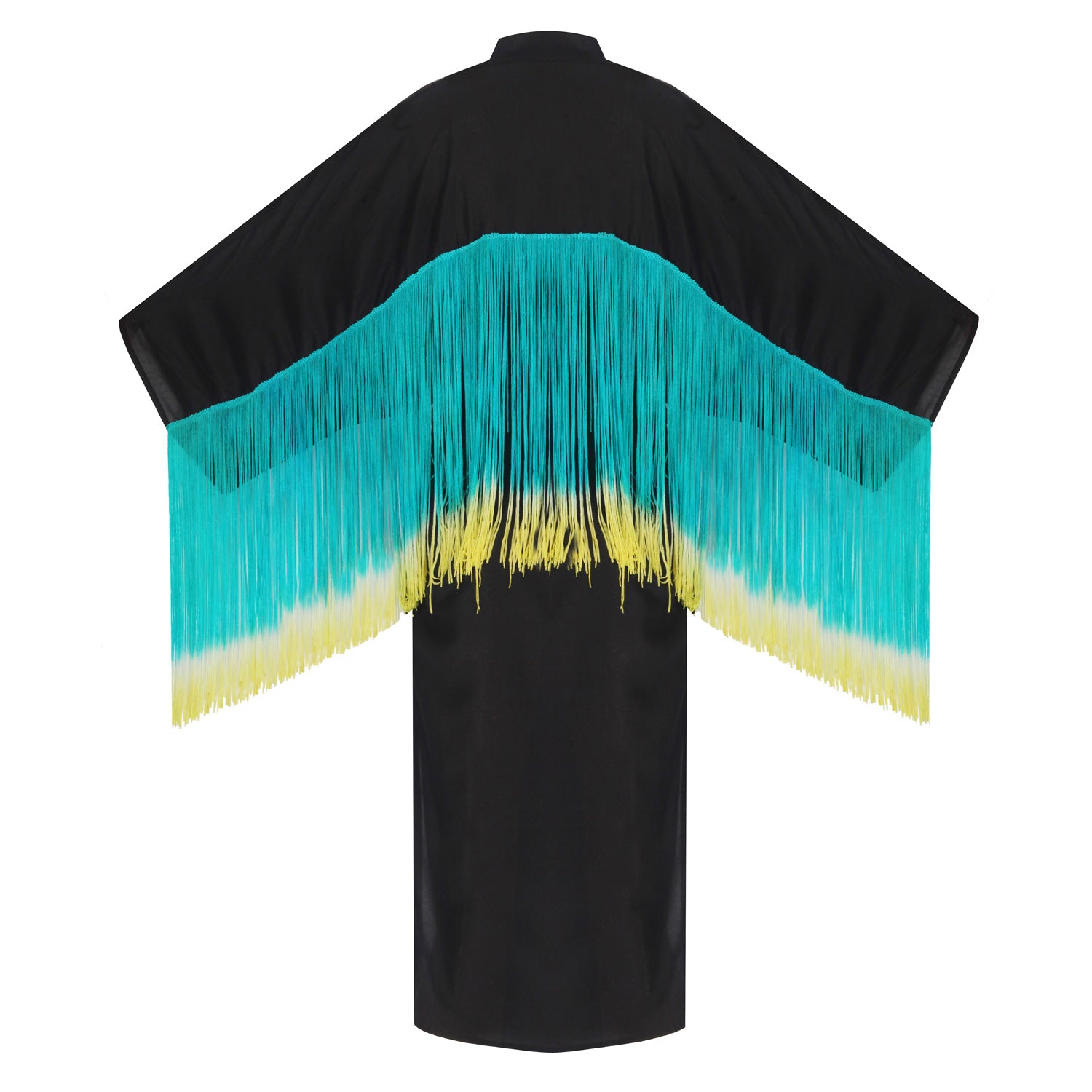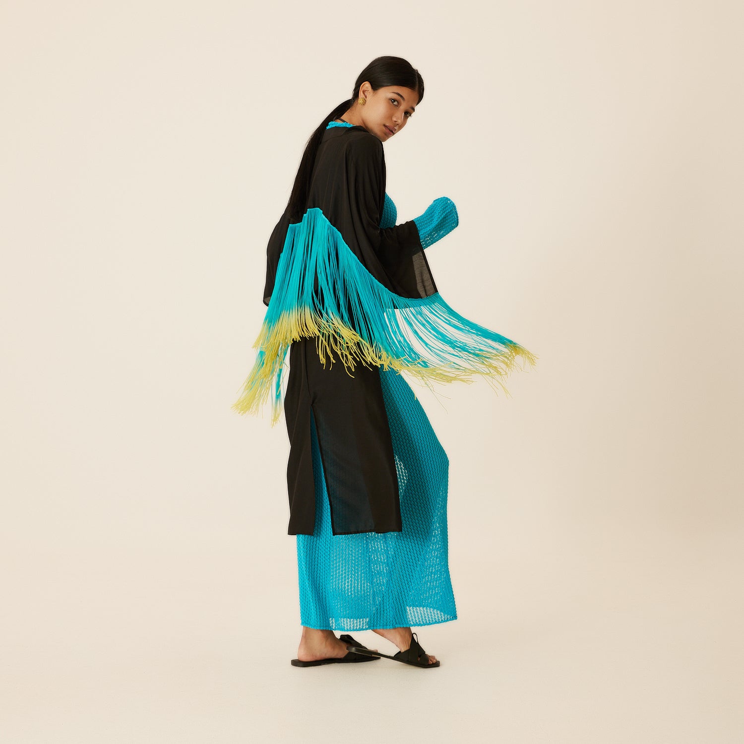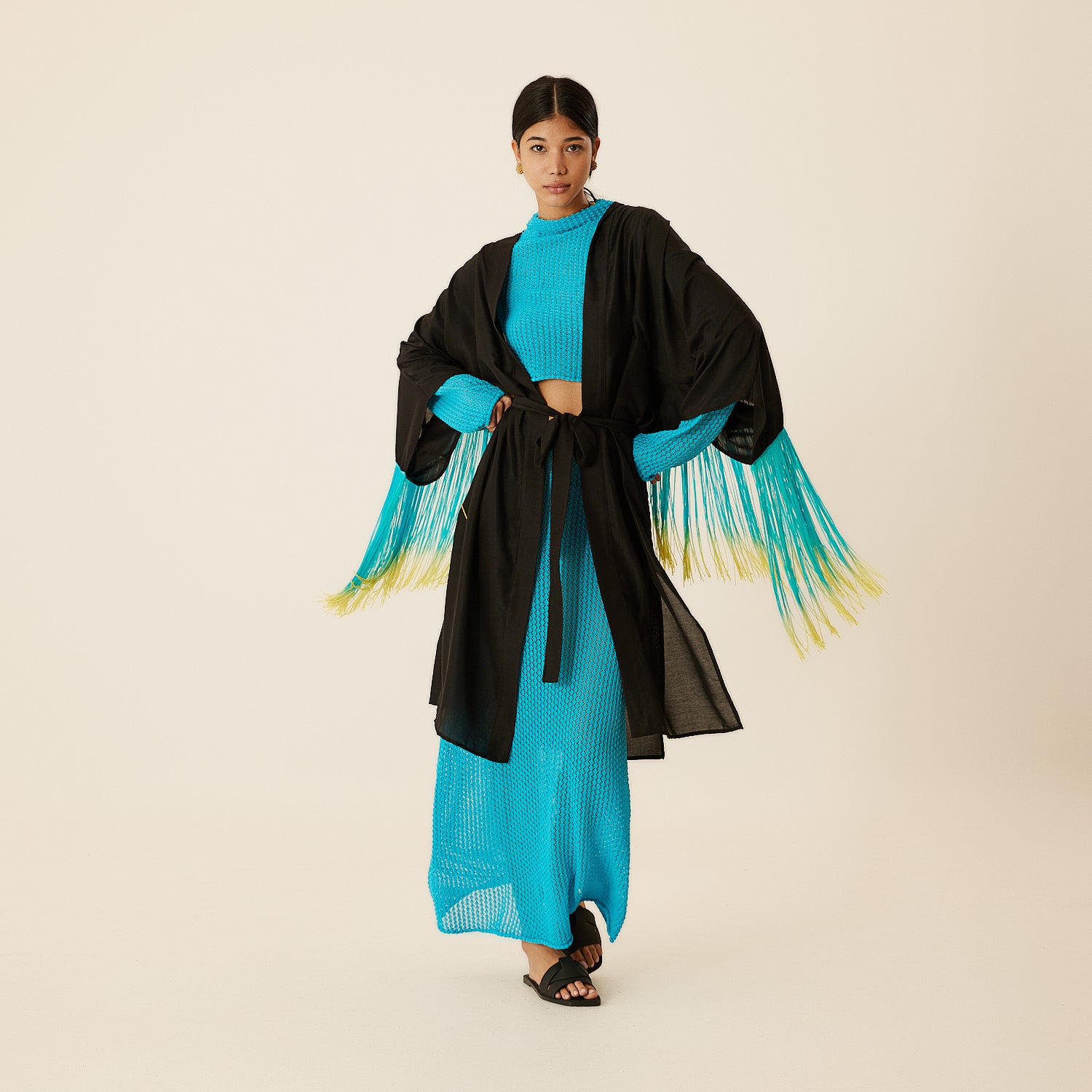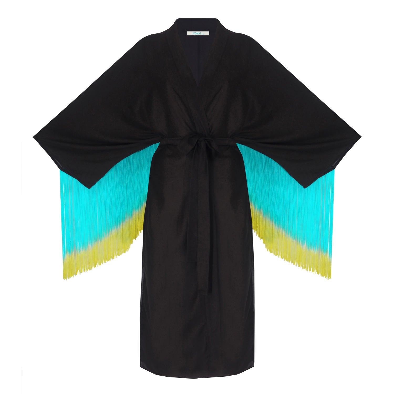 This organic cotton fringed kaftan is ALIVE! Experience its vibrant energy. It comes with a belt. Can be worn at the beach or complete your outfit for the party. Carrying the signature Evil Eye of N’ONAT in the back of the neck to protect you from bad luck.
