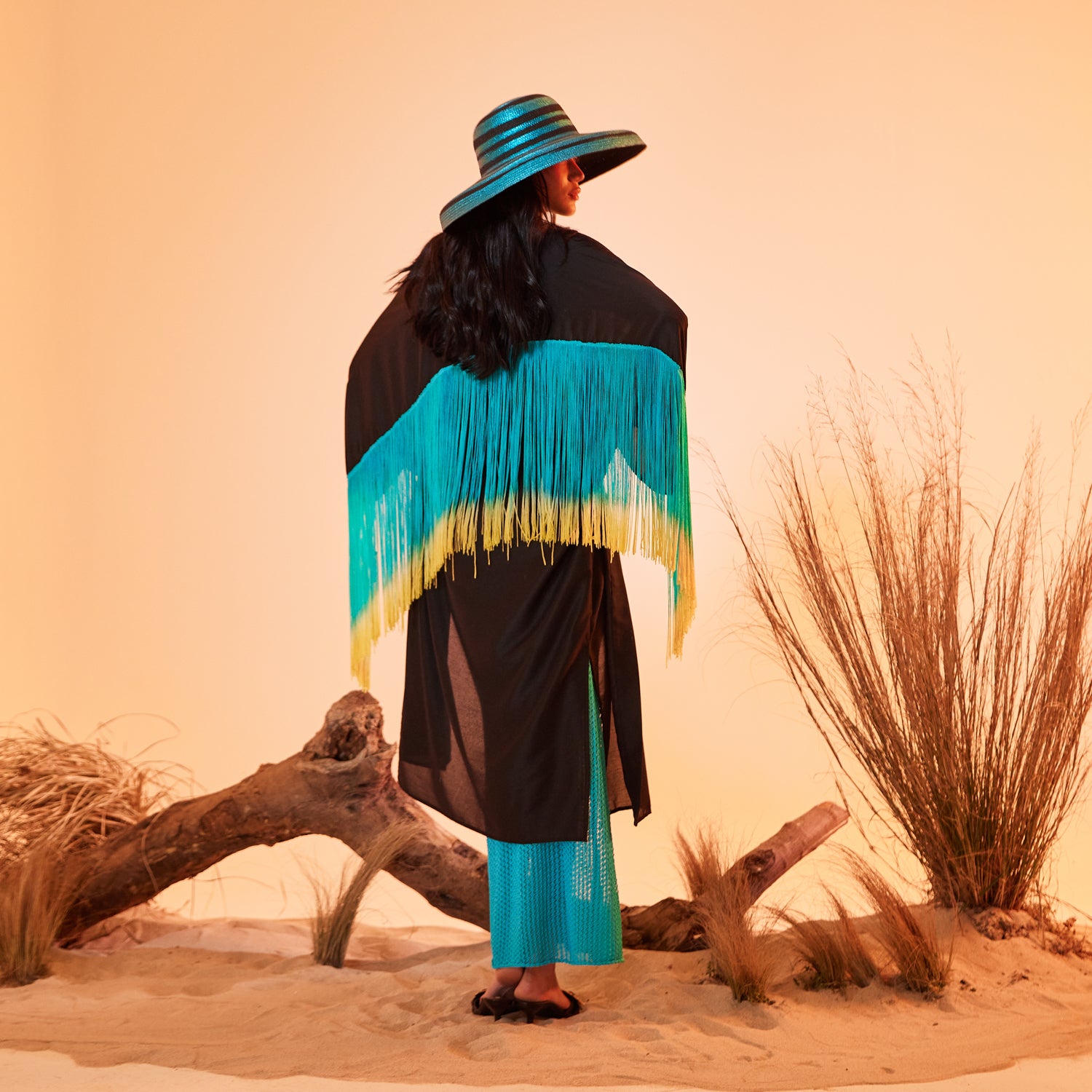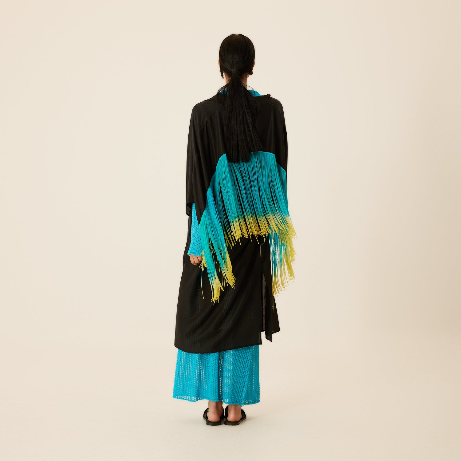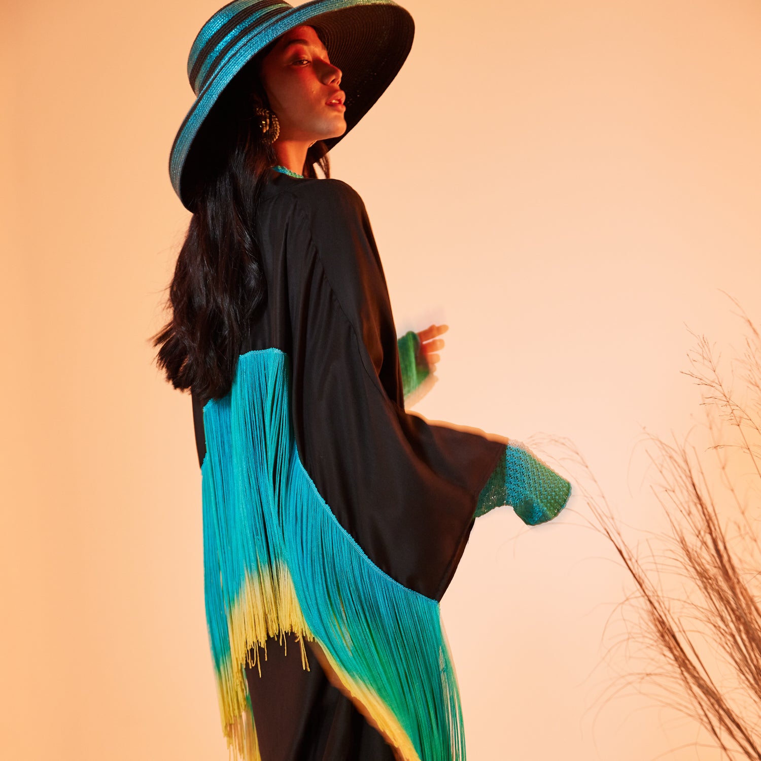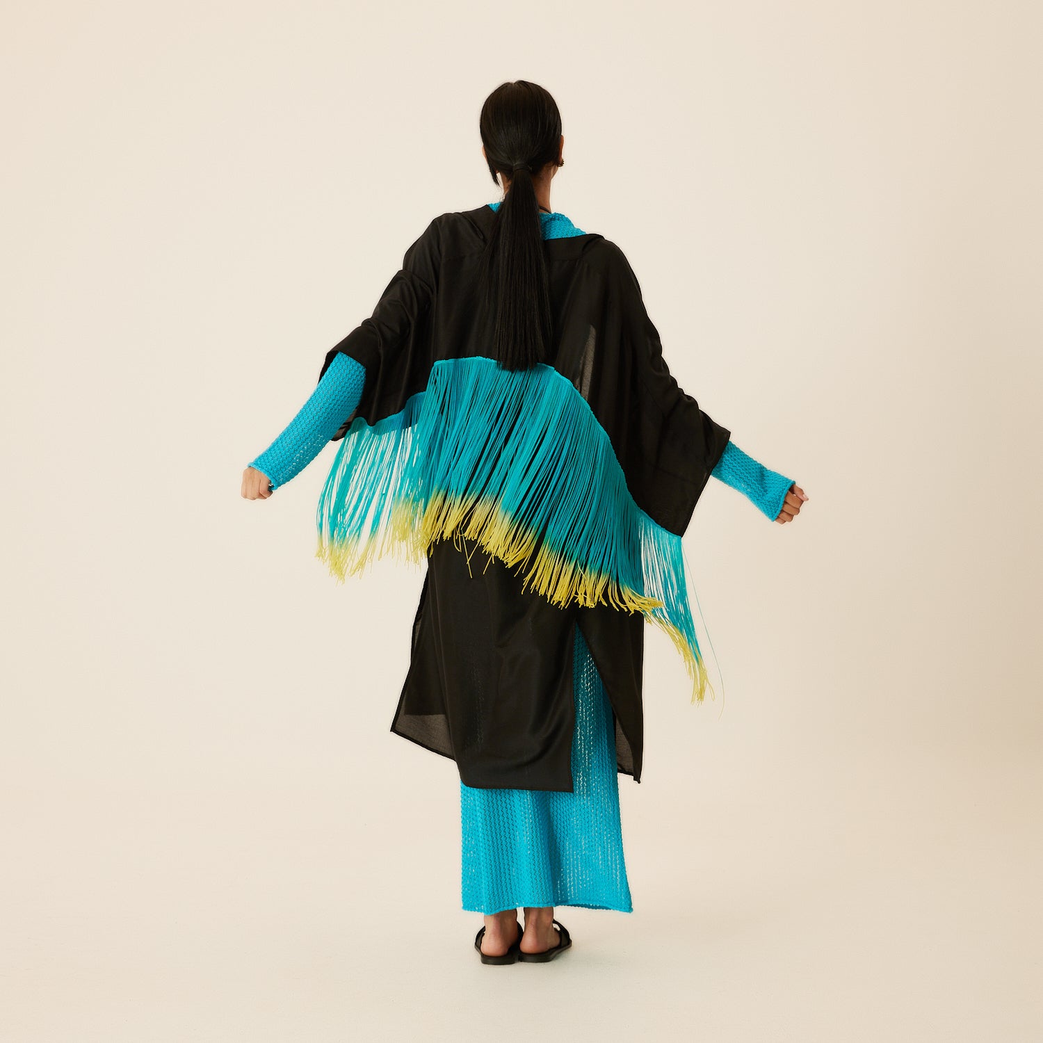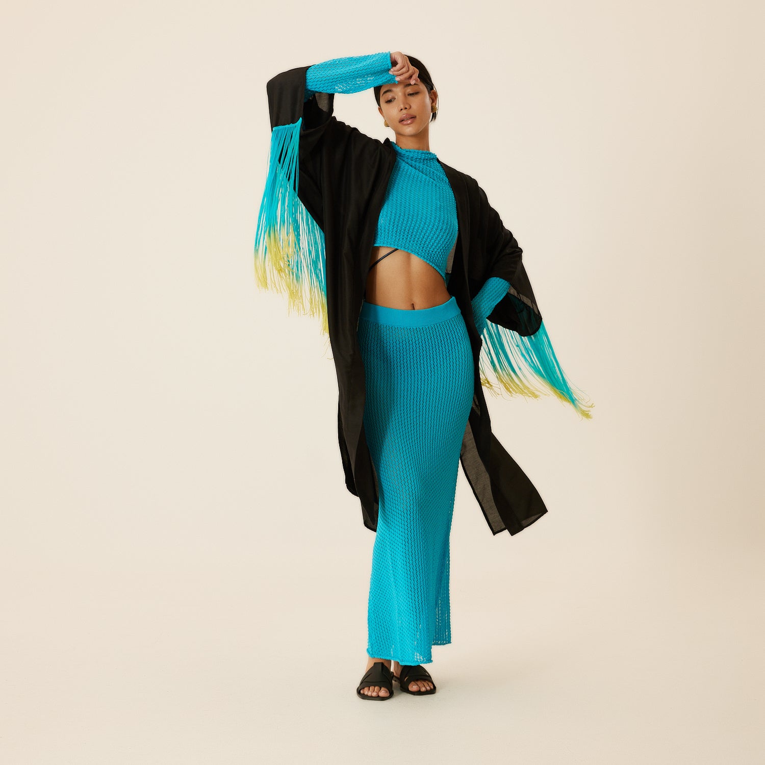 This organic cotton fringed kaftan is ALIVE! Experience its vibrant energy. It comes with a belt. Can be worn at the beach or complete your outfit for the party. Carrying the signature Evil Eye of N’ONAT in the back of the neck to protect you from bad luck.