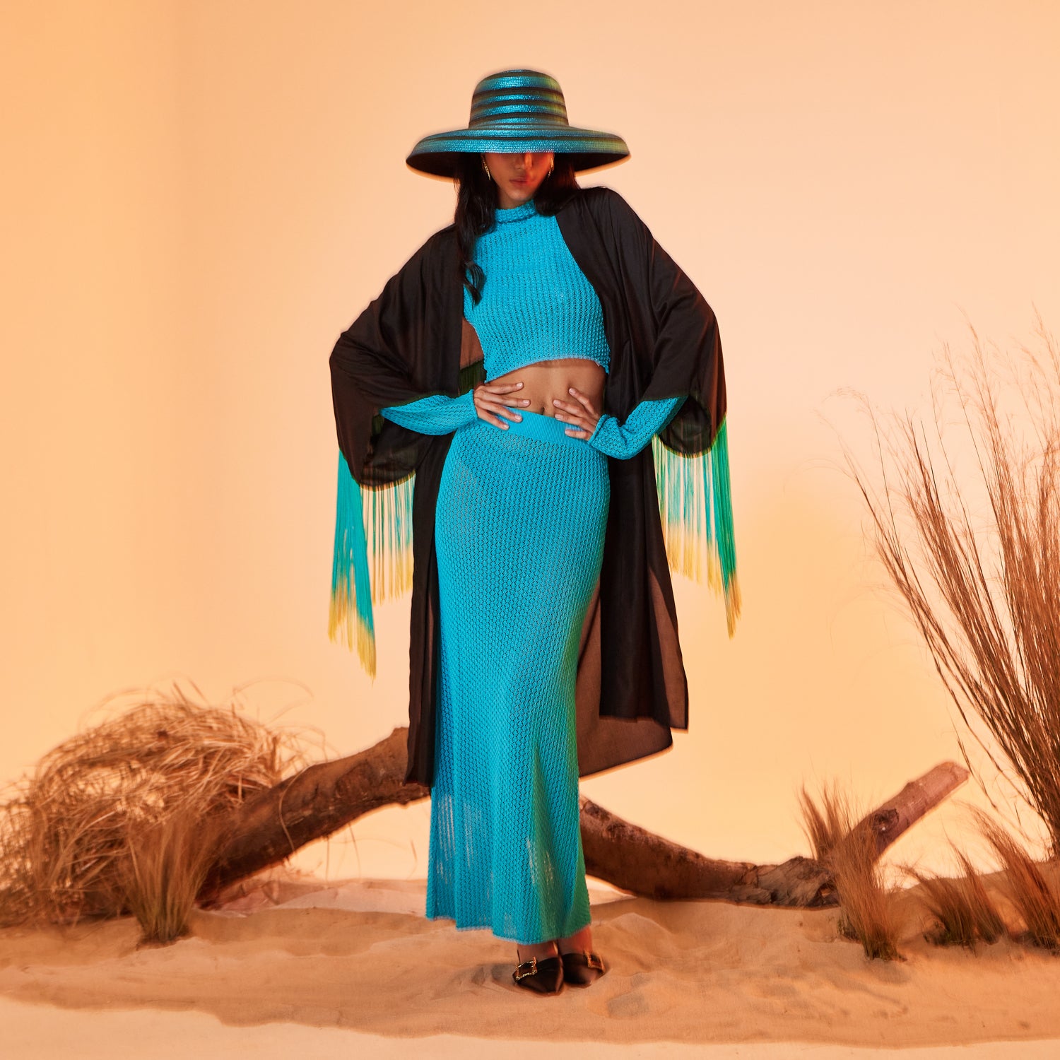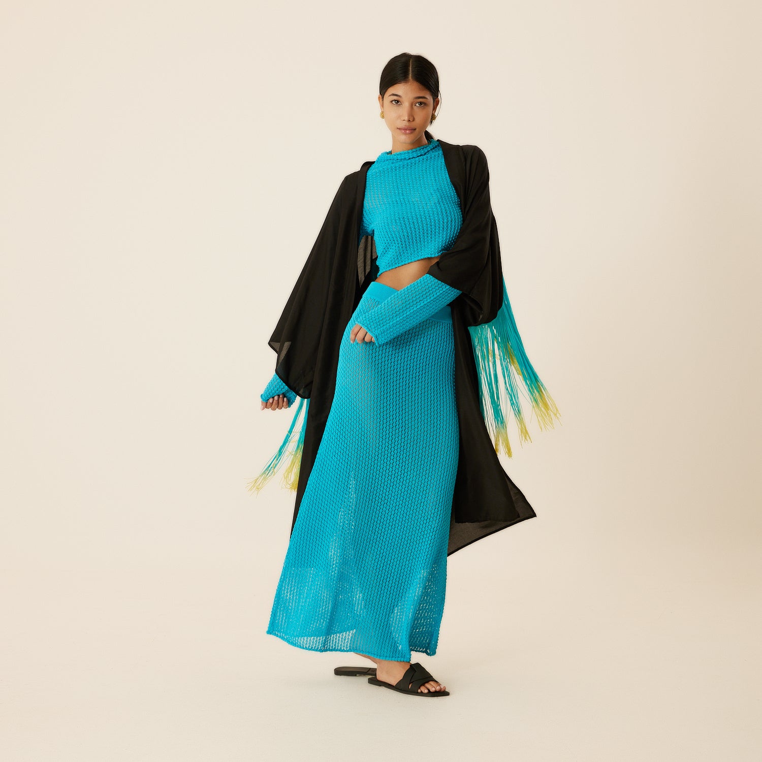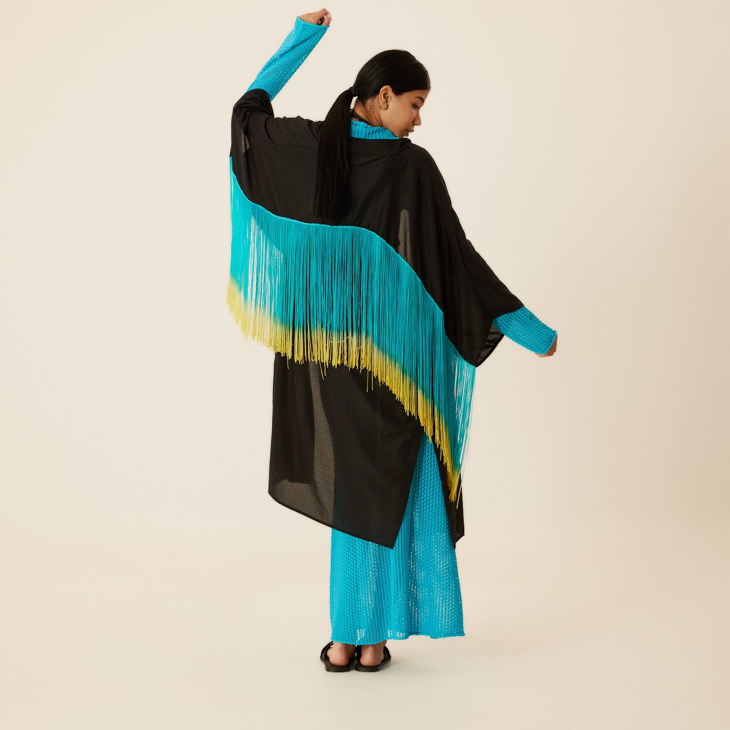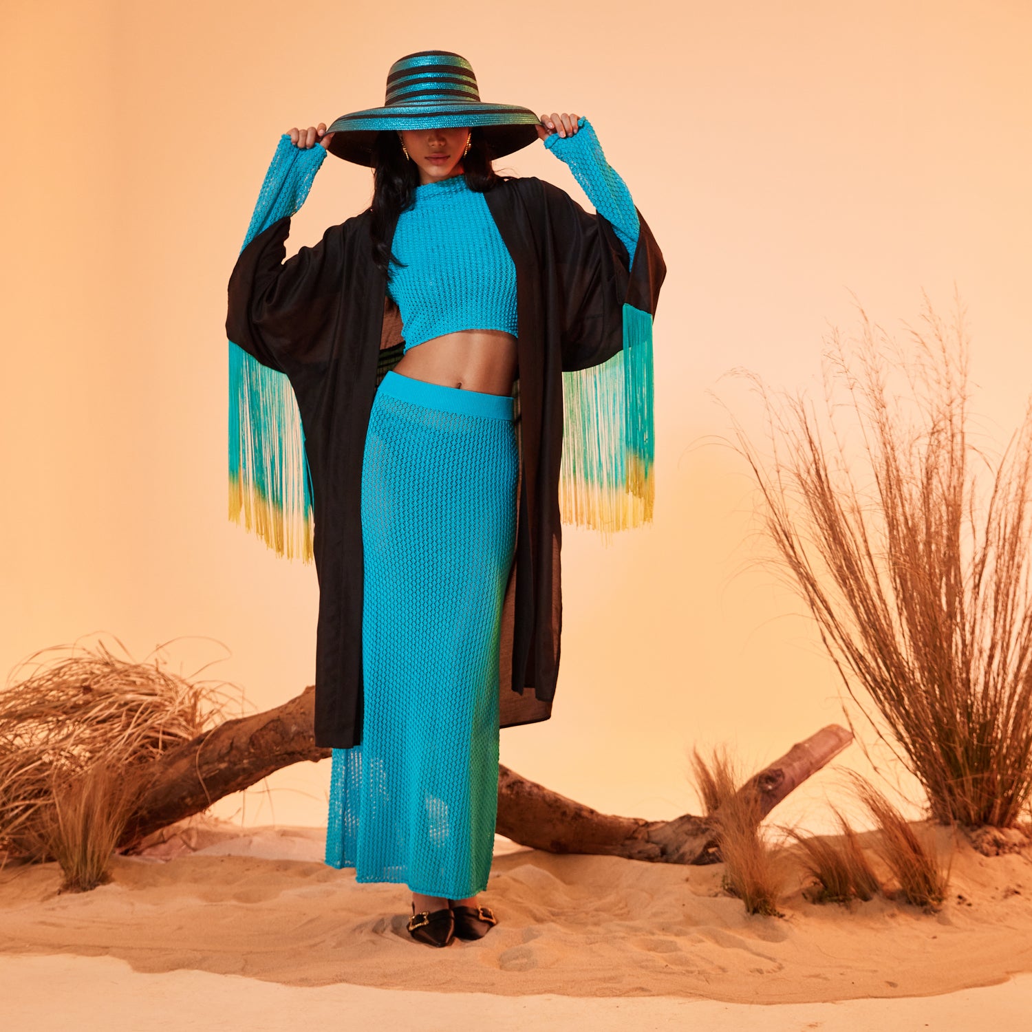 This organic cotton fringed kaftan is ALIVE! Experience its vibrant energy. It comes with a belt. Can be worn at the beach or complete your outfit for the party. Carrying the signature Evil Eye of N’ONAT in the back of the neck to protect you from bad luck.