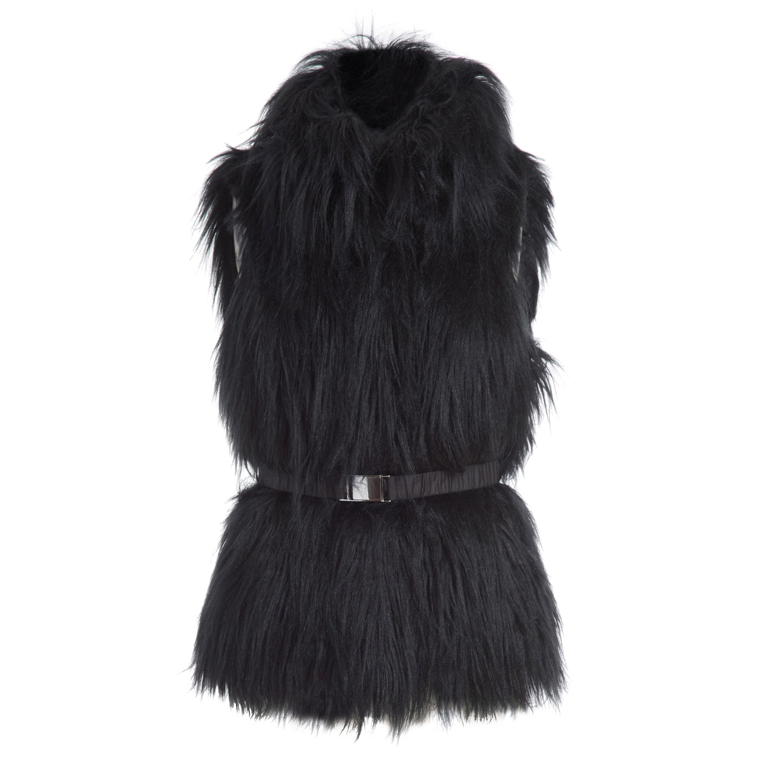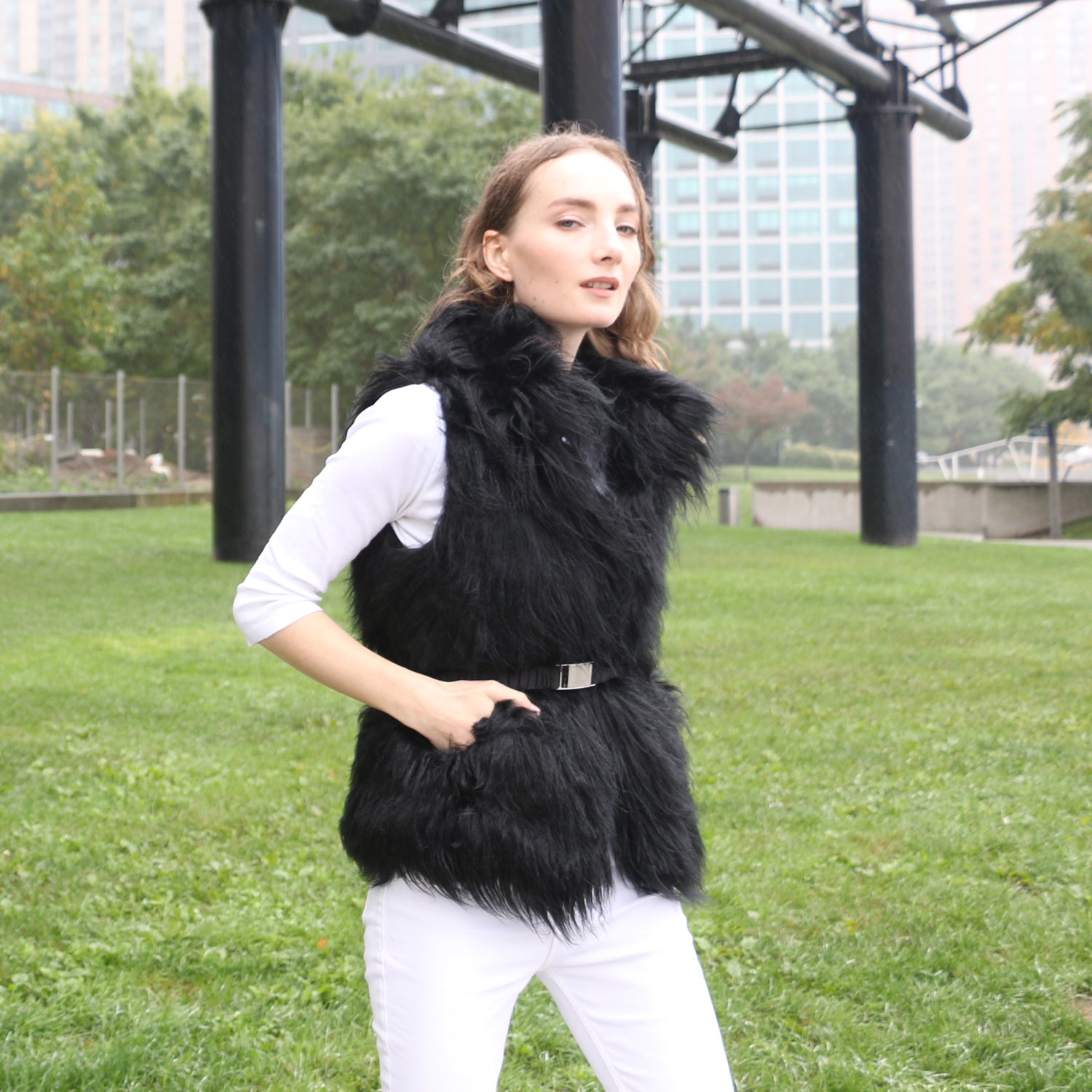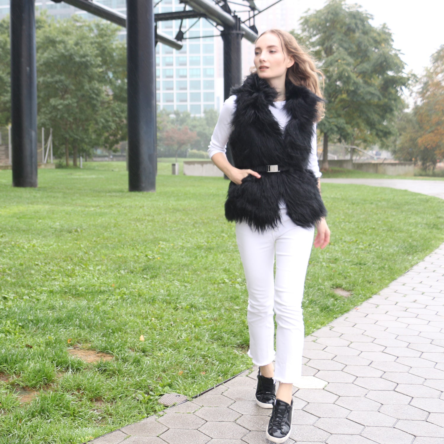 The perfect “couture layer” is here – this white faux fur vest delivers versatility in styling across your wardrobe from day to evening. The perfect piece to dress up any outfit! The vest has a ribbon waist sash and hidden front hand pockets.