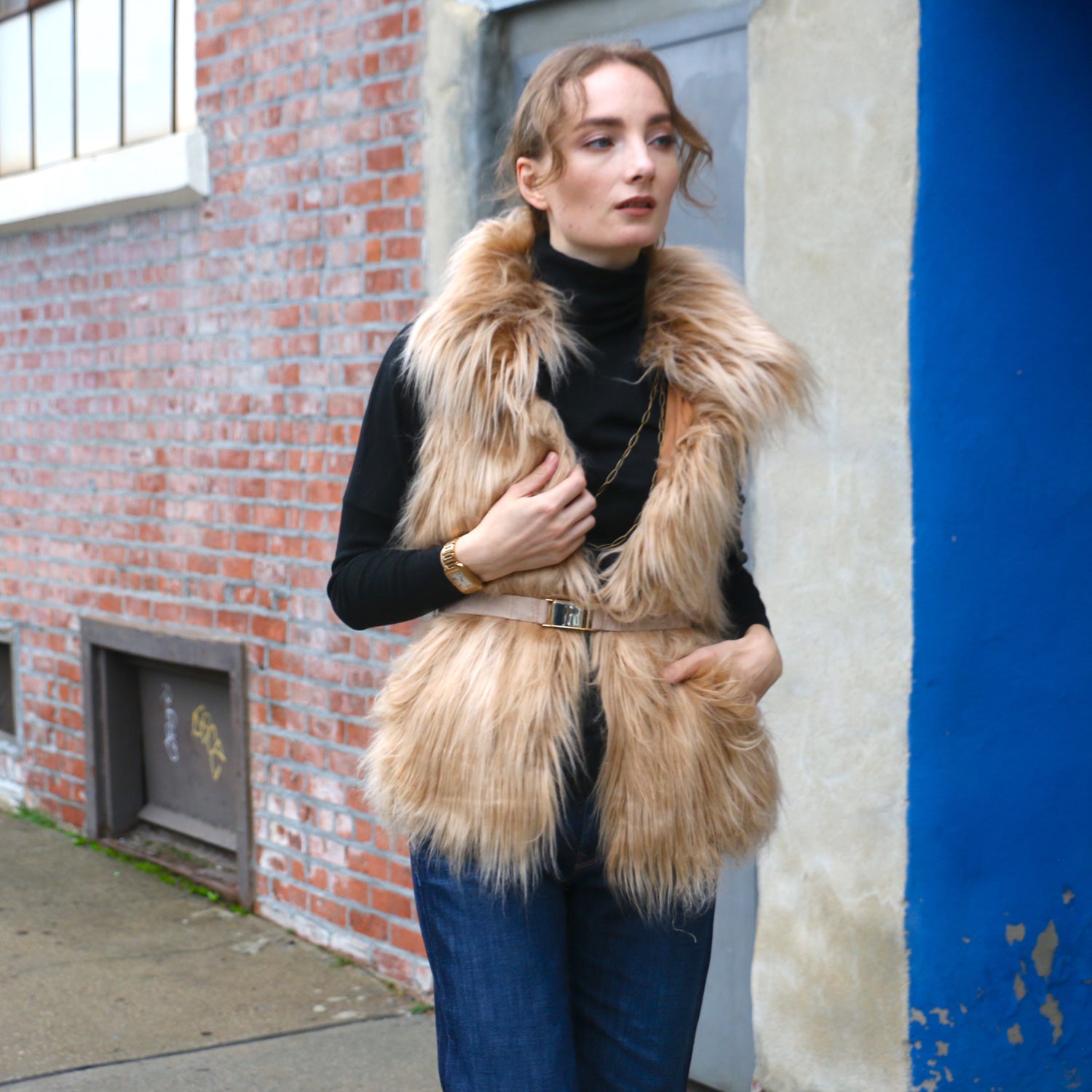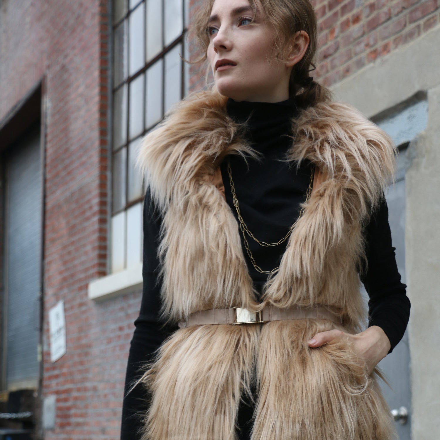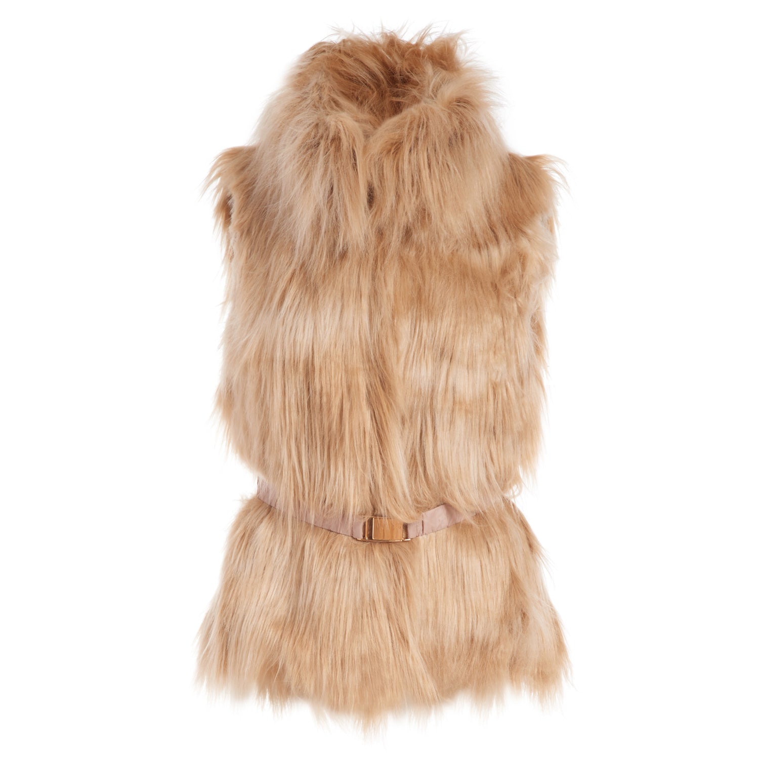 The perfect “couture layer” is here – this white faux fur vest delivers versatility in styling across your wardrobe from day to evening. The perfect piece to dress up any outfit! The vest has a ribbon waist sash and hidden front hand pockets.