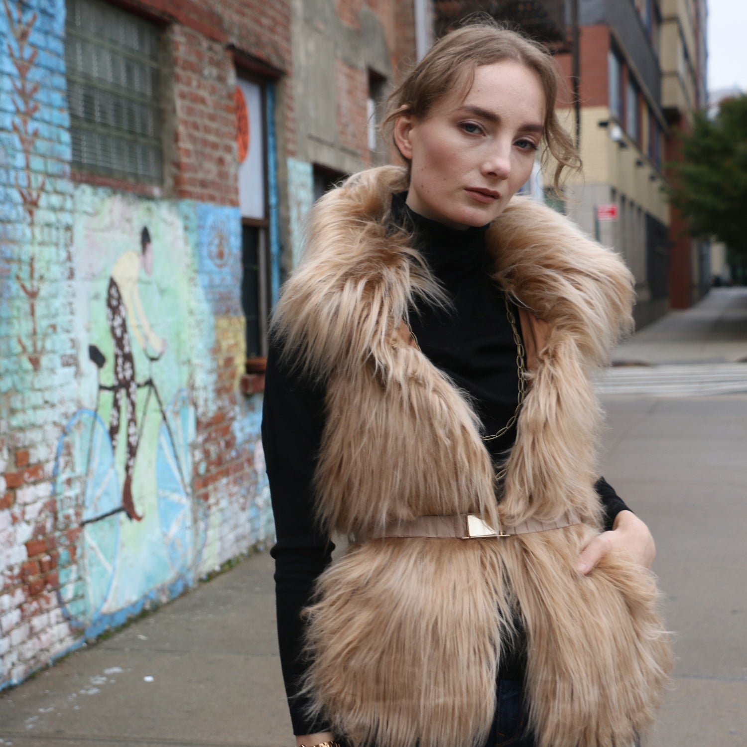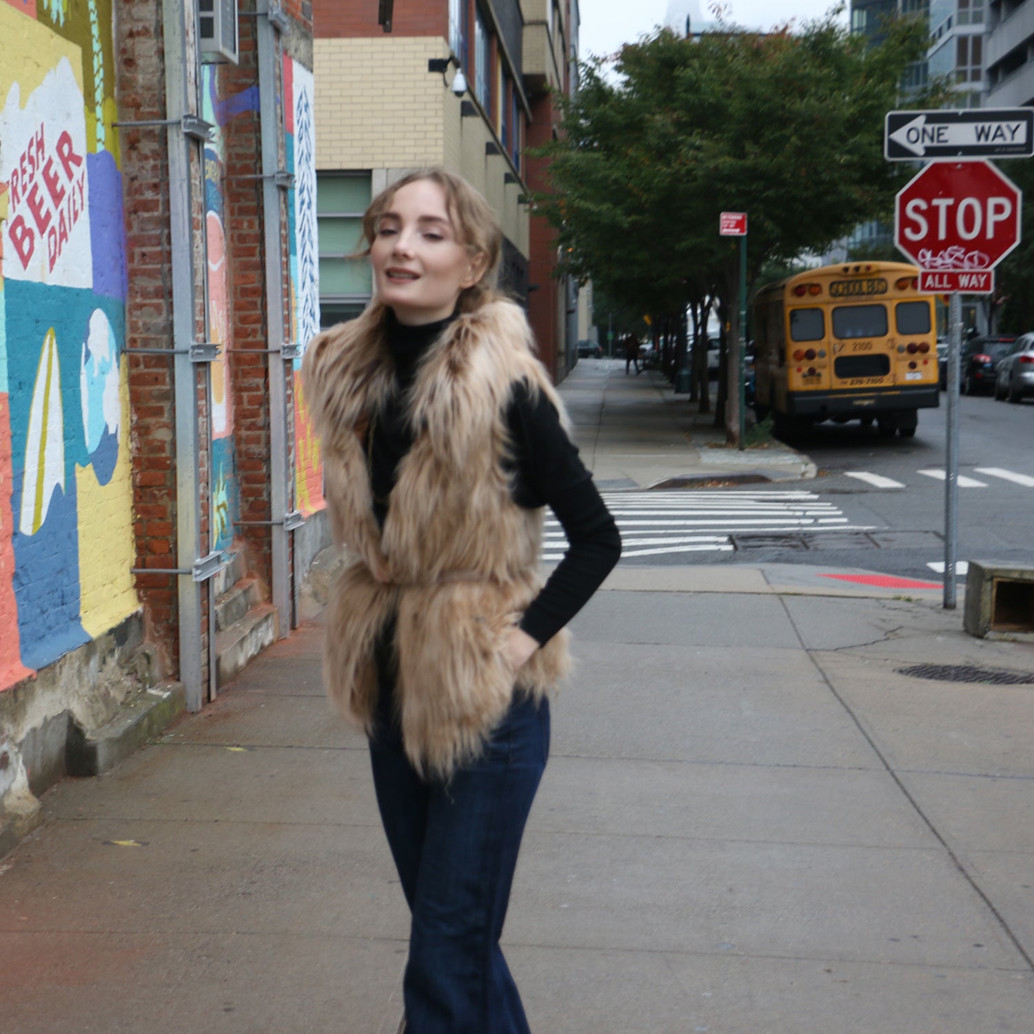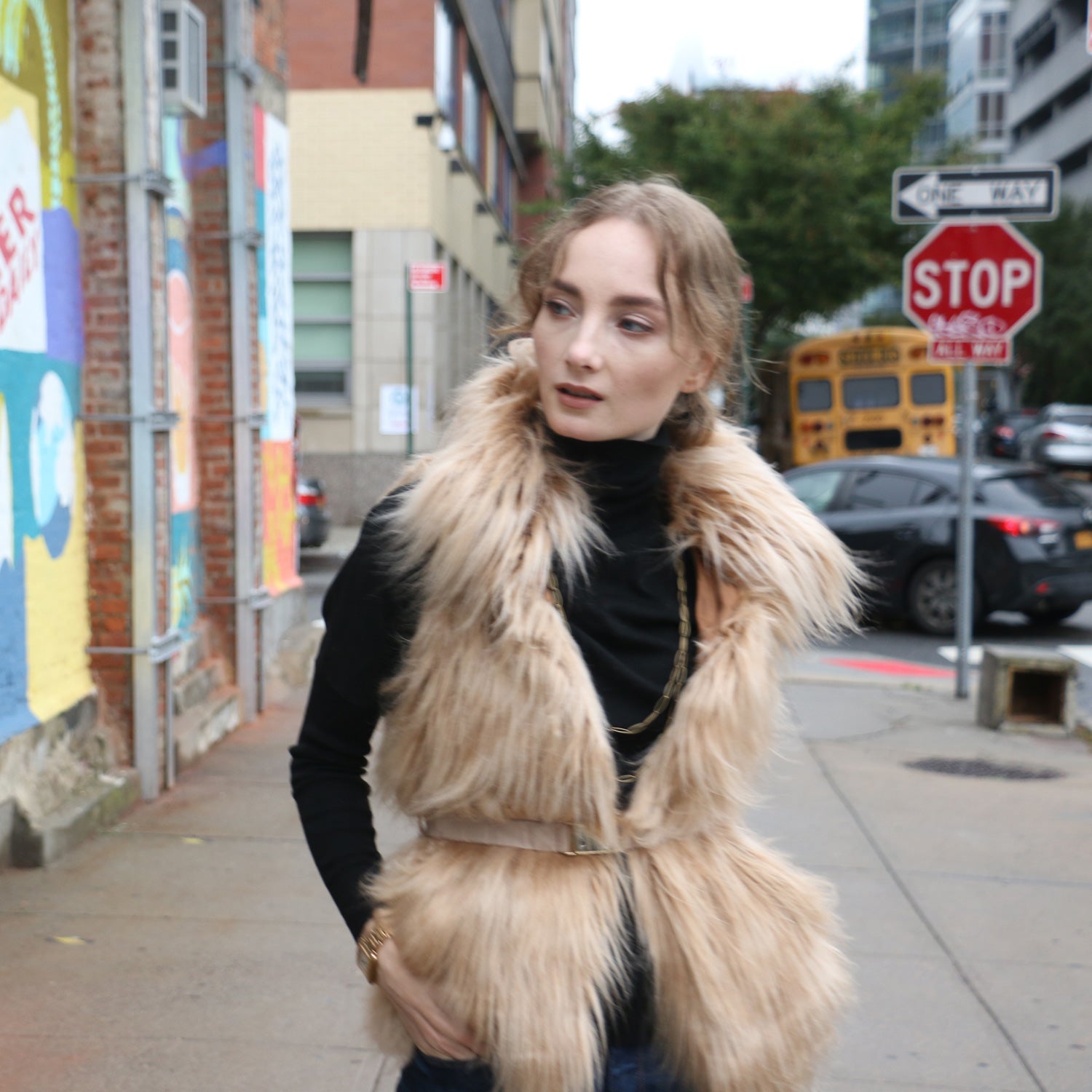 The perfect “couture layer” is here – this white faux fur vest delivers versatility in styling across your wardrobe from day to evening. The perfect piece to dress up any outfit! The vest has a ribbon waist sash and hidden front hand pockets.