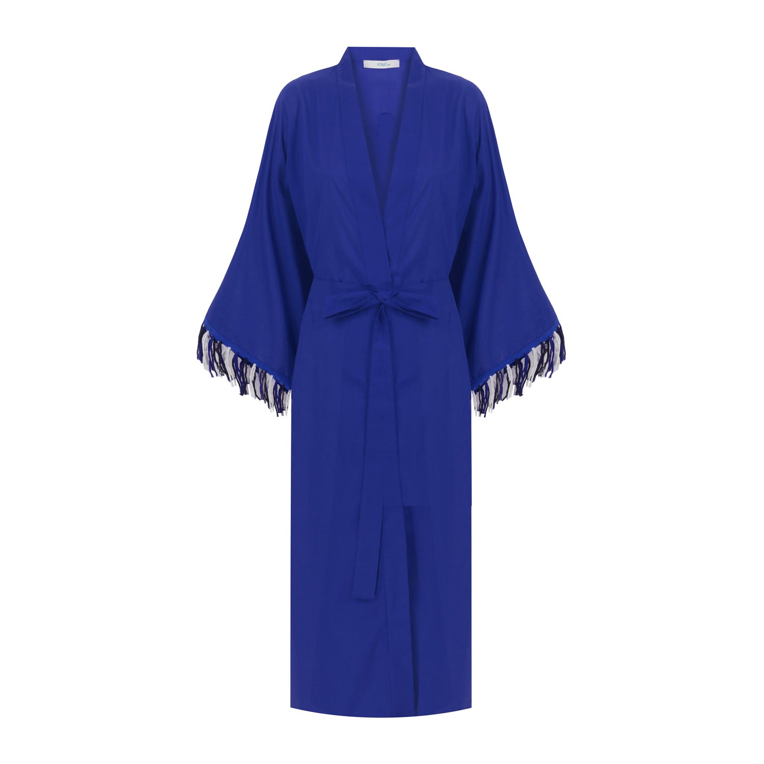 This organic cotton kaftan carries a hand-crocheted “Hamsa” hand –an ancient symbol that is believed to bring its owner happiness, luck, health, and good fortune. It comes with a belt and the sleeves are hand finished with fringe & bells which creates a moment of fun every move you make. You will be very chic and eye catching with this light and comfortable organic cotton kaftan at the beach.