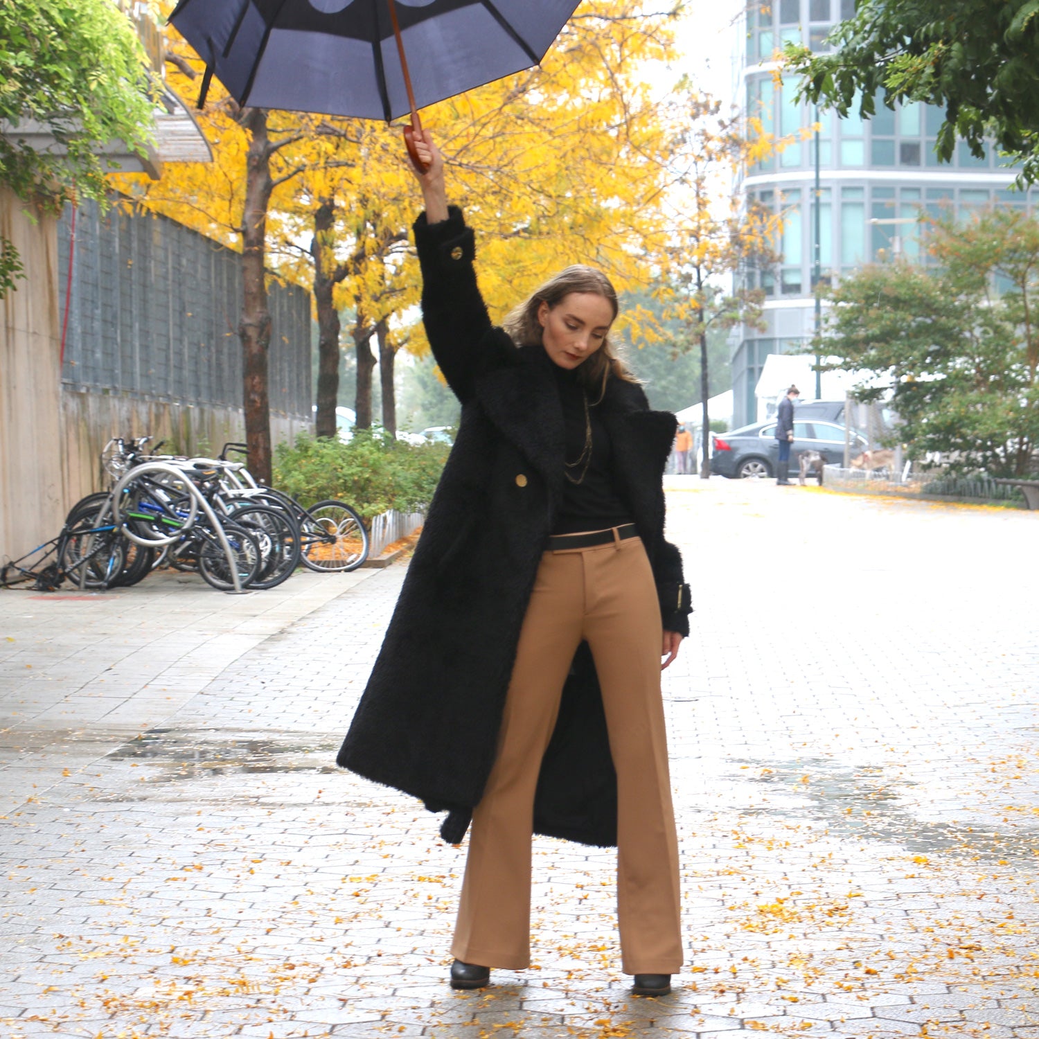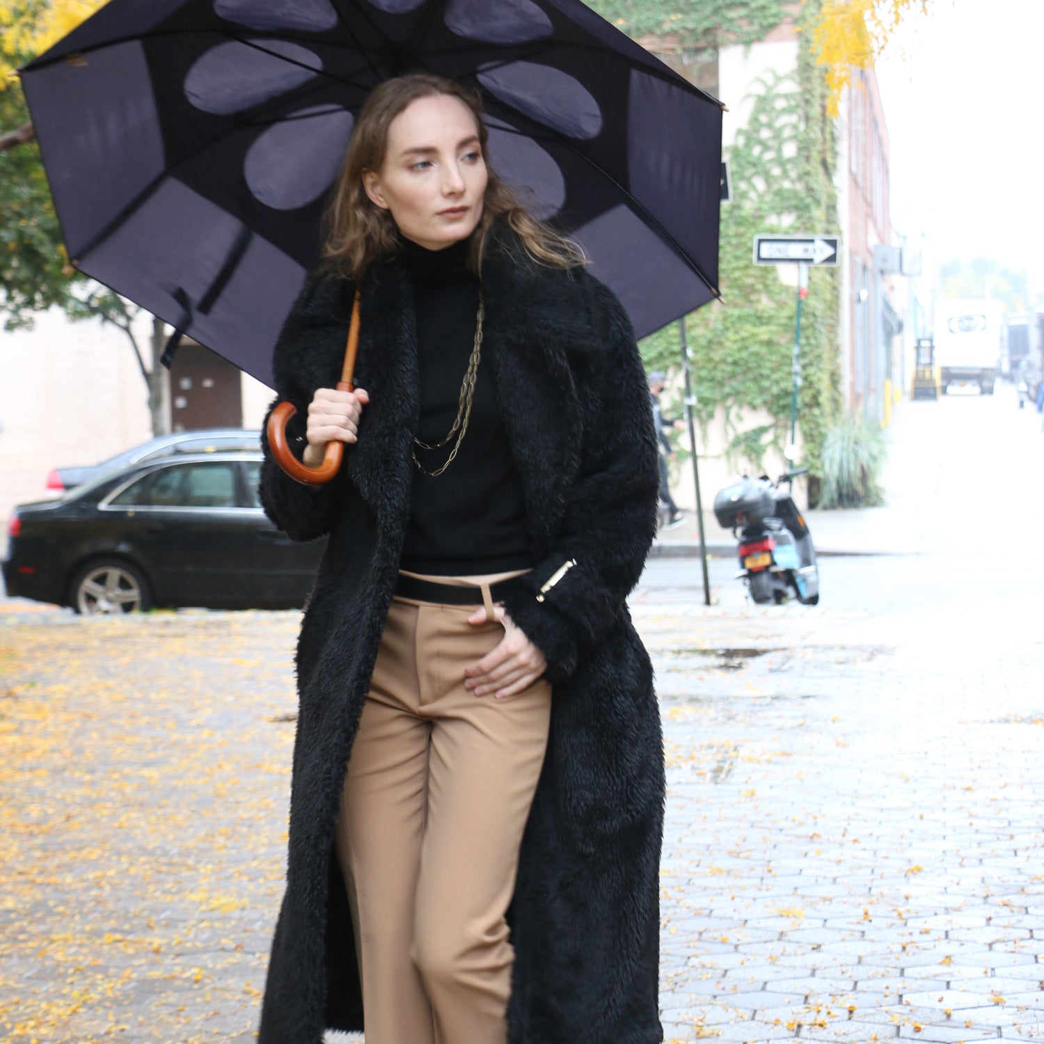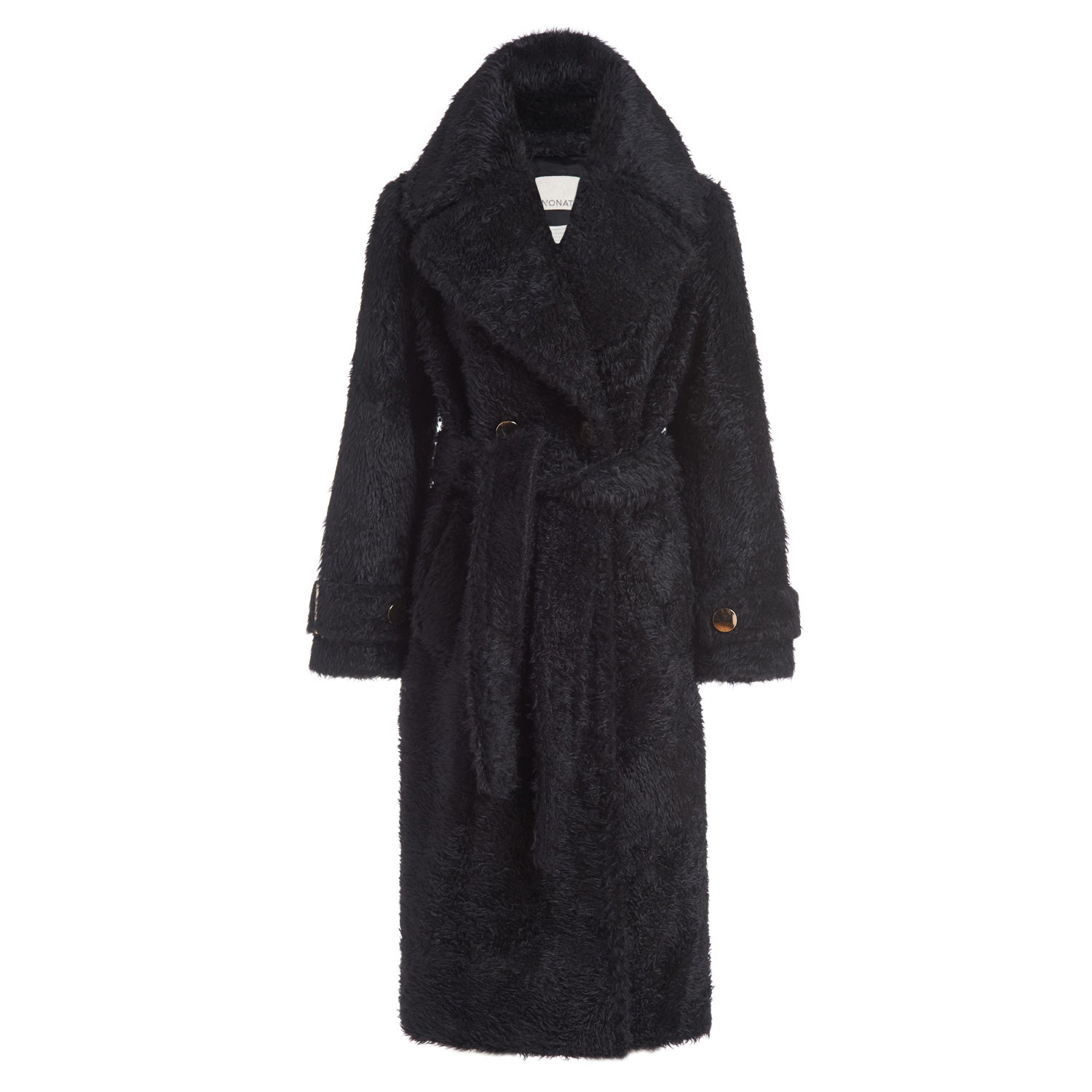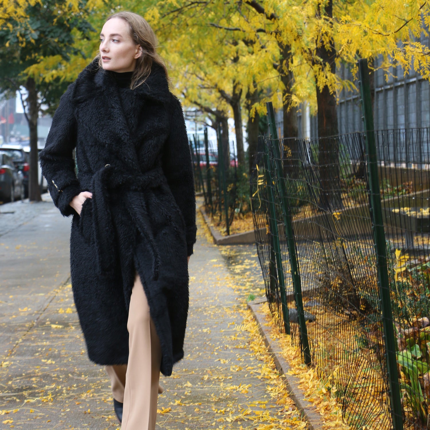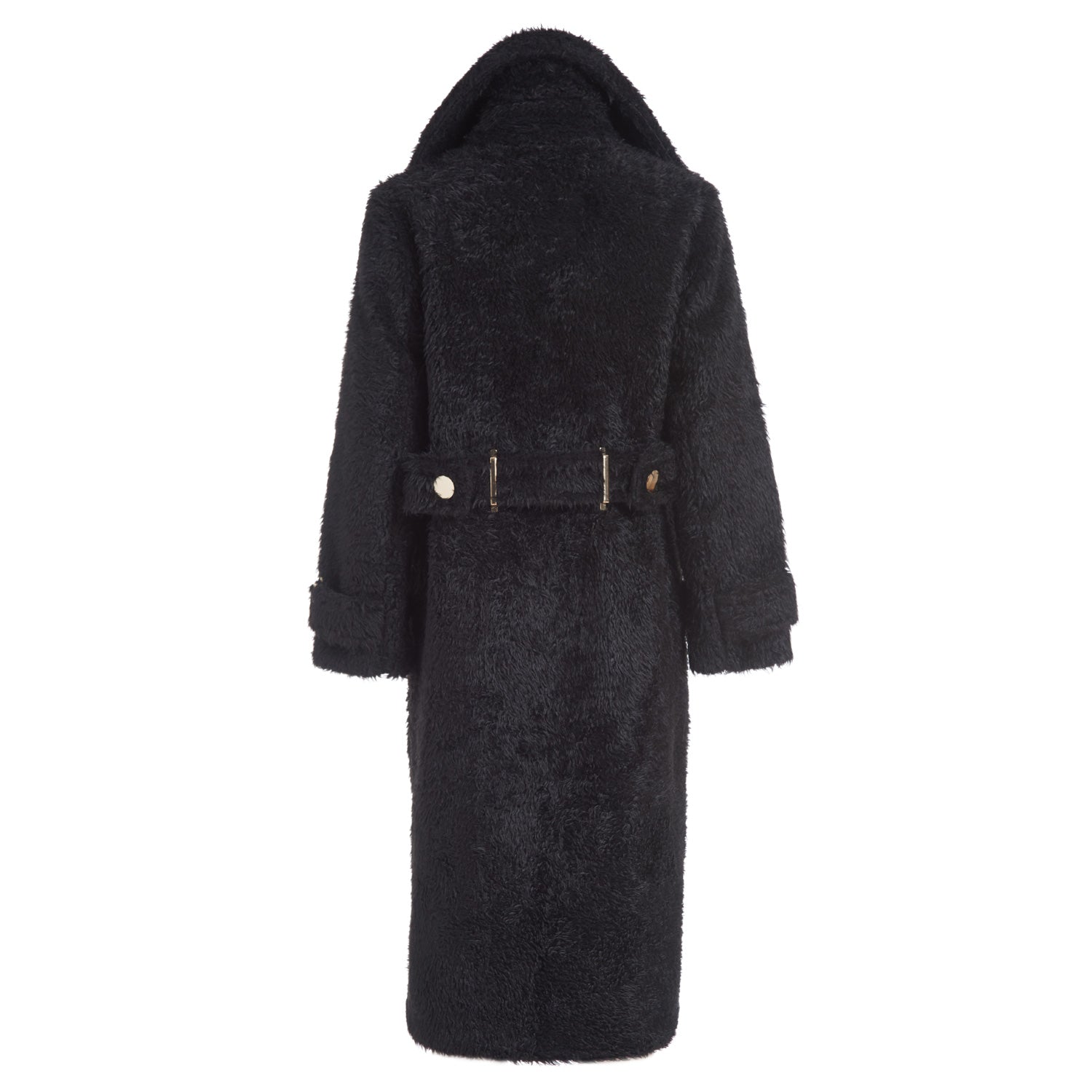 Empower yourself with our double breasted coat in rich textured faux fur with gold buttons, detachable waist belt, notched collar and wrist band detail. Fabric is made from eco-friendly recycled material.
