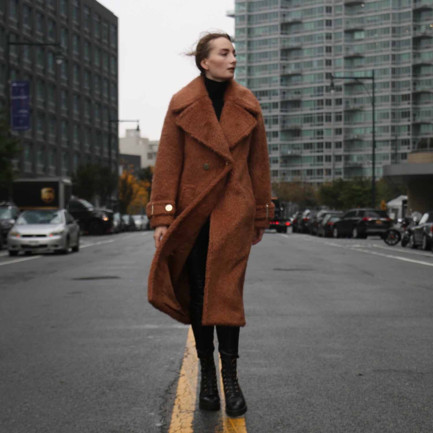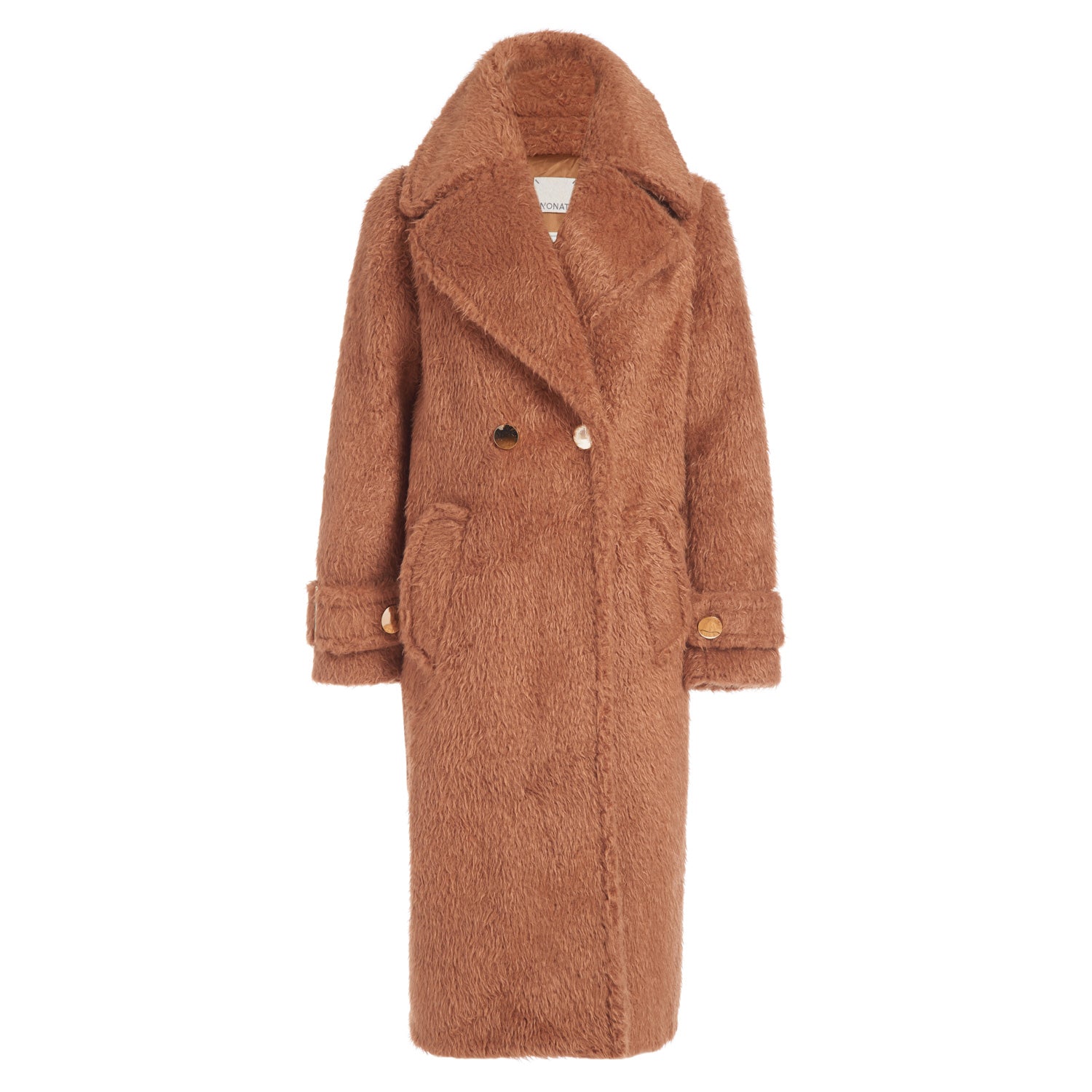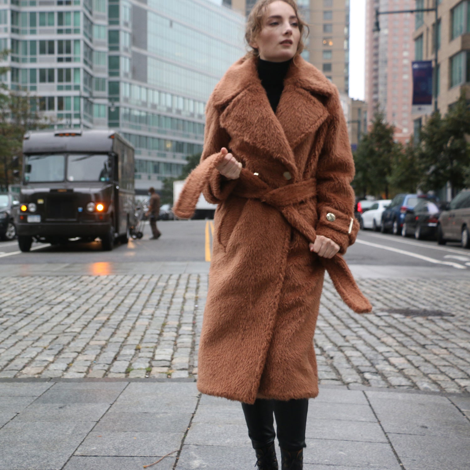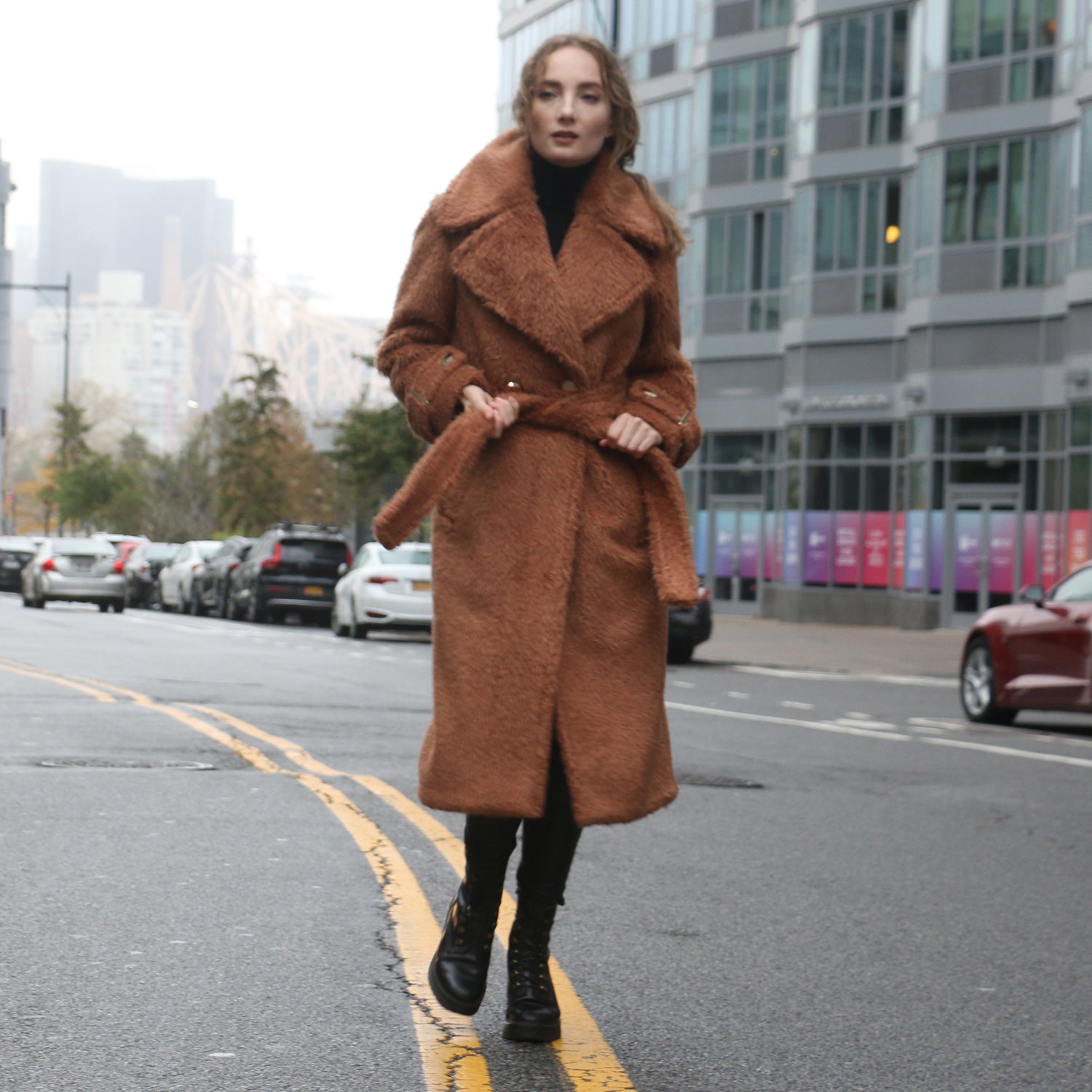 Empower yourself with our double breasted coat in rich textured faux fur with gold buttons, detachable waist belt, notched collar and wrist band detail. Fabric is made from eco-friendly recycled material.