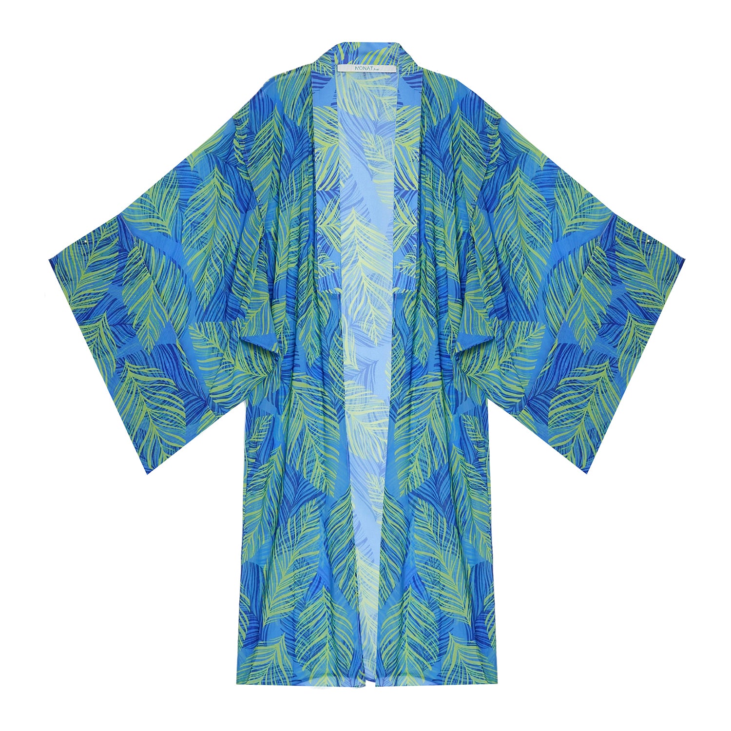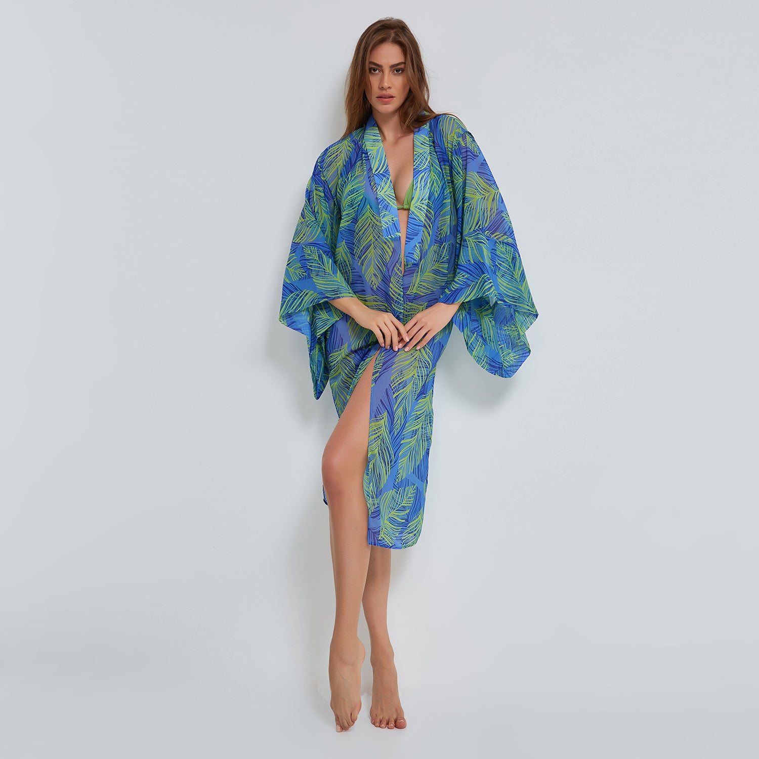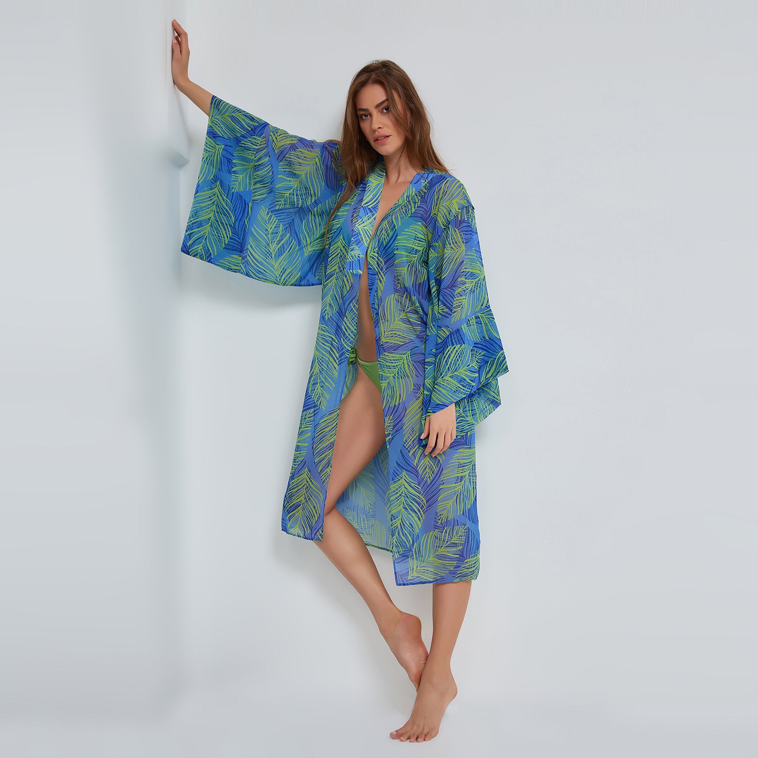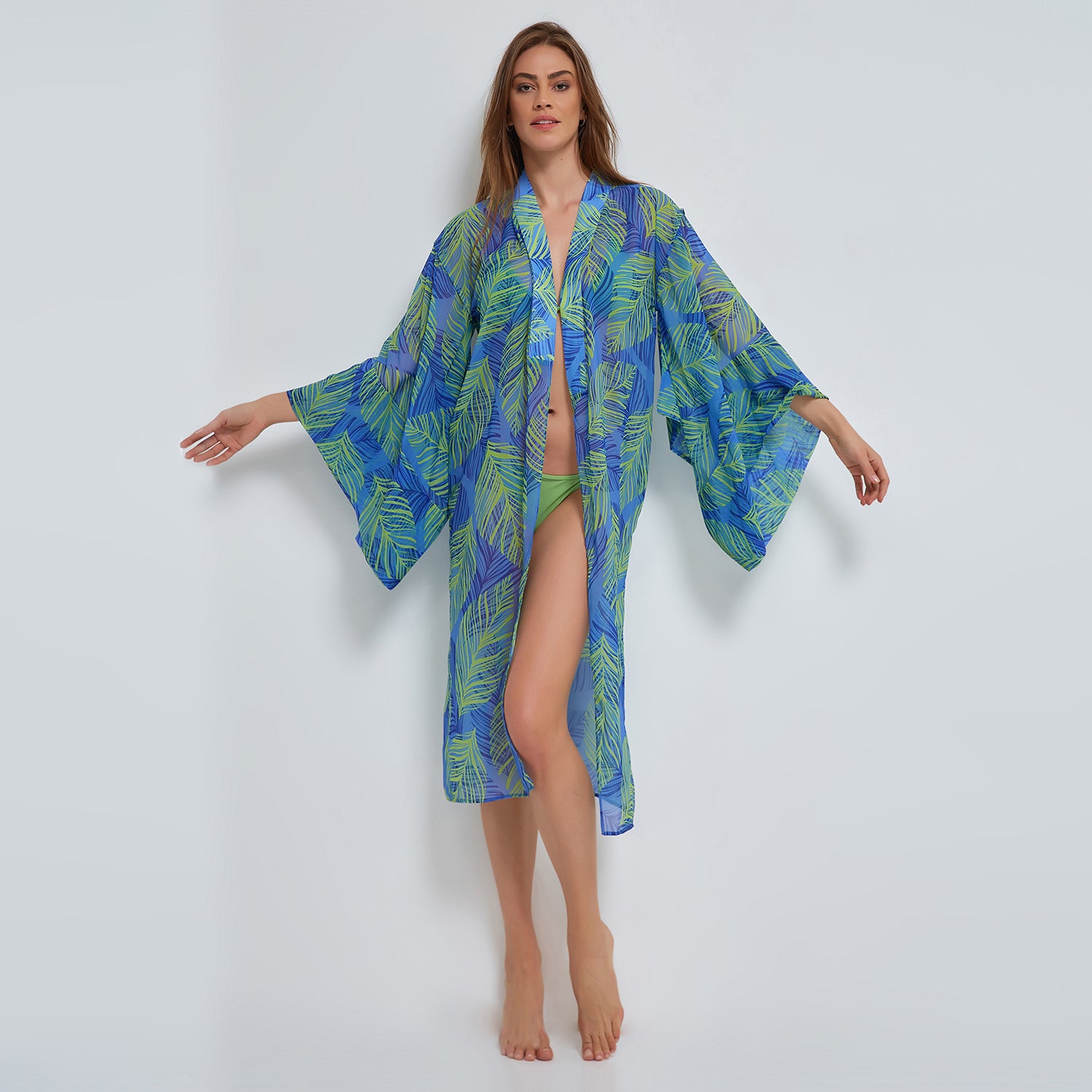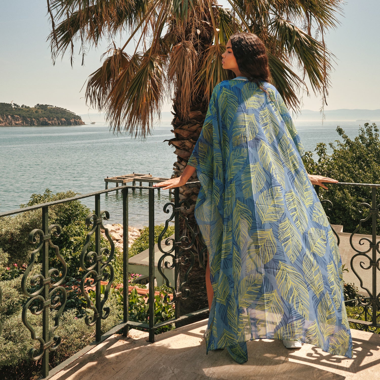 Silky flowing kimono that can be worn for any occasion, to the beach as a cover-up, for lounging around the house or out on the town. Dramatic colored leaf design in the finest silky polyester that feels like it’s caressing your body. The signature evil eye at the nape of the neck will protect you from bad luck.