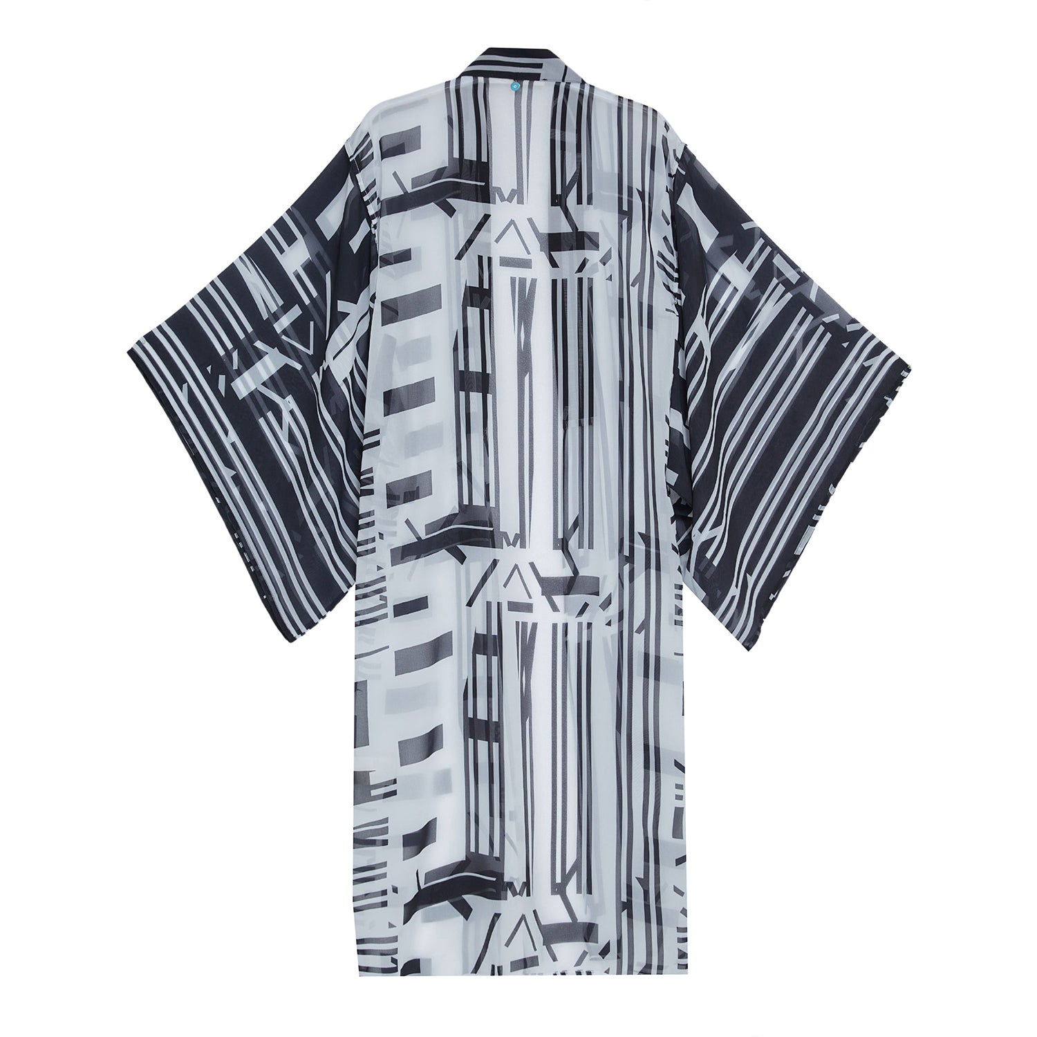 Silky flowing kimono that can be worn for any occasion, to the beach as a cover-up, for lounging around the house or out on the town. Modern geometric design in the finest silky polyester that feels like it’s caressing your body. The signature evil eye at the nape of the neck will protect you from bad luck.
