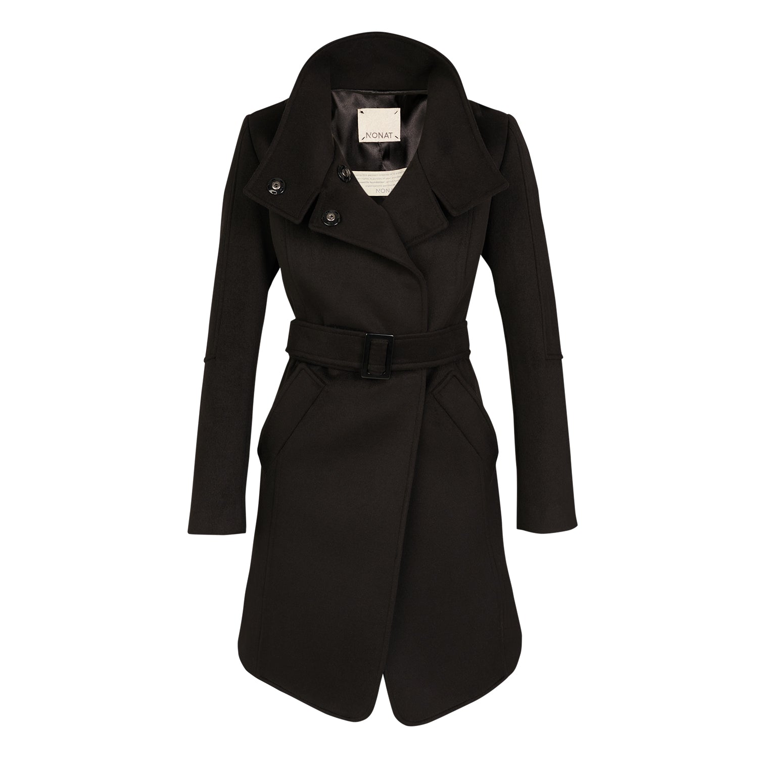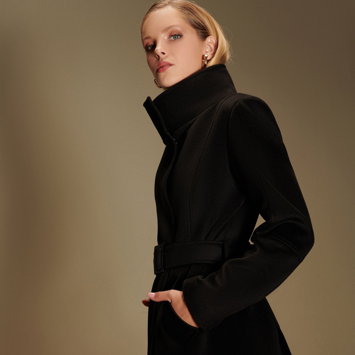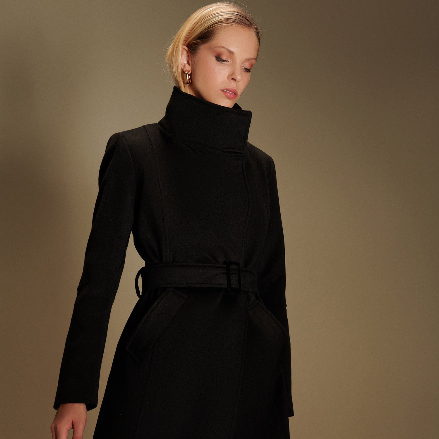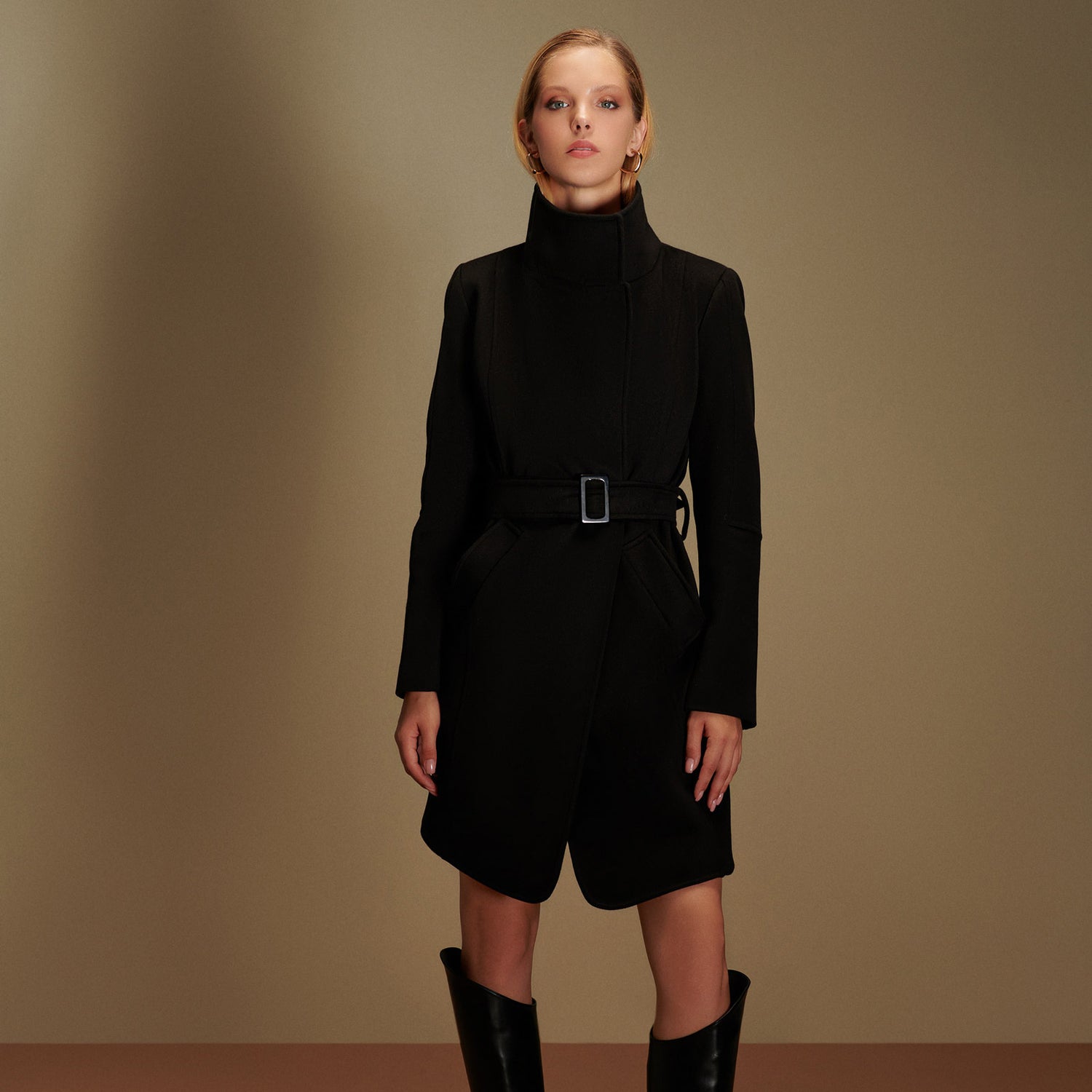 Make a bold and eloquent statement with this coat! The firmness of the collar maintains the coat's silhouette. Wear it open or cinch the belt for a more defined shape.