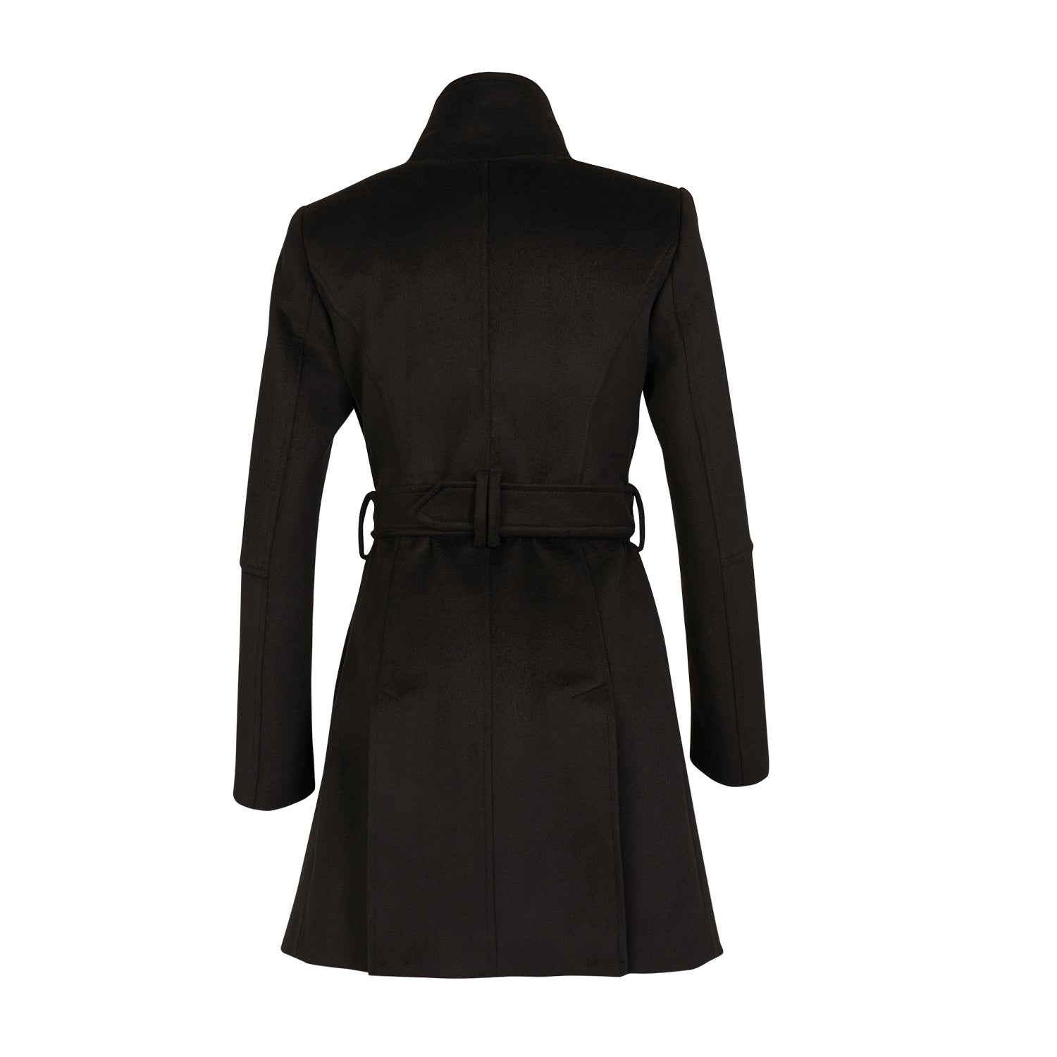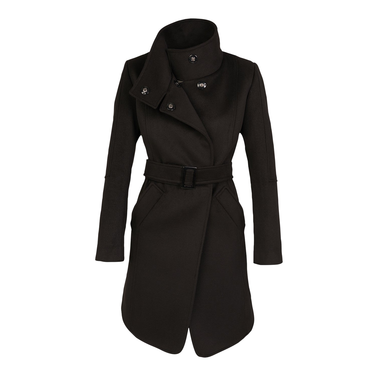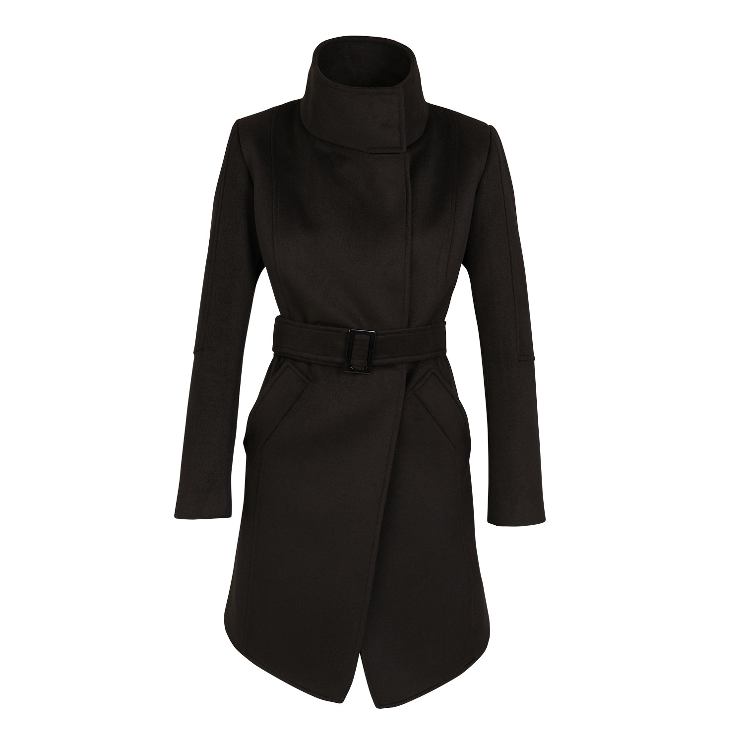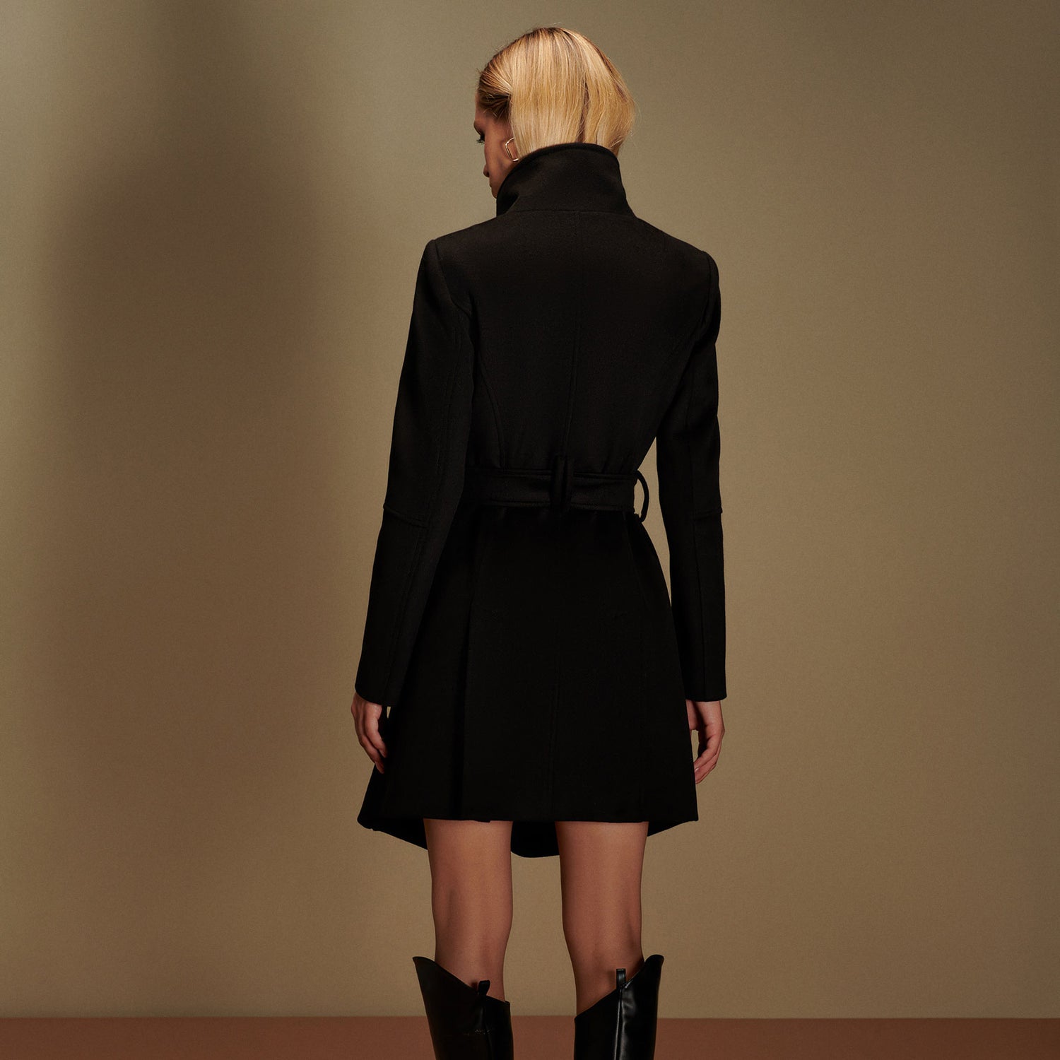 Make a bold and eloquent statement with this coat! The firmness of the collar maintains the coat's silhouette. Wear it open or cinch the belt for a more defined shape.