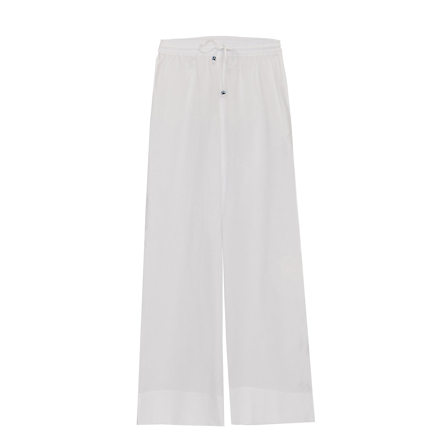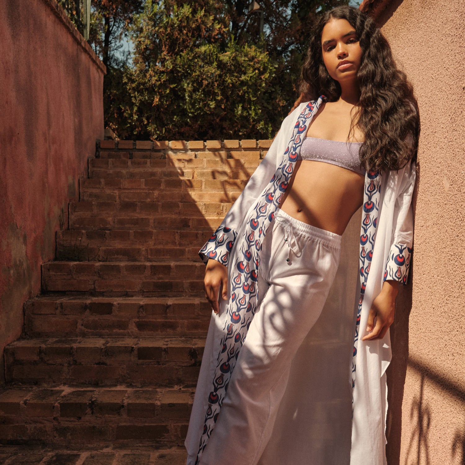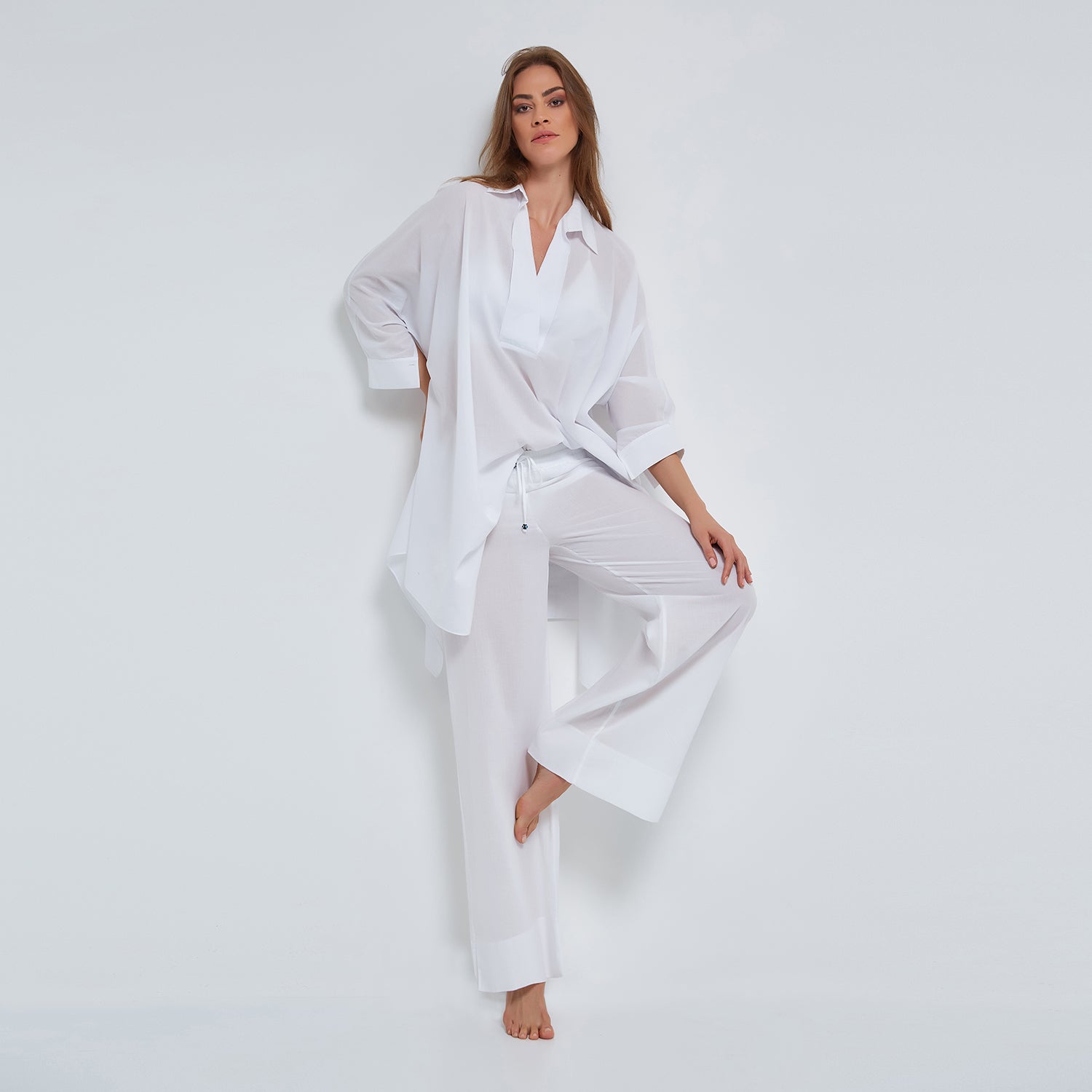 These pull-on trousers are very comfortable to wear with an elastic waist that has a drawstring with signature evil eye beads attached as stoppers. It is made of organic cotton, that semi see-through. Perfect for lounging at home or at the beach. Can be matched with Organic cotton Tunic from our collection.