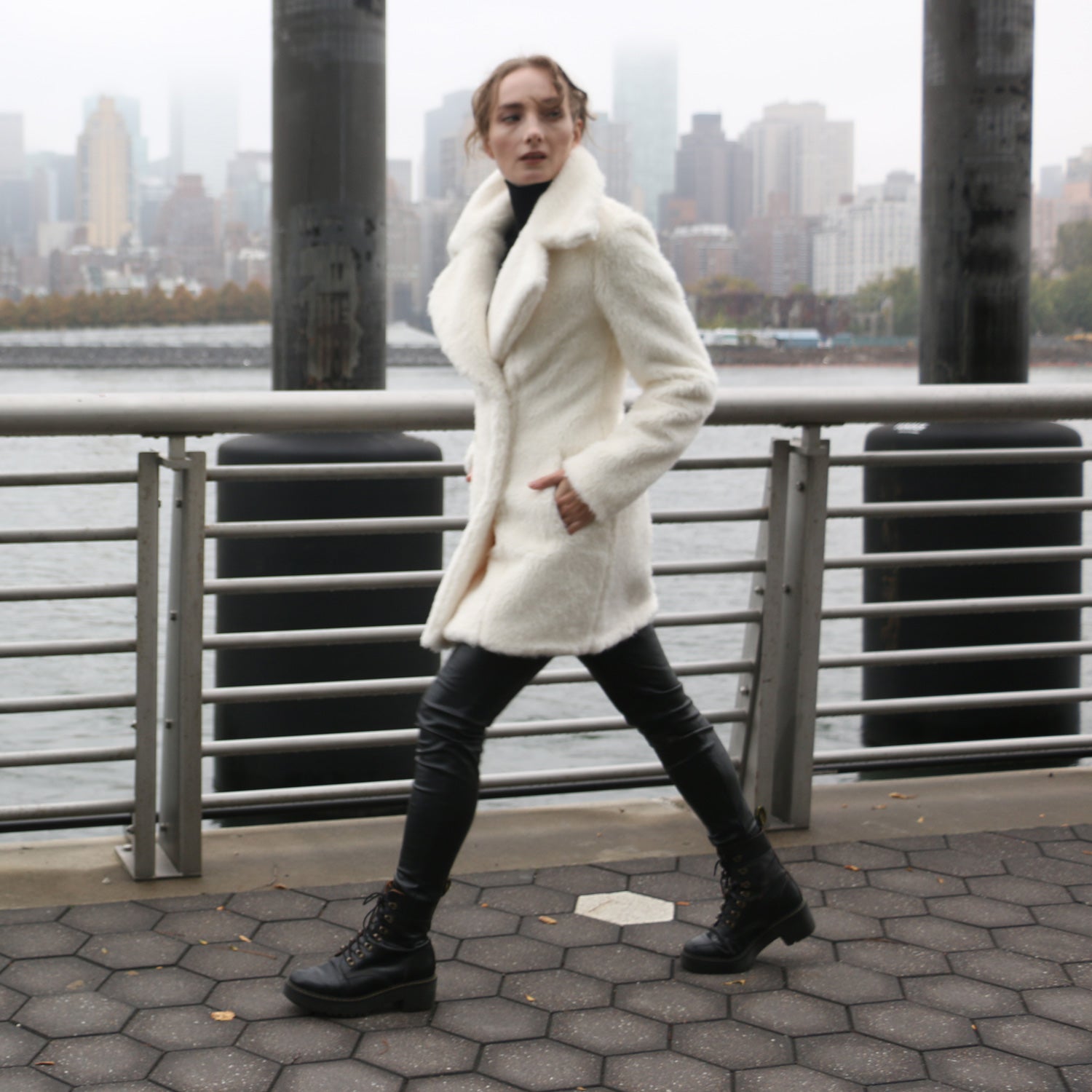 Go “off-duty celeb” with this double breasted coat in rich textured faux fur with front buttons and comfy front pockets. Fabrics and trims are made from eco-friendly recycled materials.