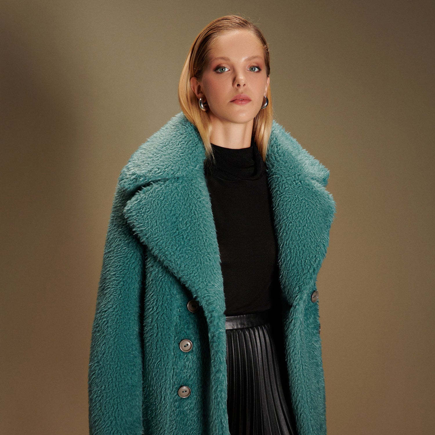 Go “off-duty celeb” with this double breasted coat in rich textured faux fur with front buttons and comfy front pockets. Fabrics and trims are made from eco-friendly recycled materials.
