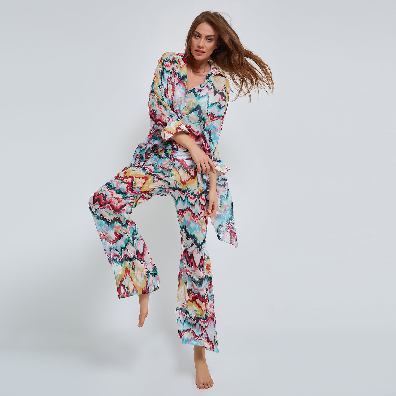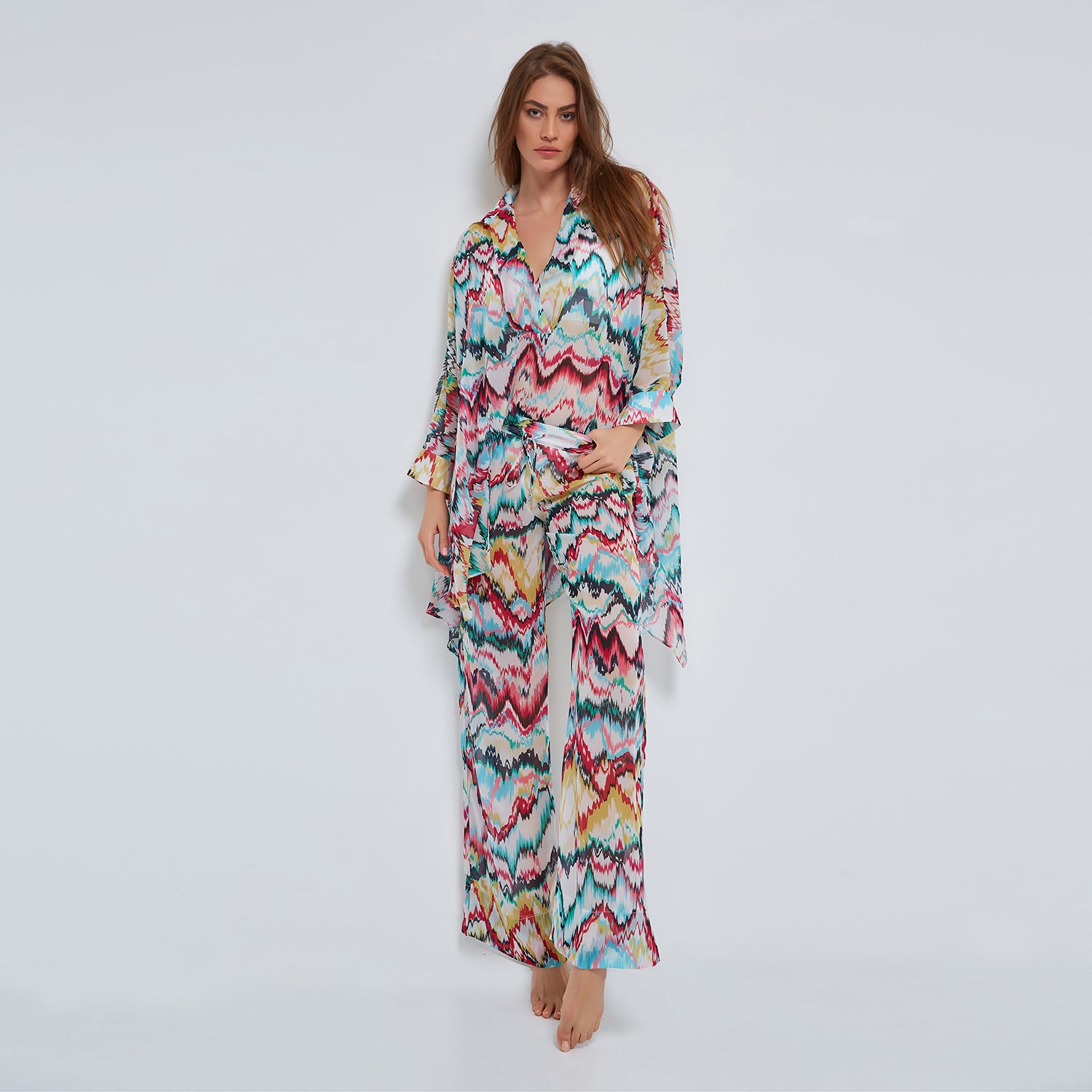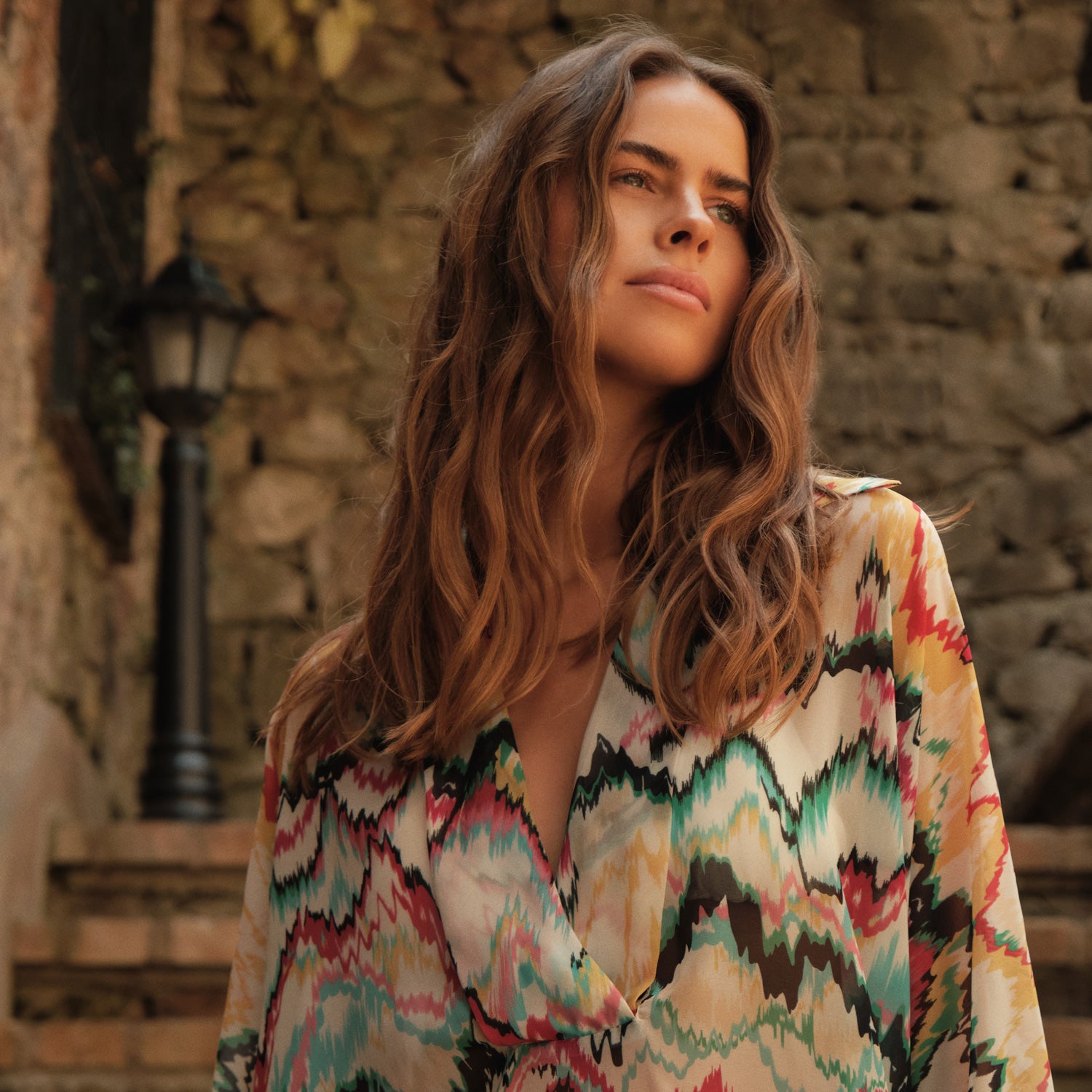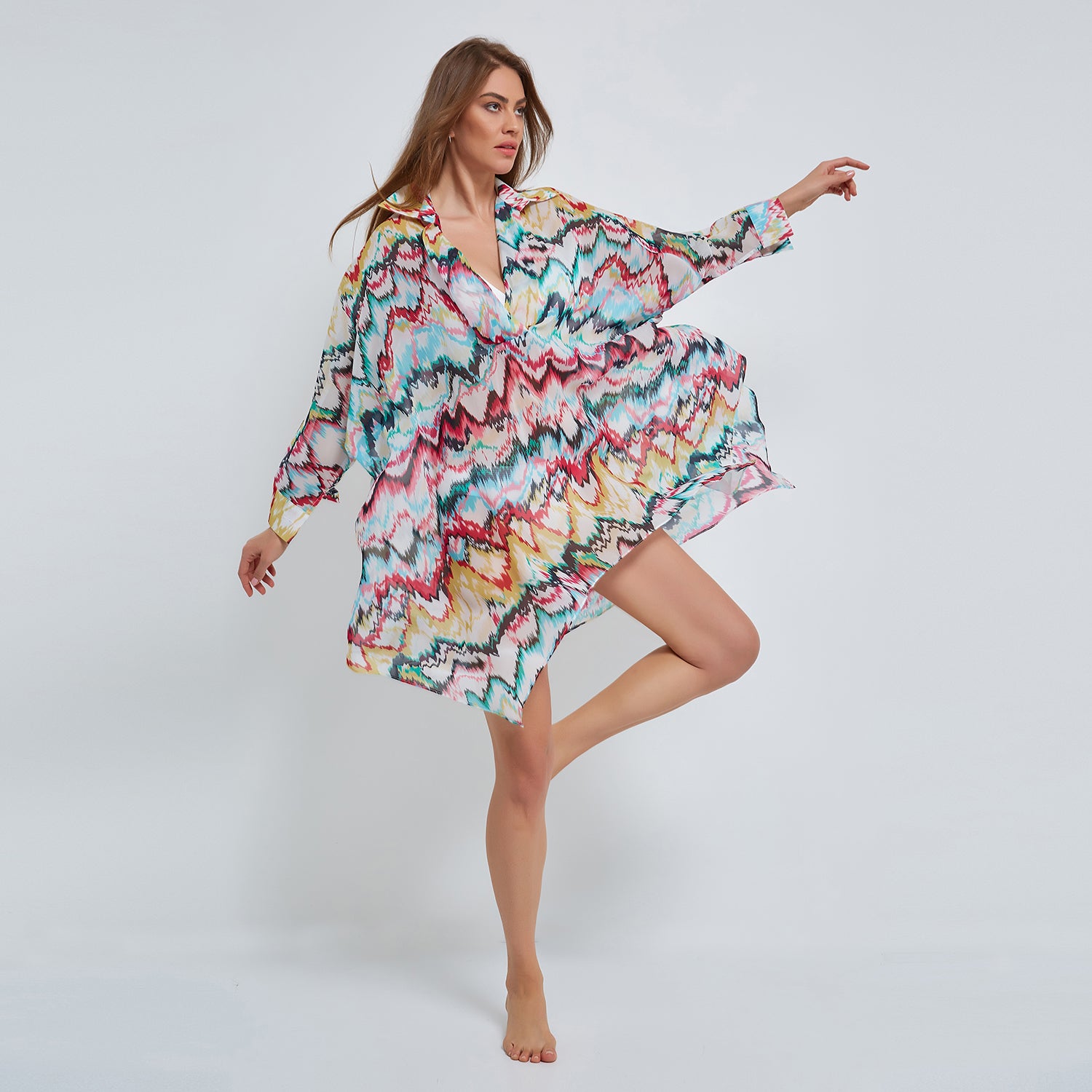 A tunic for every occasion! Can be worn as a beach cover-up, shopping in the city or a night out on the town. This chic, modern design comes in one size only, and because of the loose shape fits many sizes. The fabric has a silky touch. The signature evil eve motif graces the back nape of the neck.