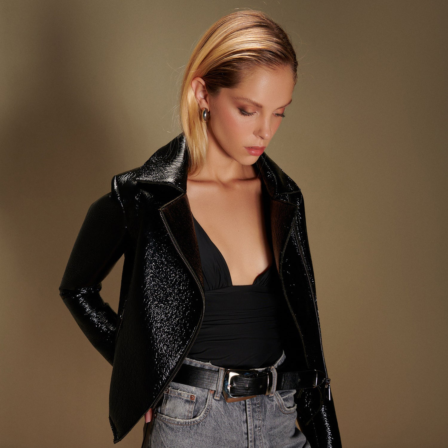 Fitted, Gloss-Coated Shiny Stretch Faux Leather Biker Jacket