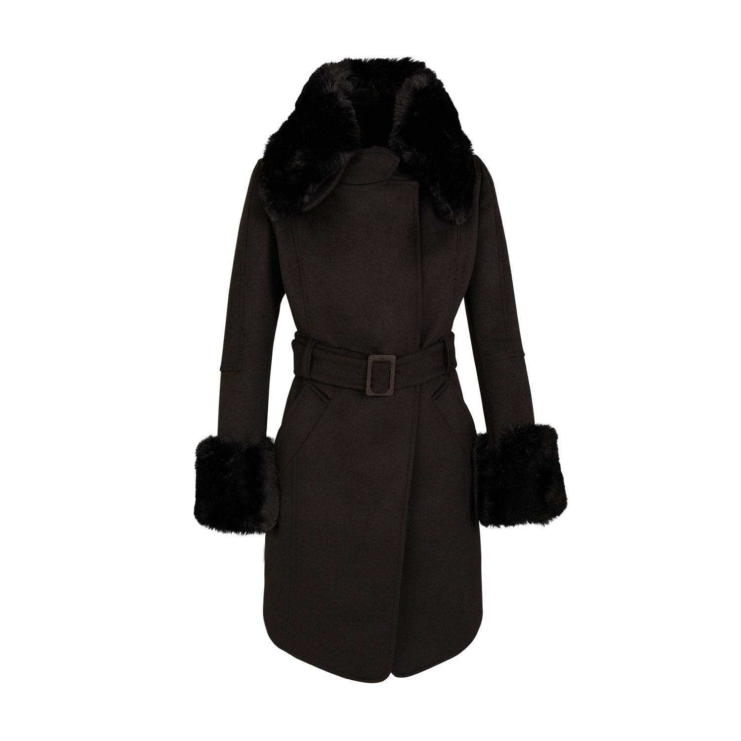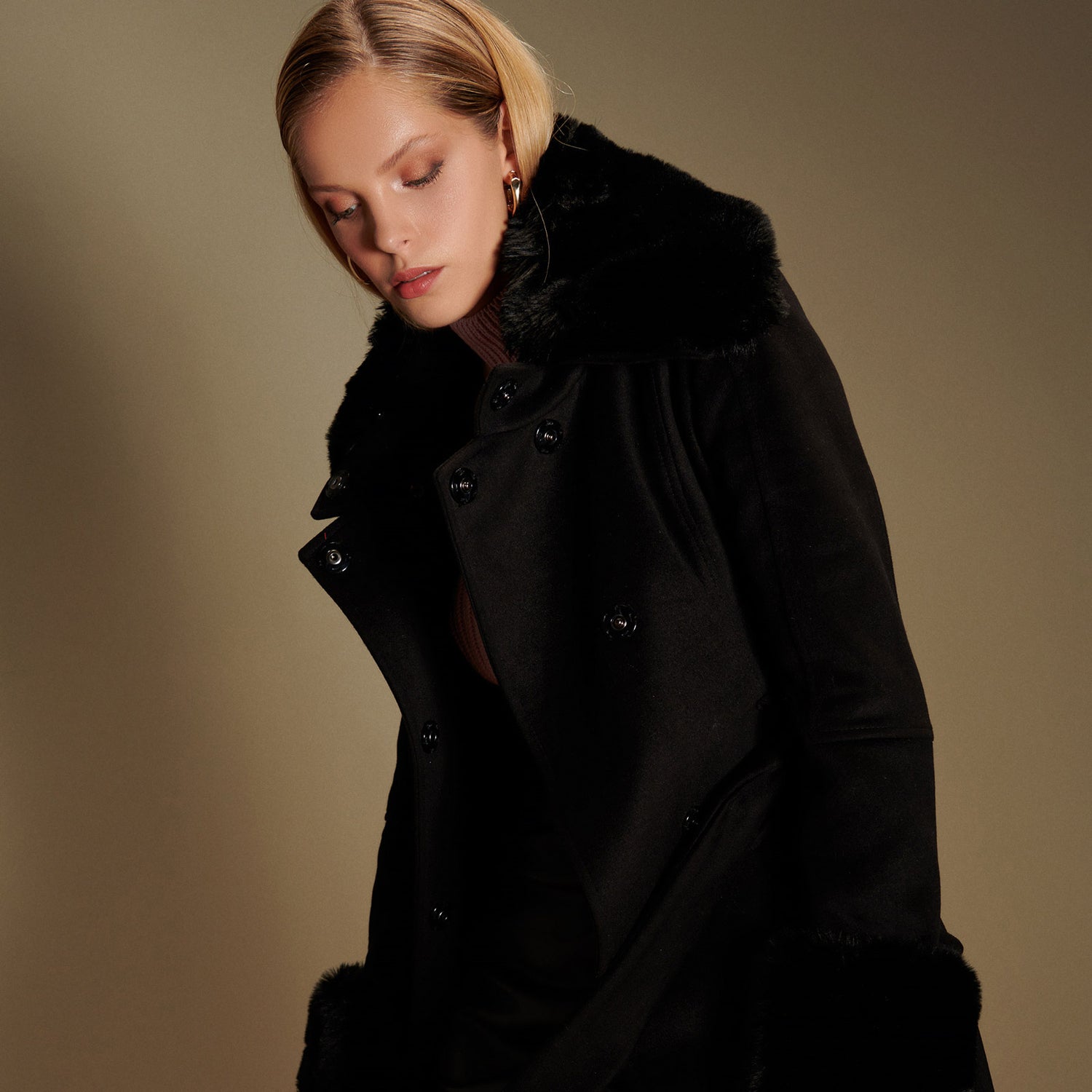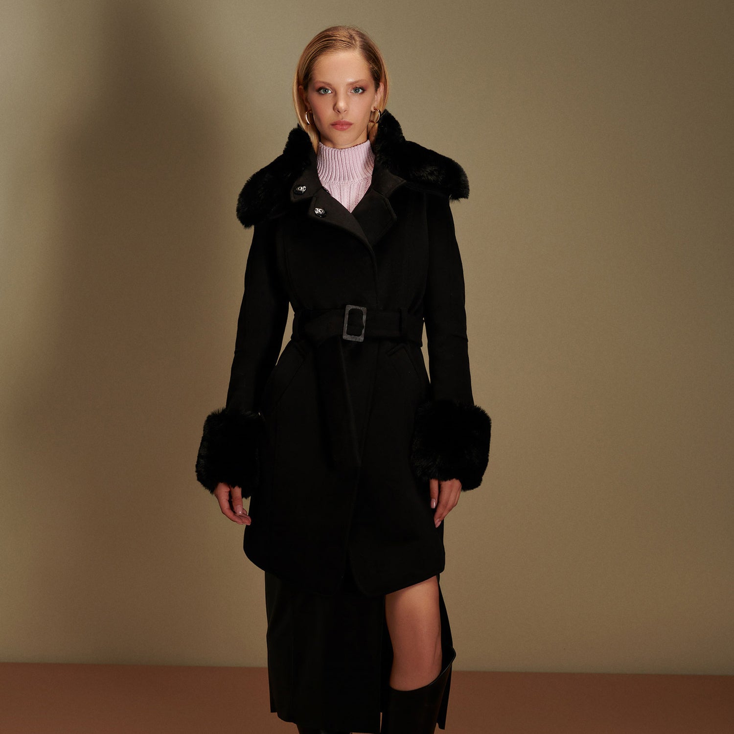 This fitted wool trench coat will be a timeless piece in your wardrobe. It comes with a detachable faux fur collar and cuffs and belt, which comes included. Fabric, hand sewed snaps, and buckles are made from eco-friendly materials. Can be worn open or with a metal snap closure.