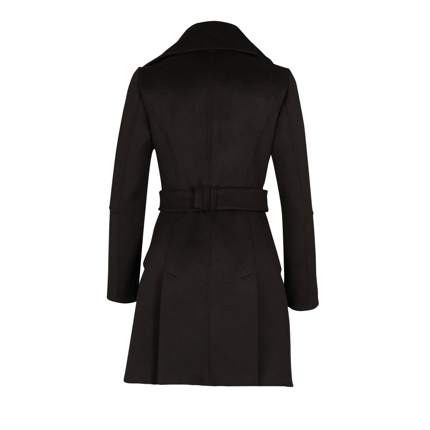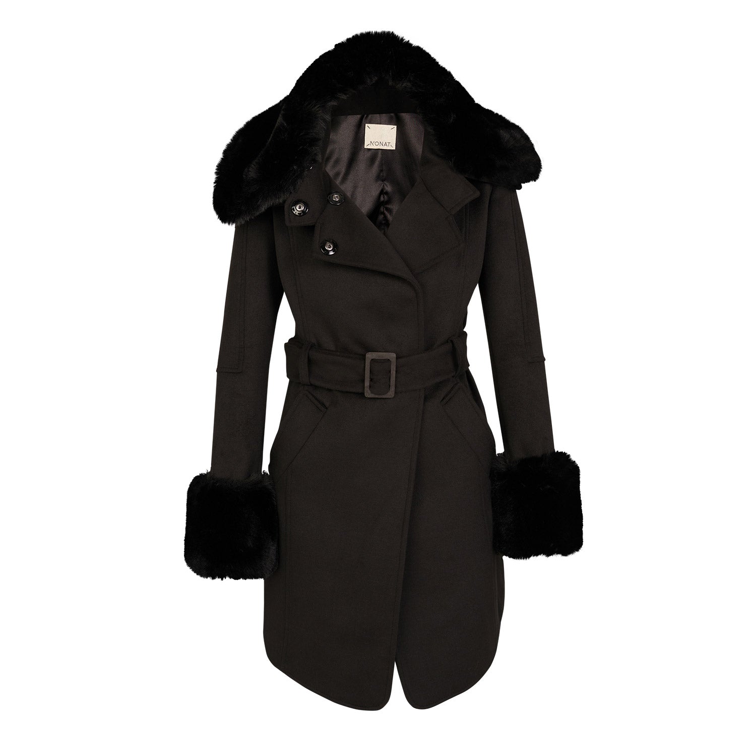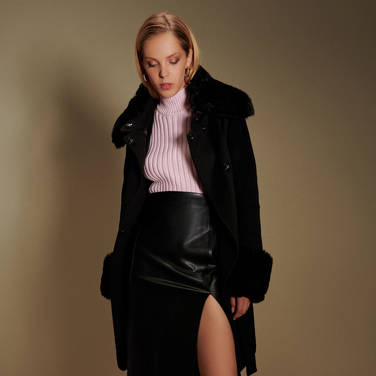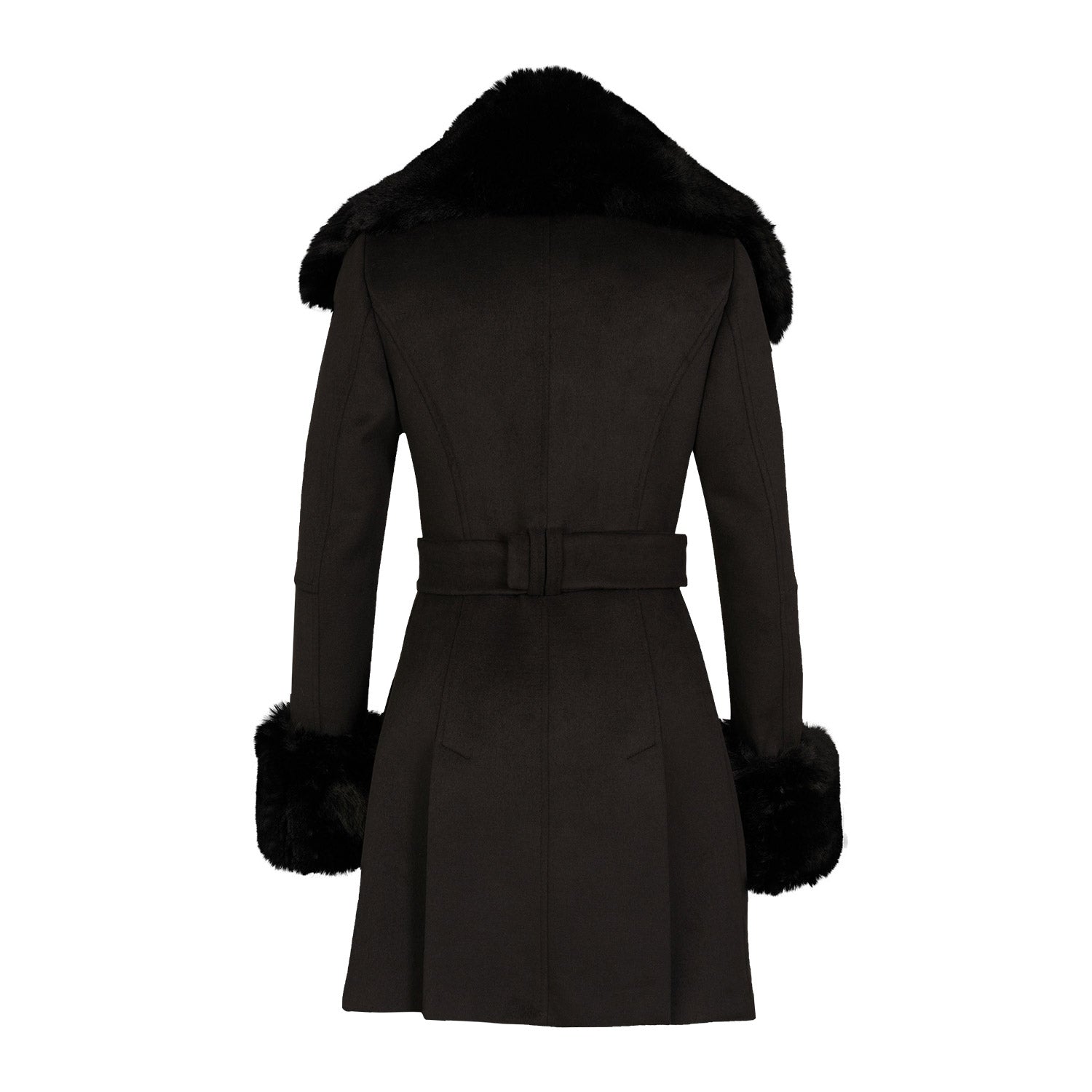 This fitted wool trench coat will be a timeless piece in your wardrobe. It comes with a detachable faux fur collar and cuffs and belt, which comes included. Fabric, hand sewed snaps, and buckles are made from eco-friendly materials. Can be worn open or with a metal snap closure.