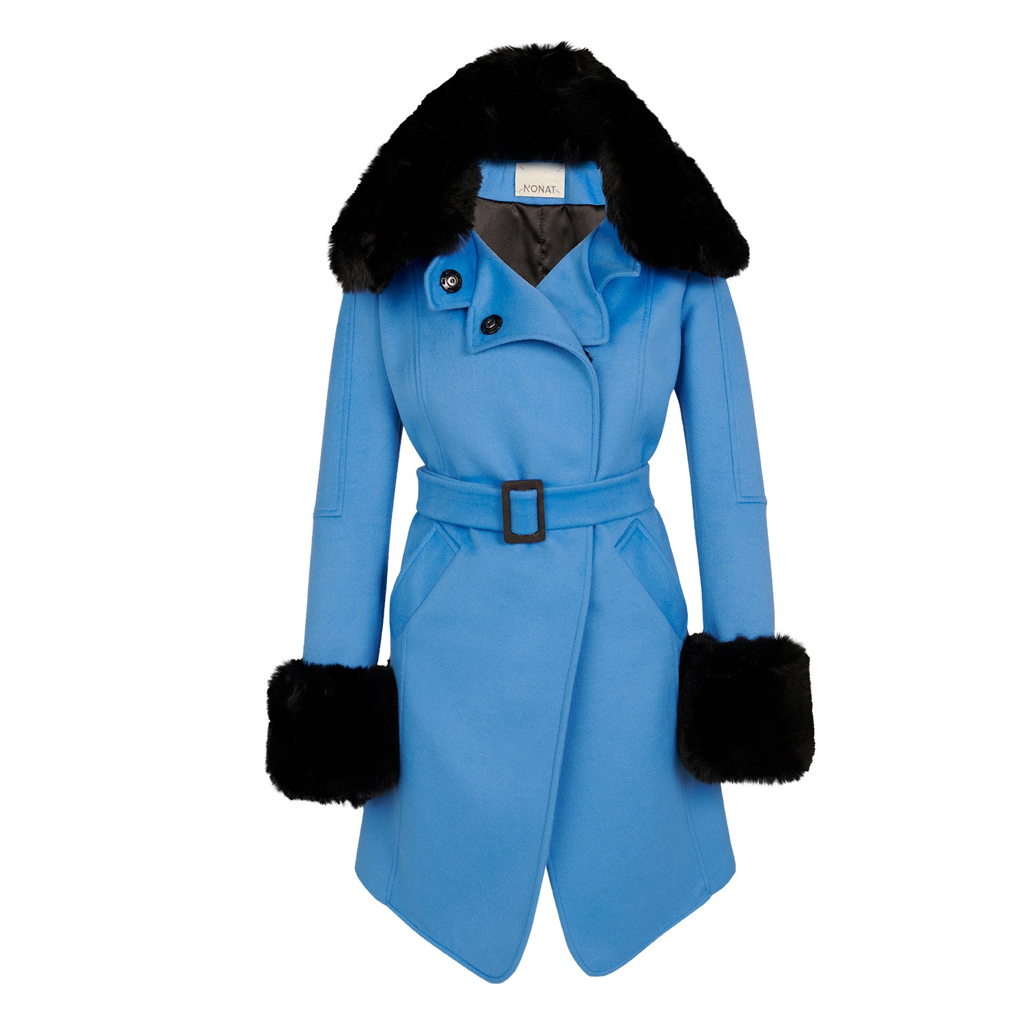 This fitted wool trench coat will be a timeless piece in your wardrobe. It comes with a detachable faux fur collar and cuffs and belt, which comes included. Fabric, hand sewed snaps, and buckles are made from eco-friendly materials. Can be worn open or with a metal snap closure.