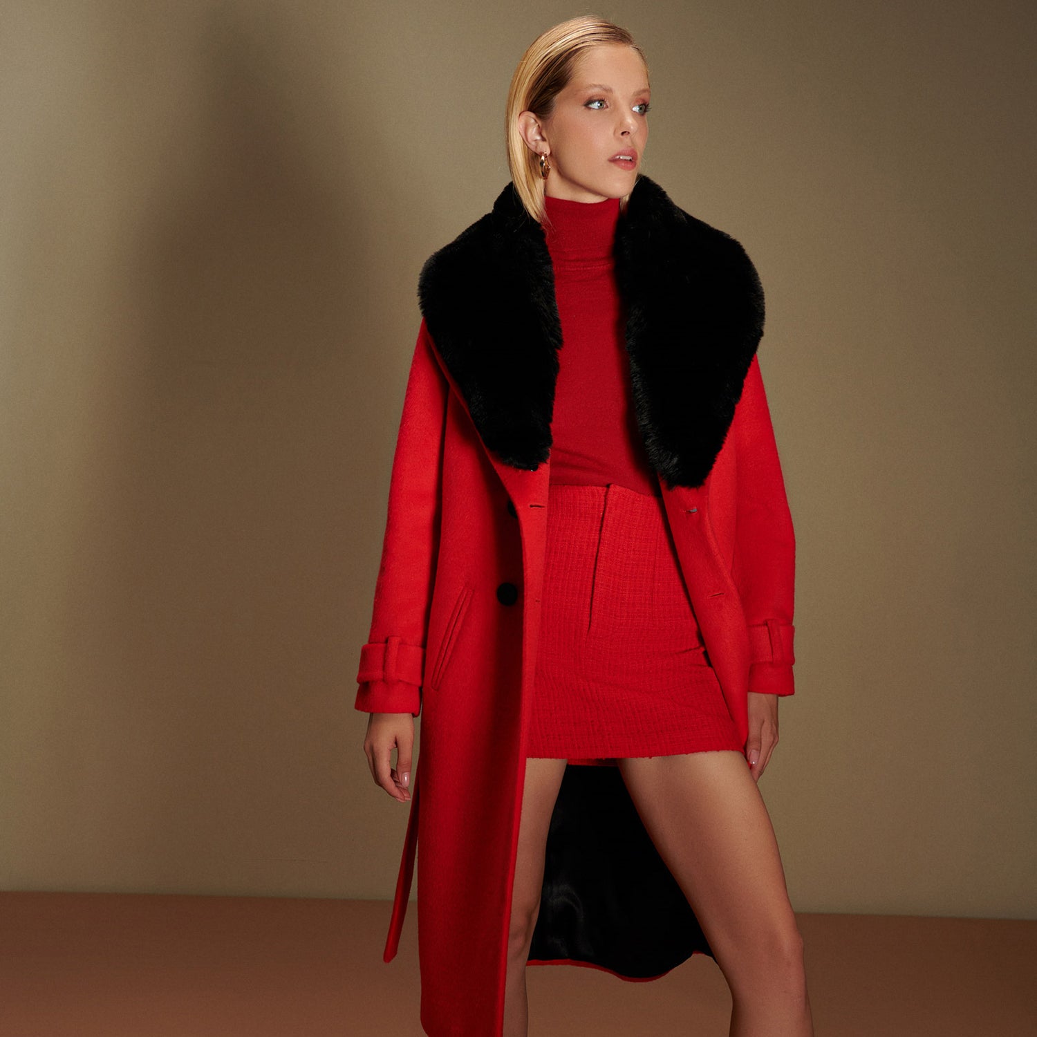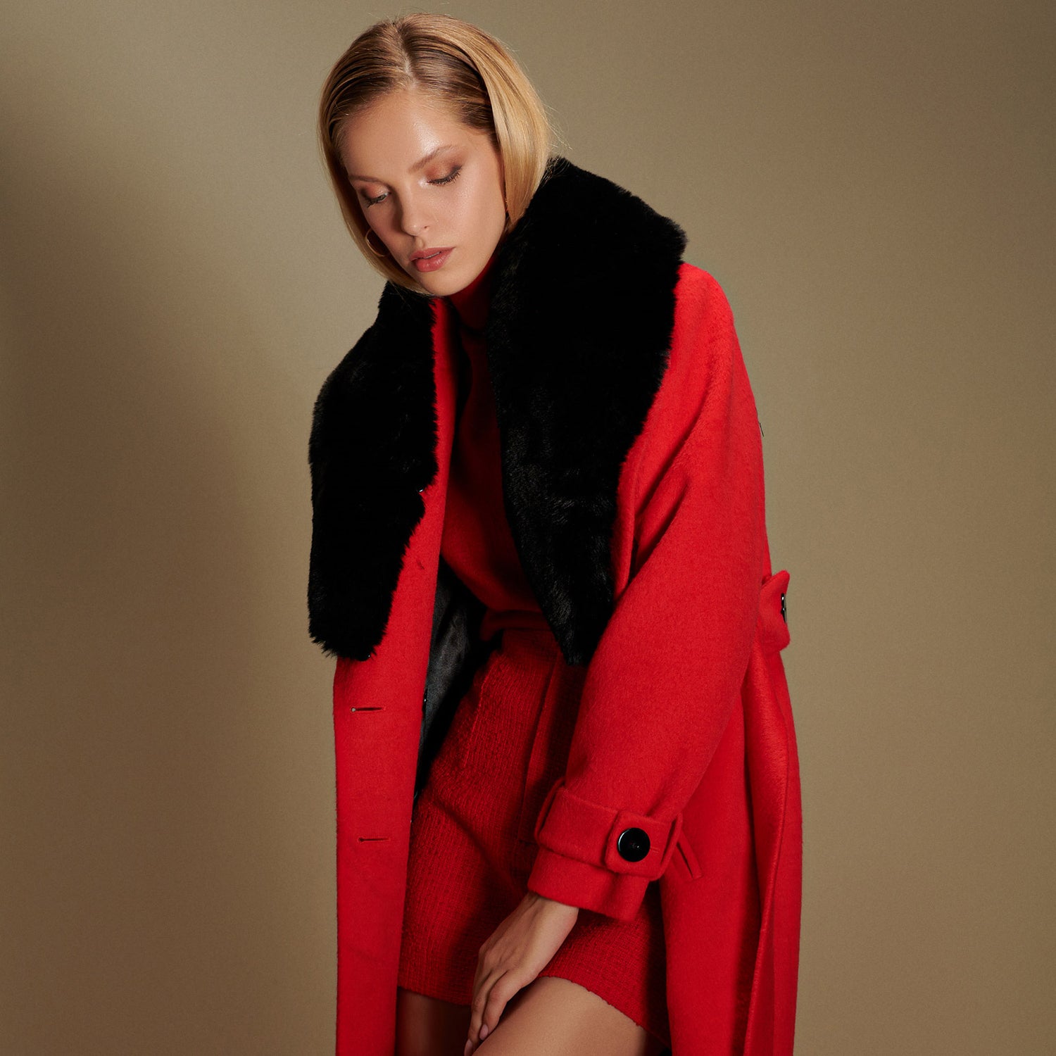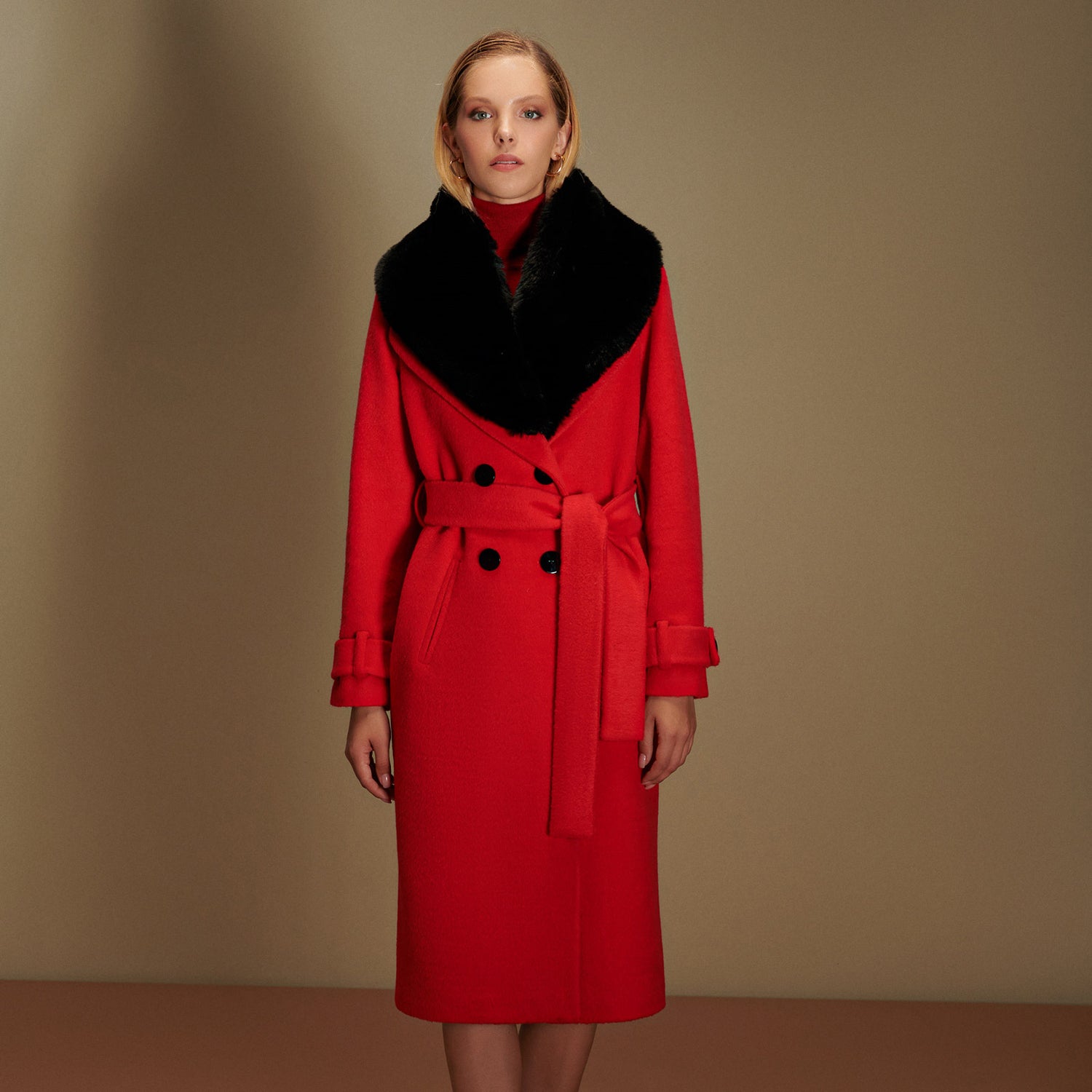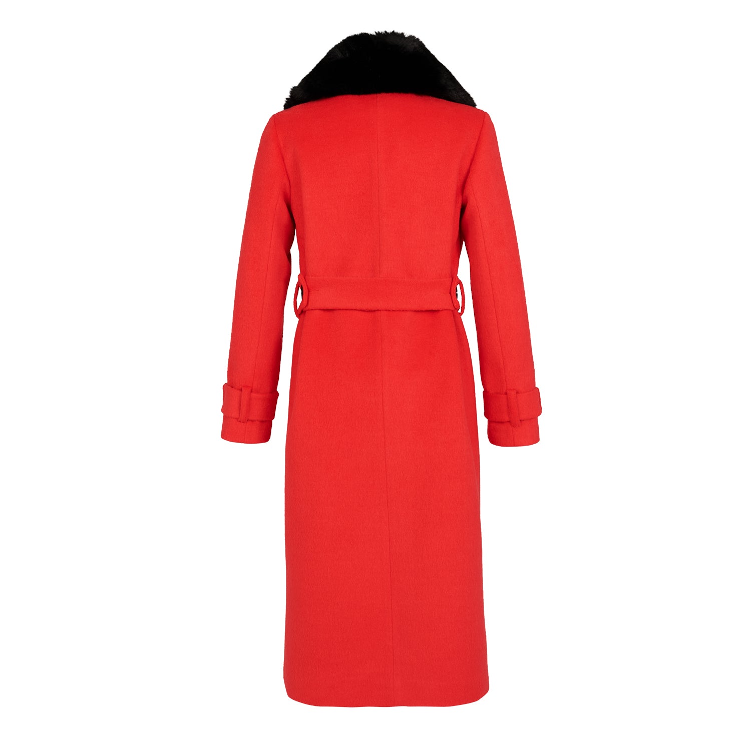 This exquisite vegan coat will carry you all through your day and evening with its classic style. It comes with sumptuous detachable Faux Fur collar, which comes included. The belt will gracefully cinch your waist to give shape and definition.