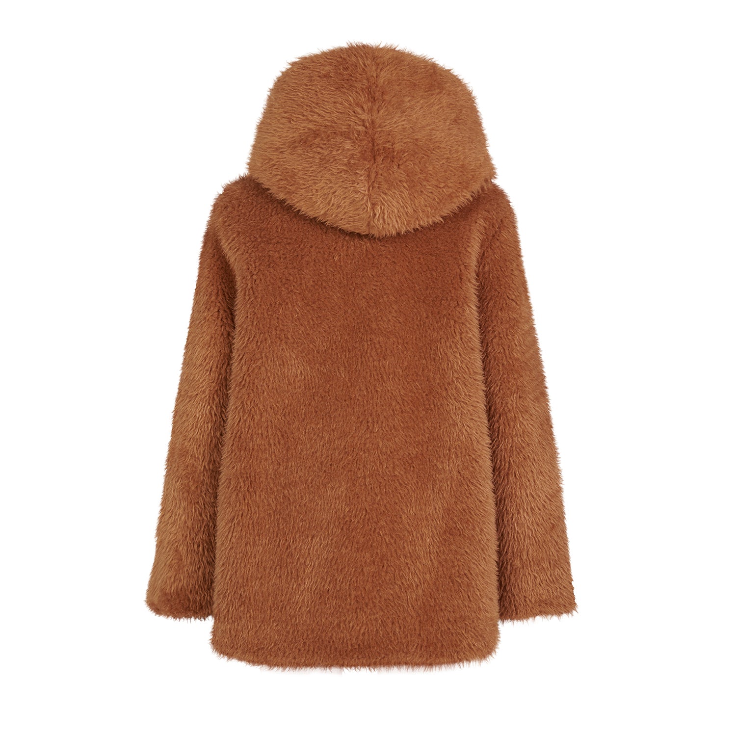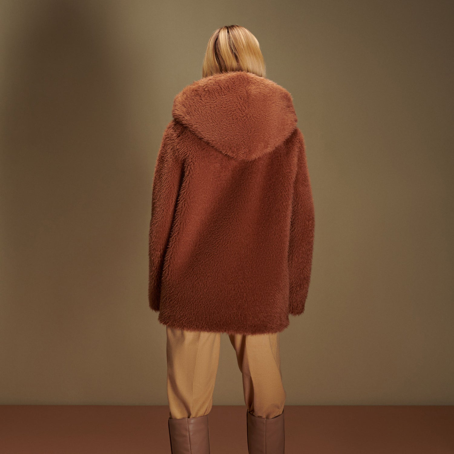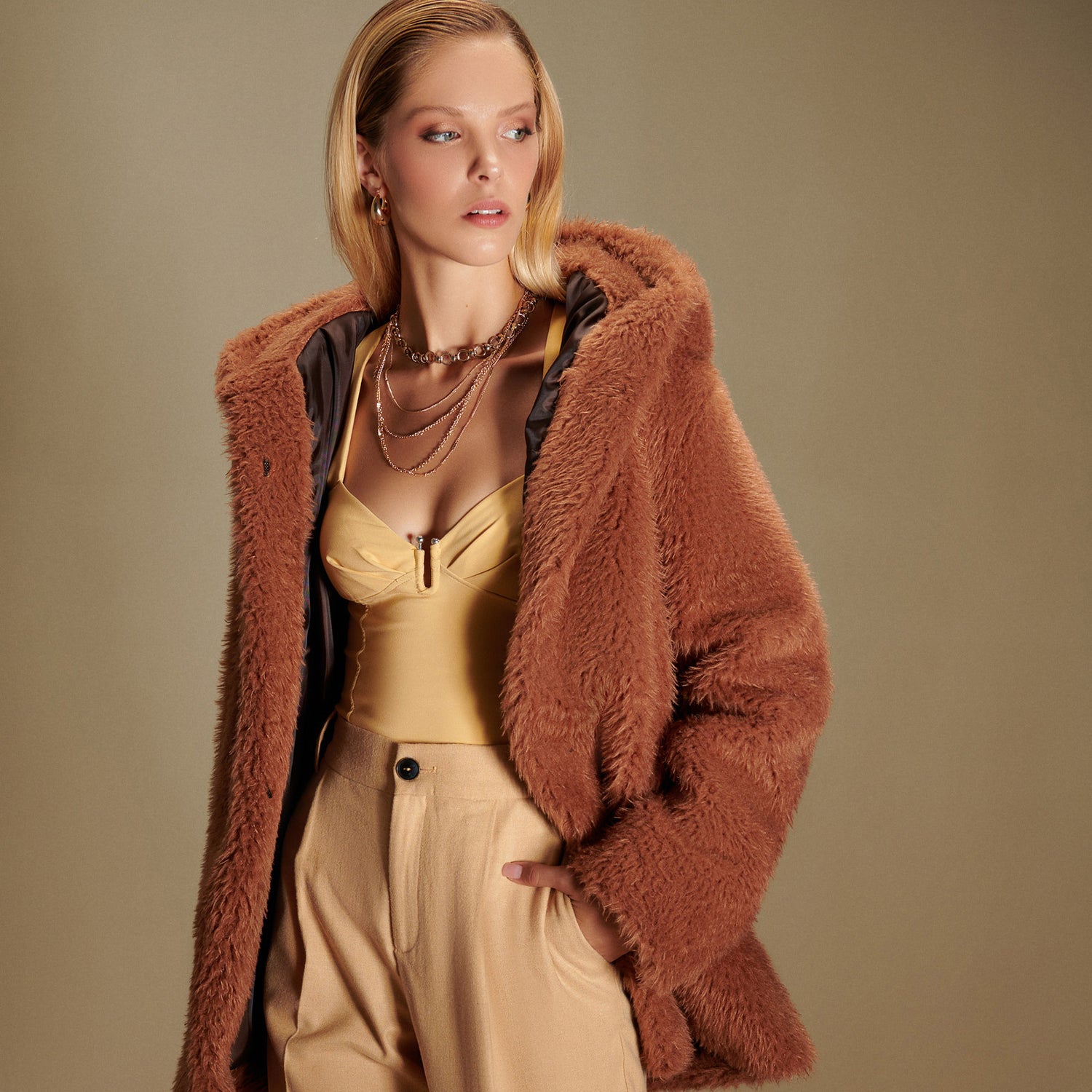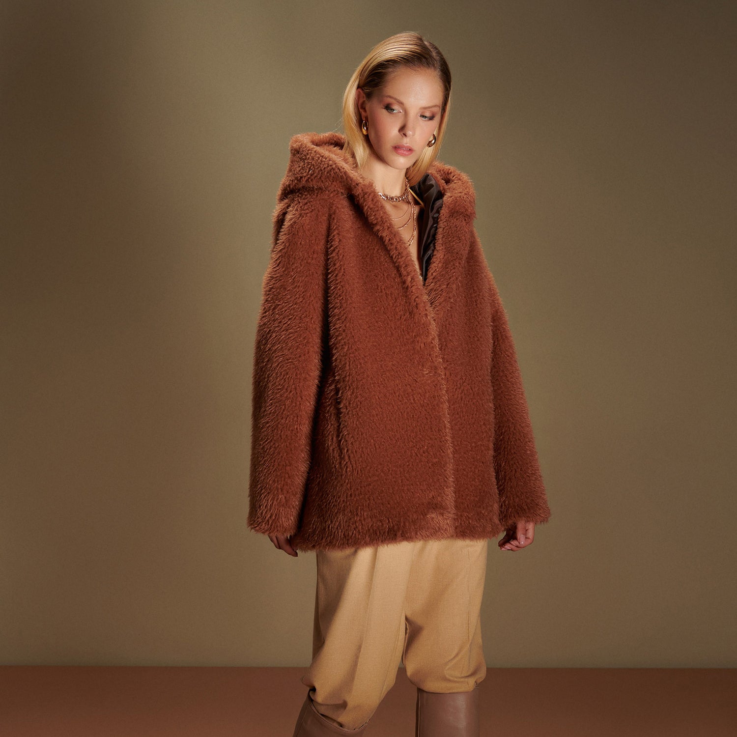 The epitome of comfort. Lush to the max. You can wear it to dress up or down. This coat will give you the warmest feeling with its loose fit and hood.