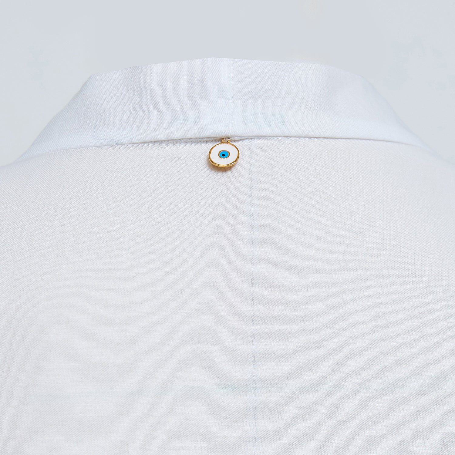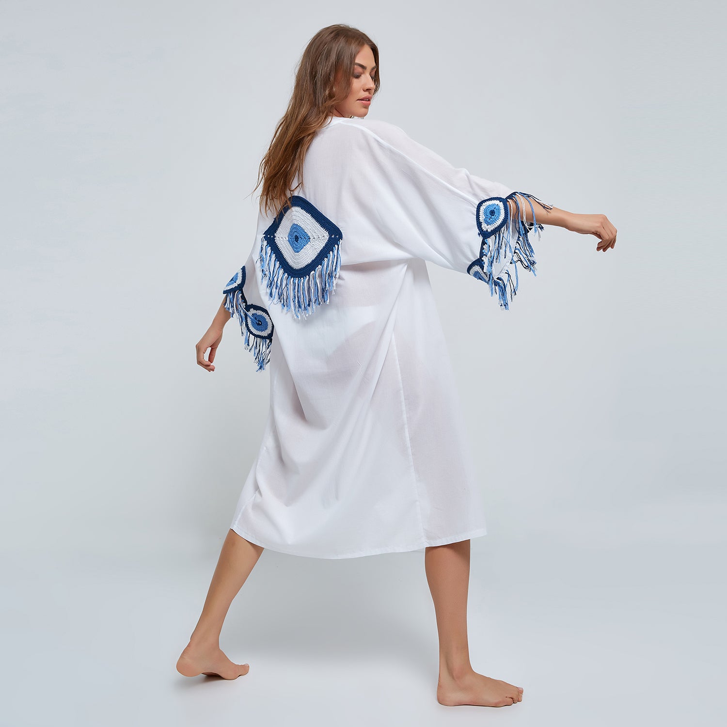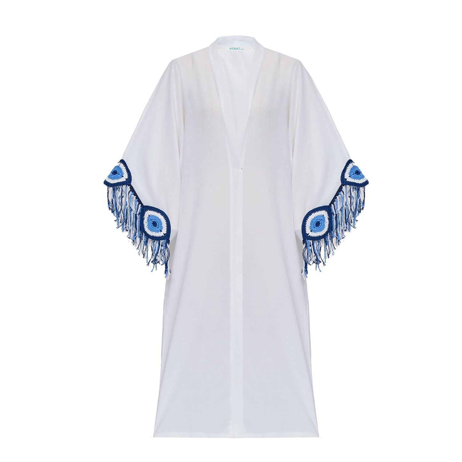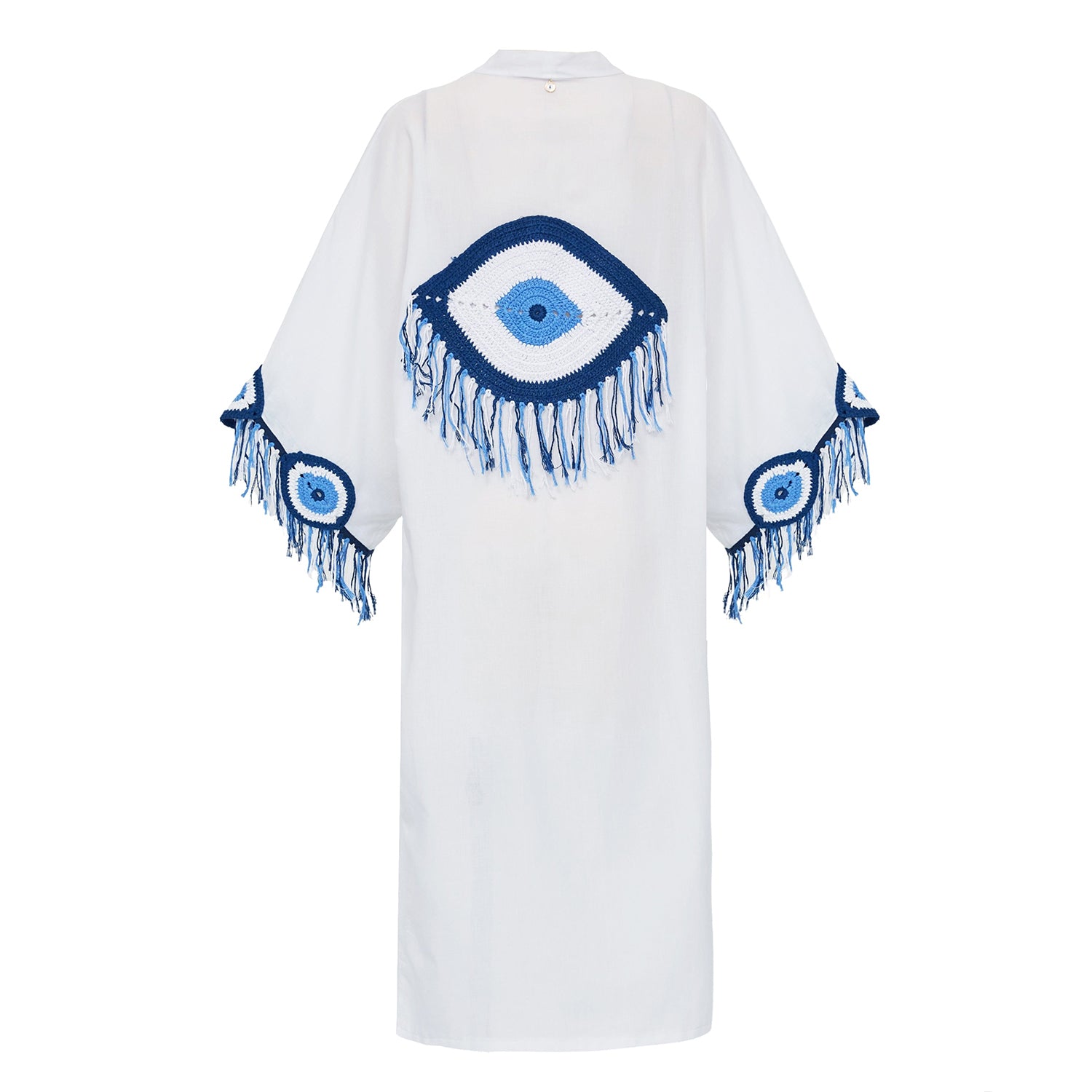 This organic cotton kaftan is adorned with hand crocheted evil eyes that pays homage to the Turkish tradition of protection from bad luck. It comes with a belt. Can be worn lounging around the house and at the beach. It also has the signature evil eye motif at the nape of the neck.