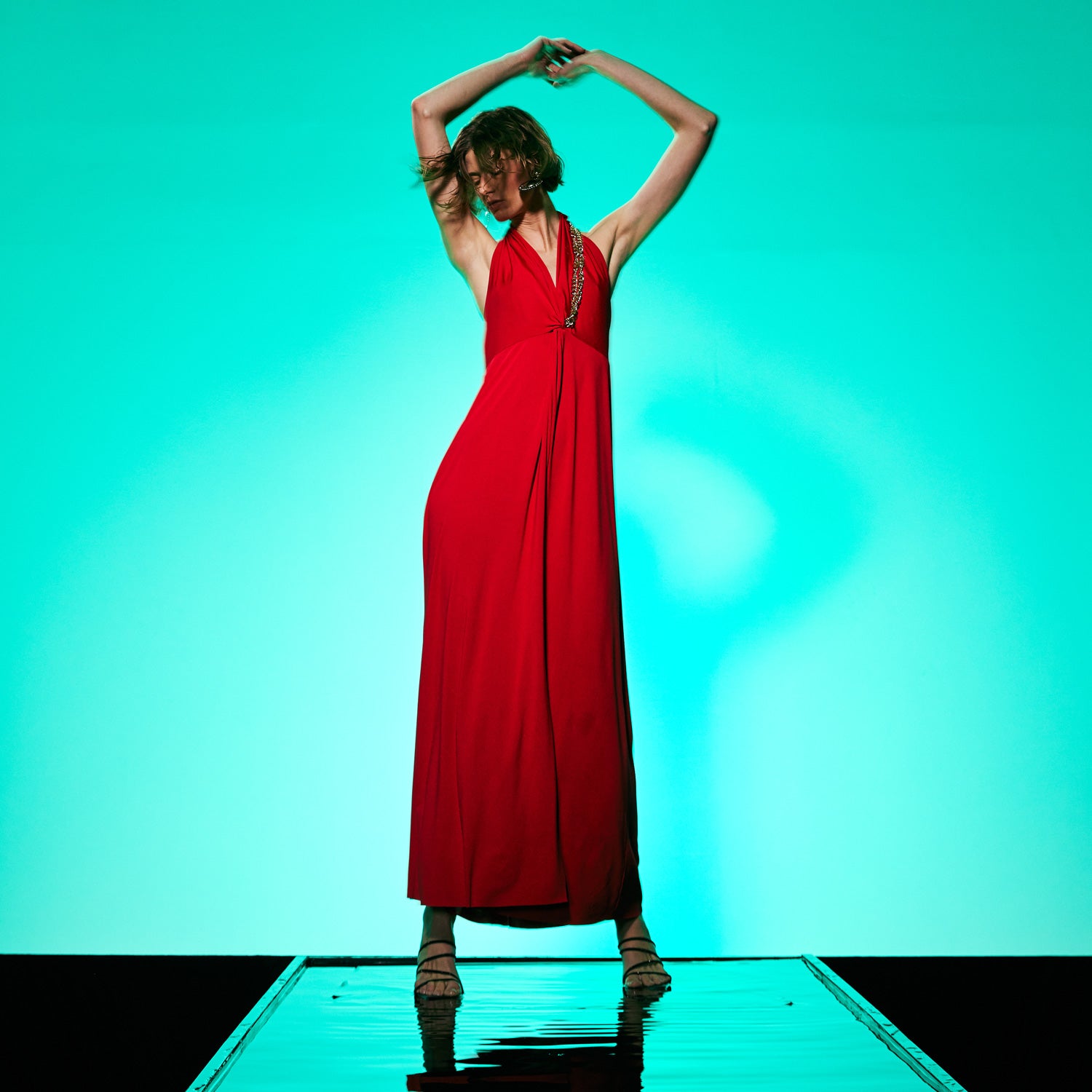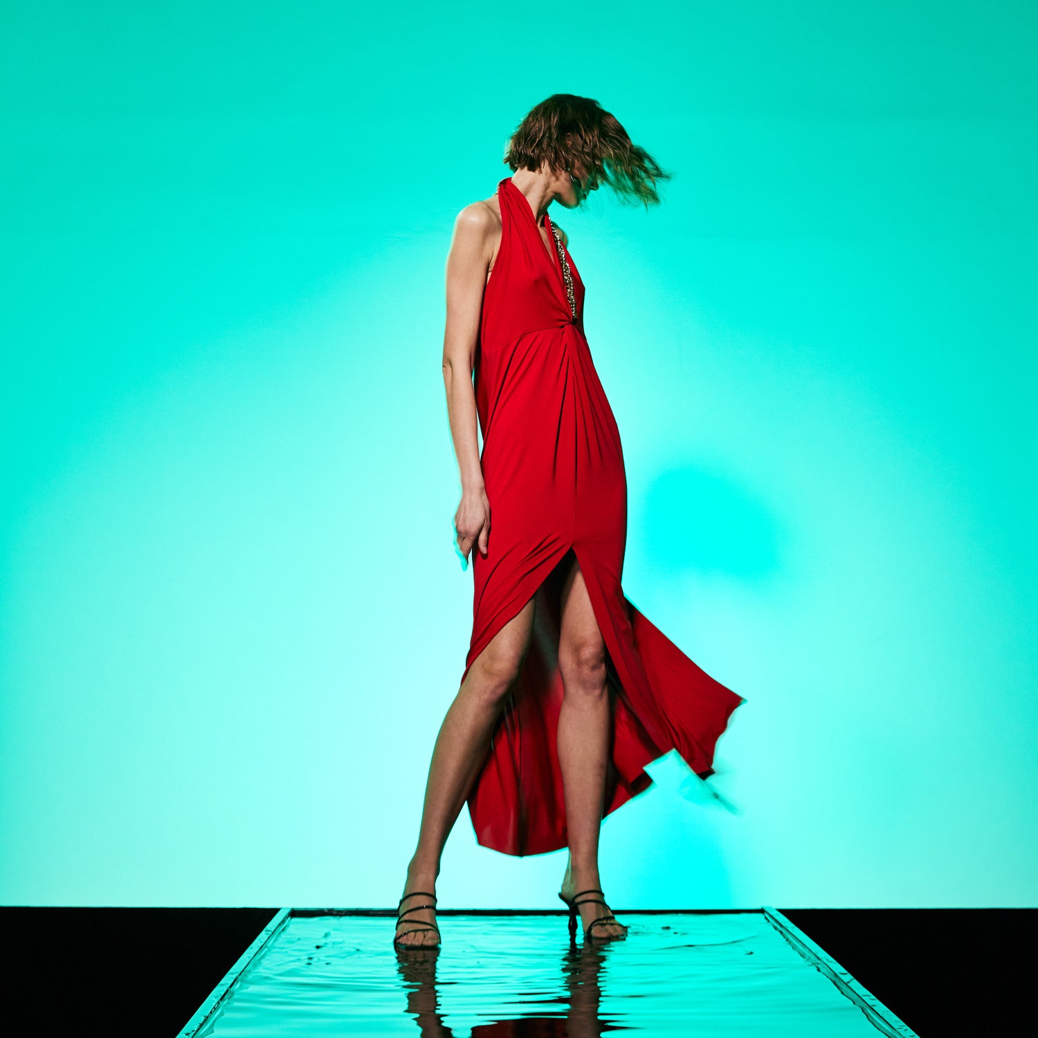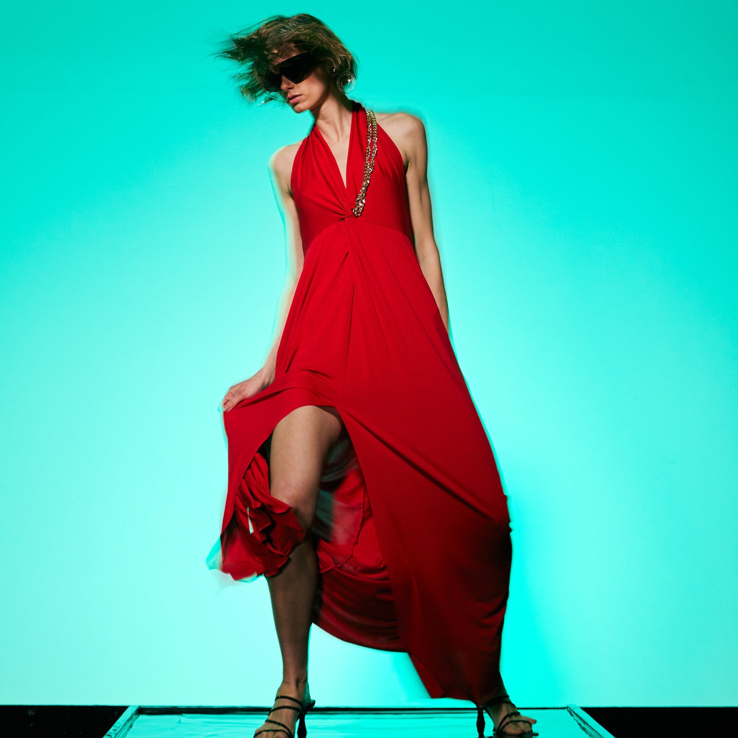 This enveloped, deep front vented semi shiny recycled knit cocktail dress will be a mainstay of your wardrobe. It is very sexy with the deep V line in the neck and comes with a detachable gold chain accessory.