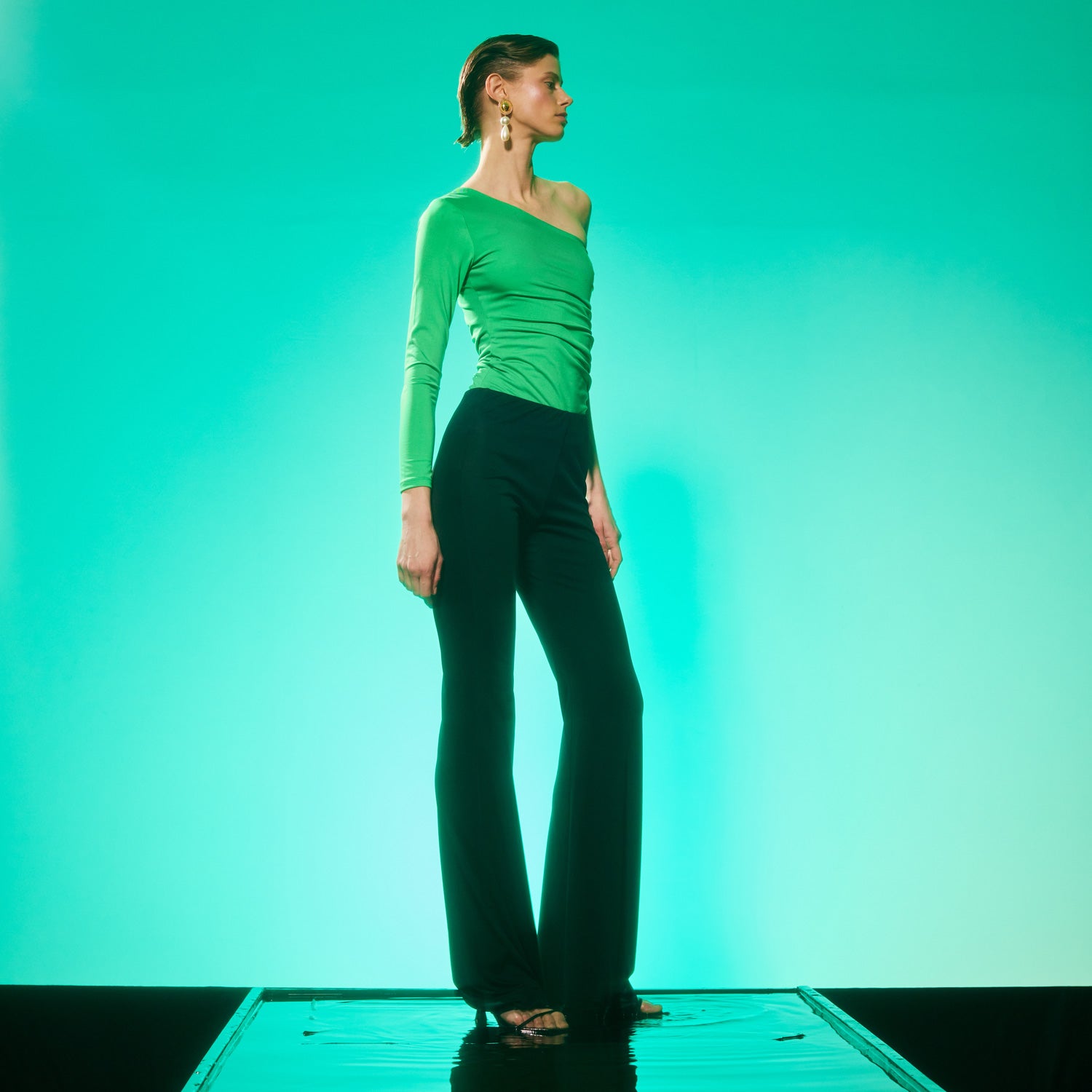 This sexy one shoulder body will complete your outfit for nights out. It is made of semi shiny recycled knit fabric and comes in vibrant trendy colors. Doubled stretch fabric flatters your shape without having to worry about undergarments.