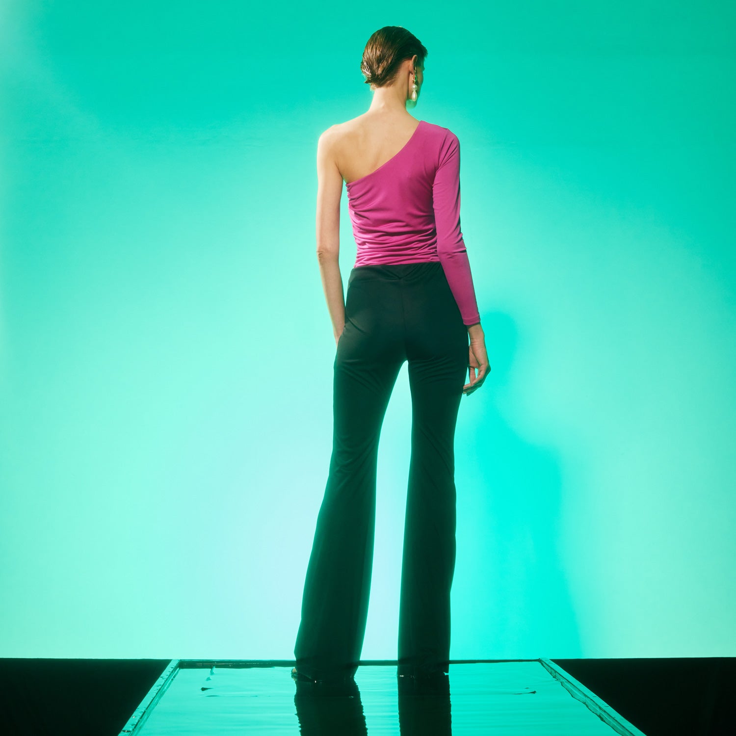 This sexy one shoulder body will complete your outfit for nights out. It is made of semi shiny recycled knit fabric and comes in vibrant trendy colors. Doubled stretch fabric flatters your shape without having to worry about undergarments.