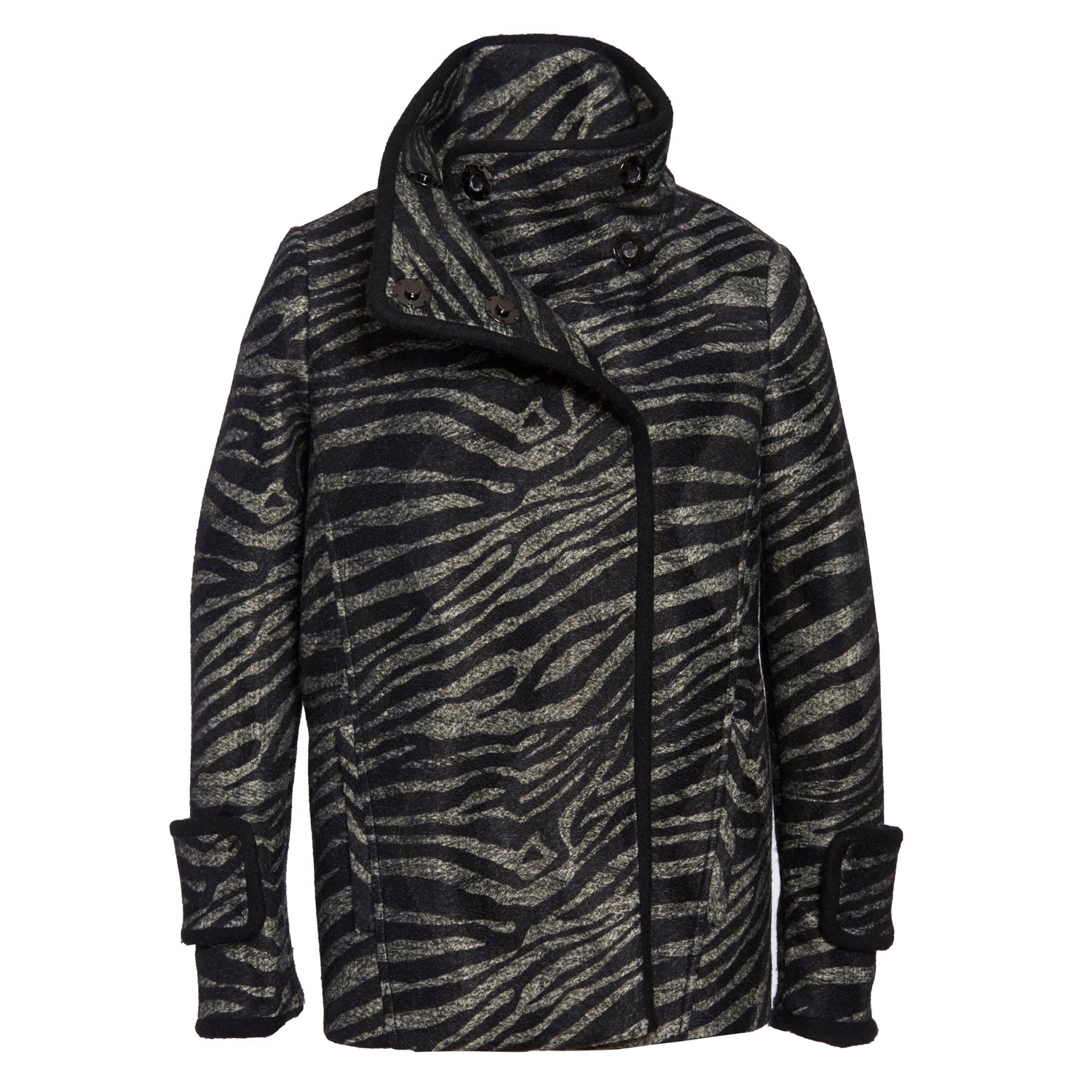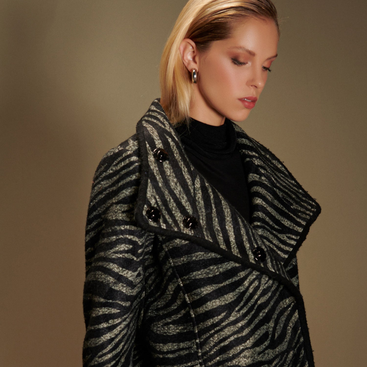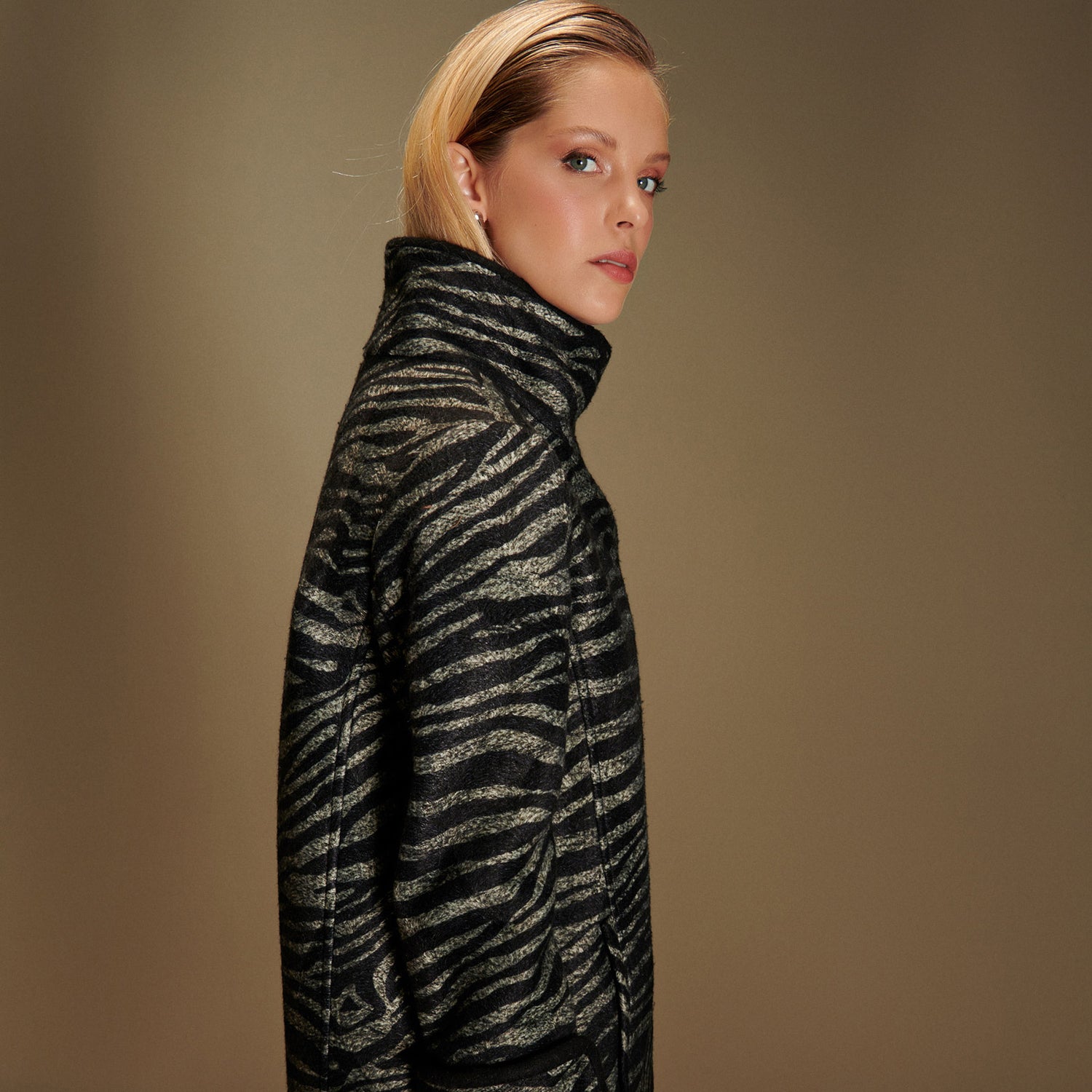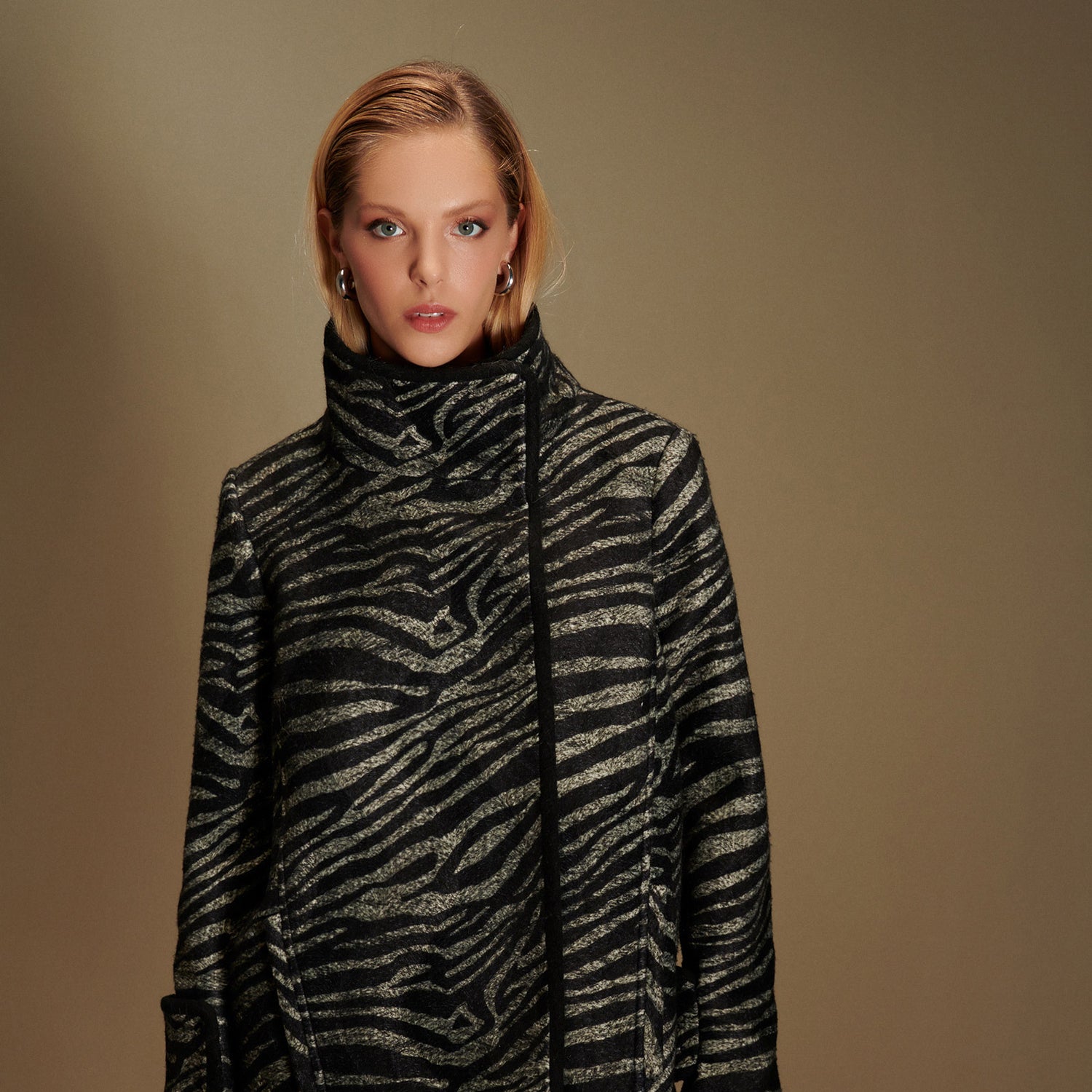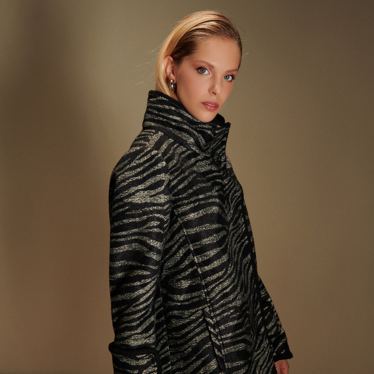 Feel like taking a stroll in your favorite city? Do it in our funnel neck black/gray zebra print jacket with oversized snap closures and comfy pockets. A semi-box tailored couture cut perfect for the office – dinner. Fabric and snaps are made from eco-friendly recycled materials.