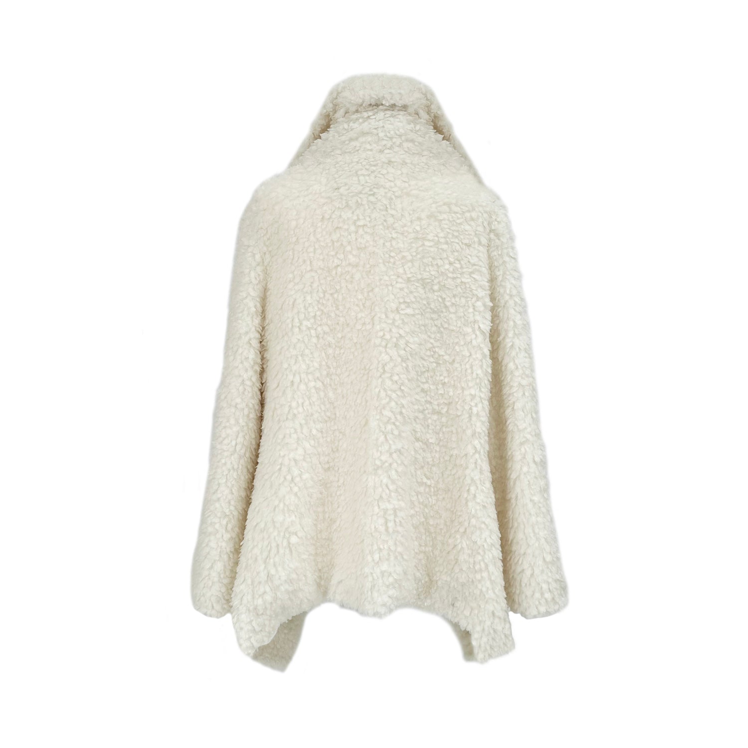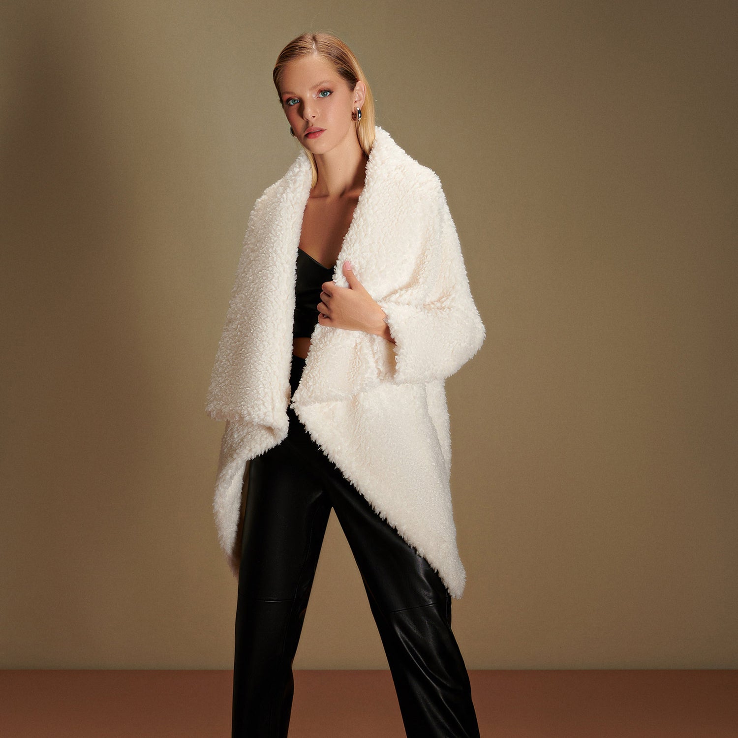 Complete your look with this open front soft faux fur jacket. This asymmetrical casual jacket is made of recycled polyester faux fur fabric.