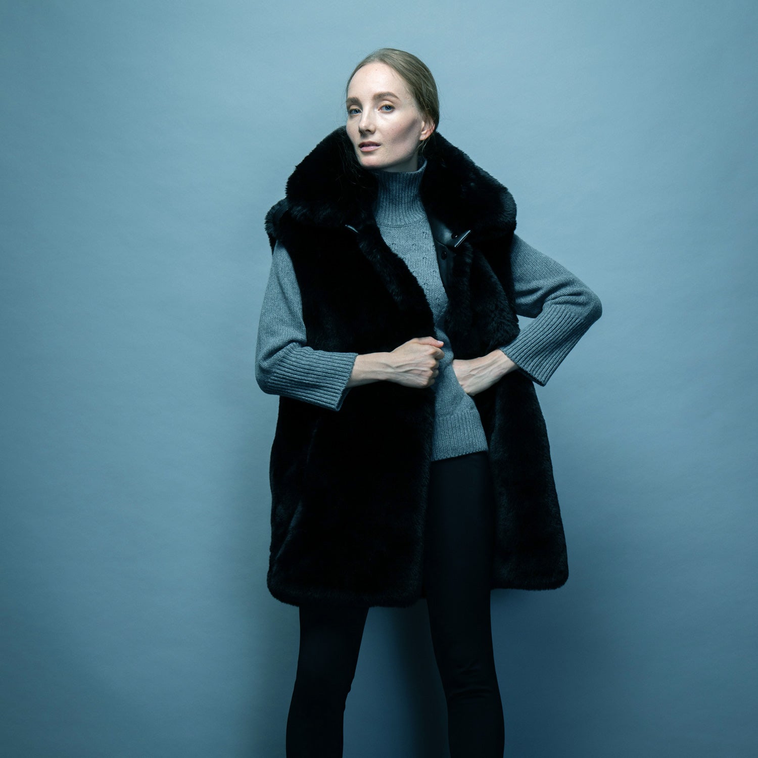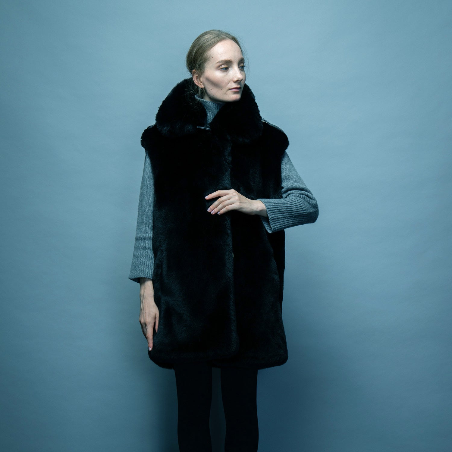 The perfect mix of dressy mink faux fur and sporty cold weather outerwear is yours in this sleeveless coat with gold metal buttons, 2 front welt pockets, and felt epaulette and separate belt.