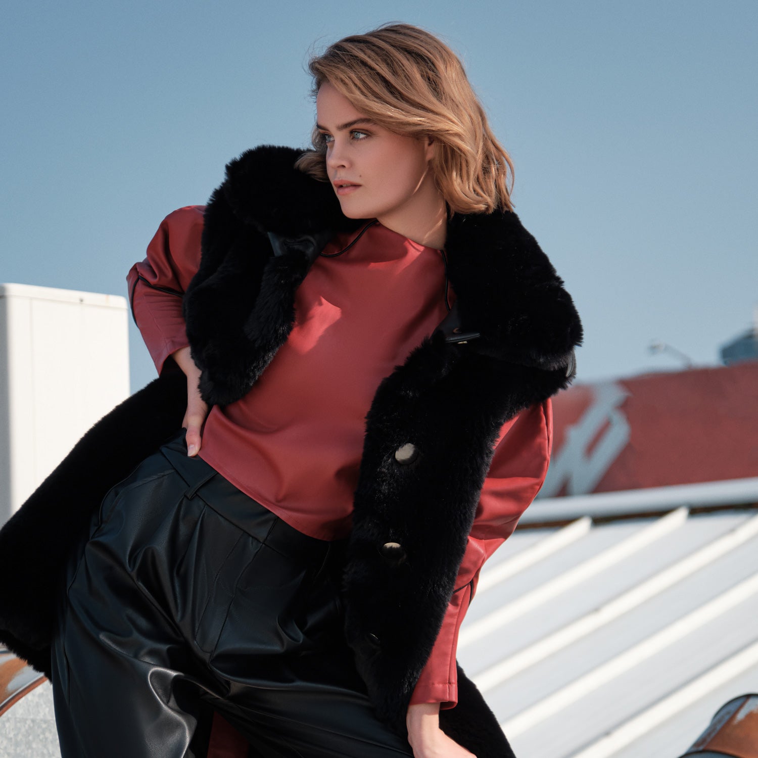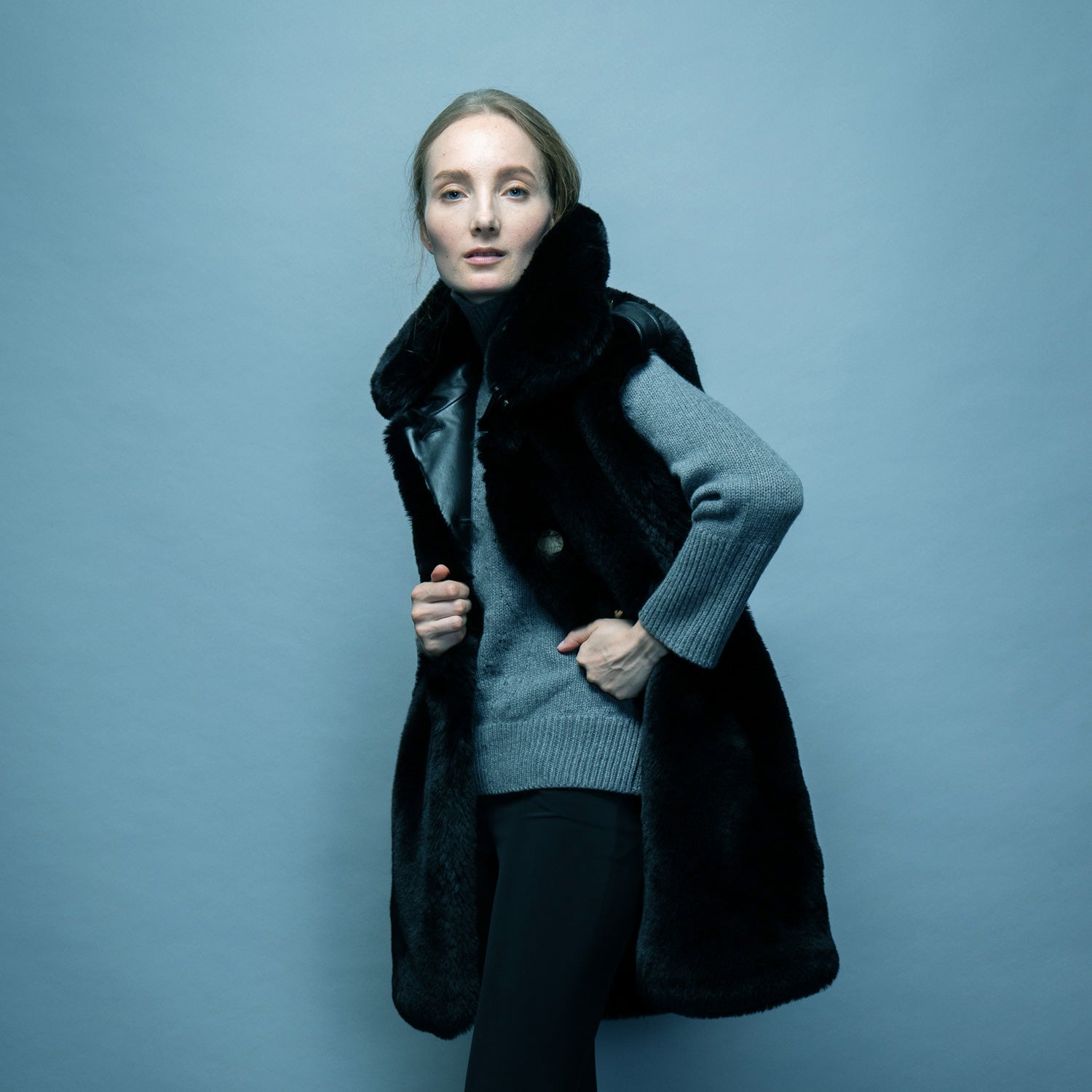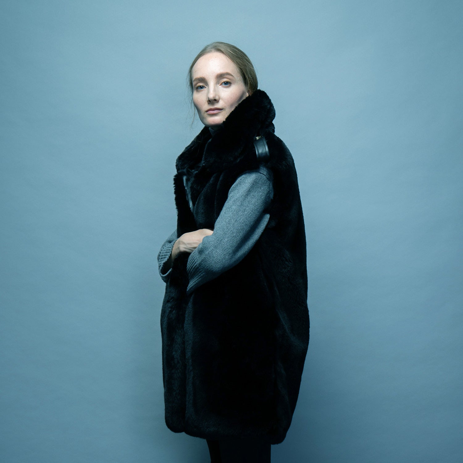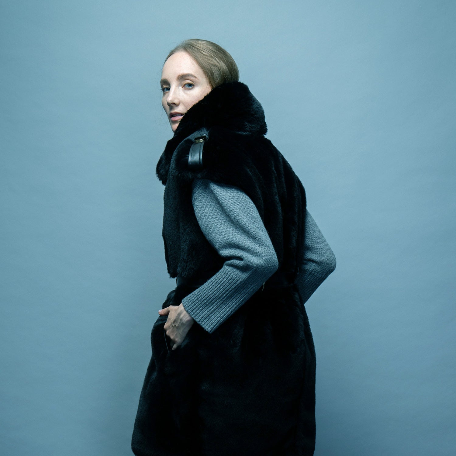 - mink faux fur with felt epaulette and separate belt detail