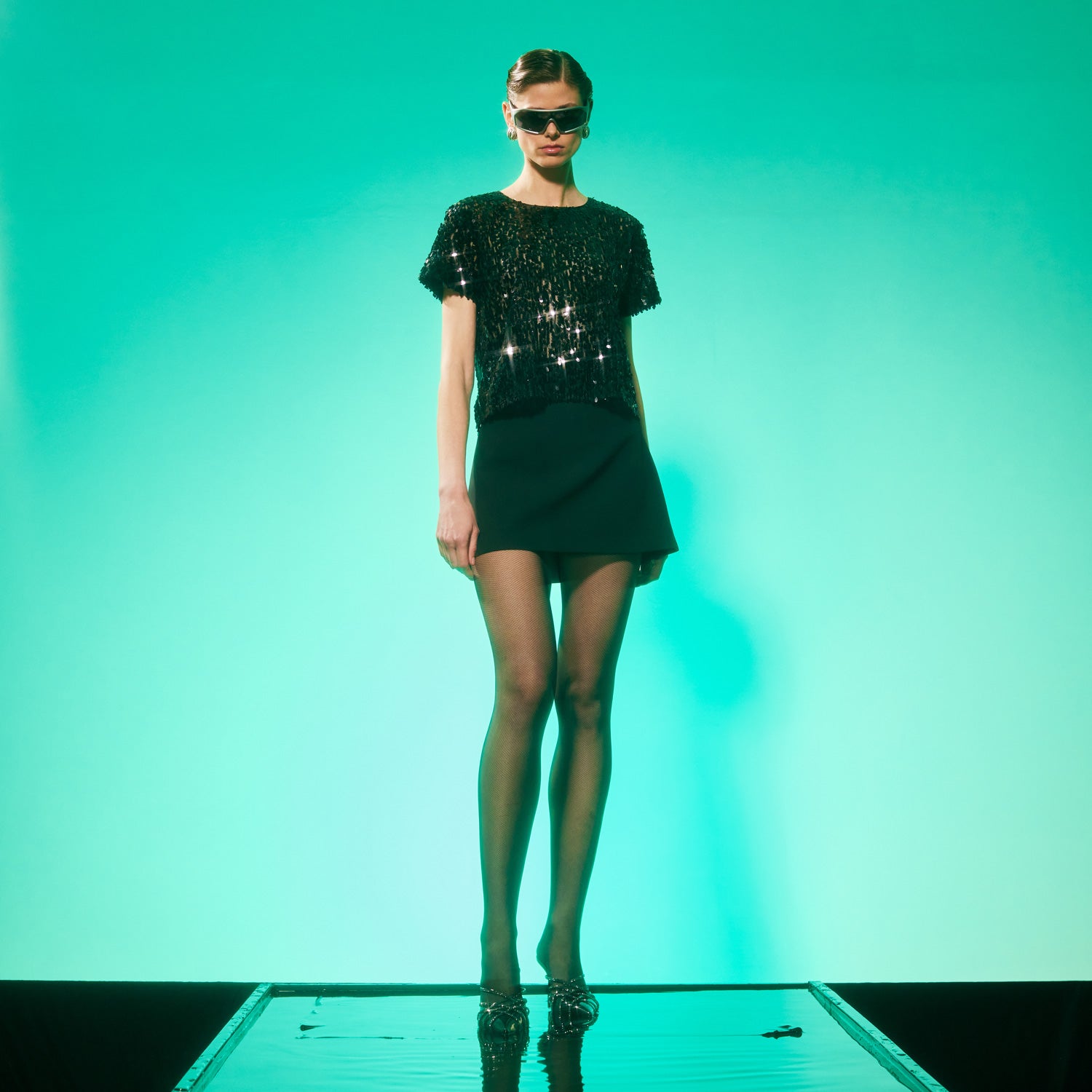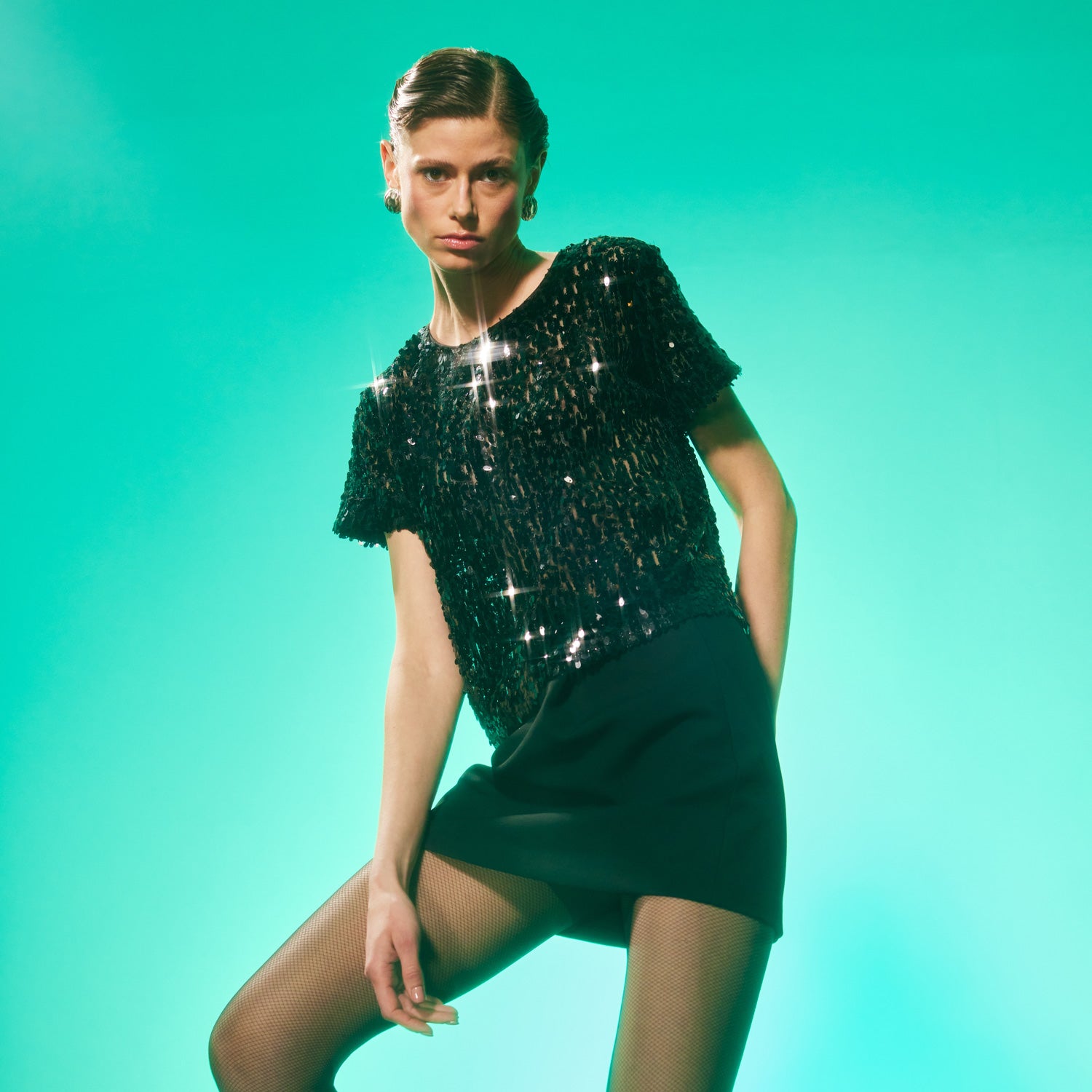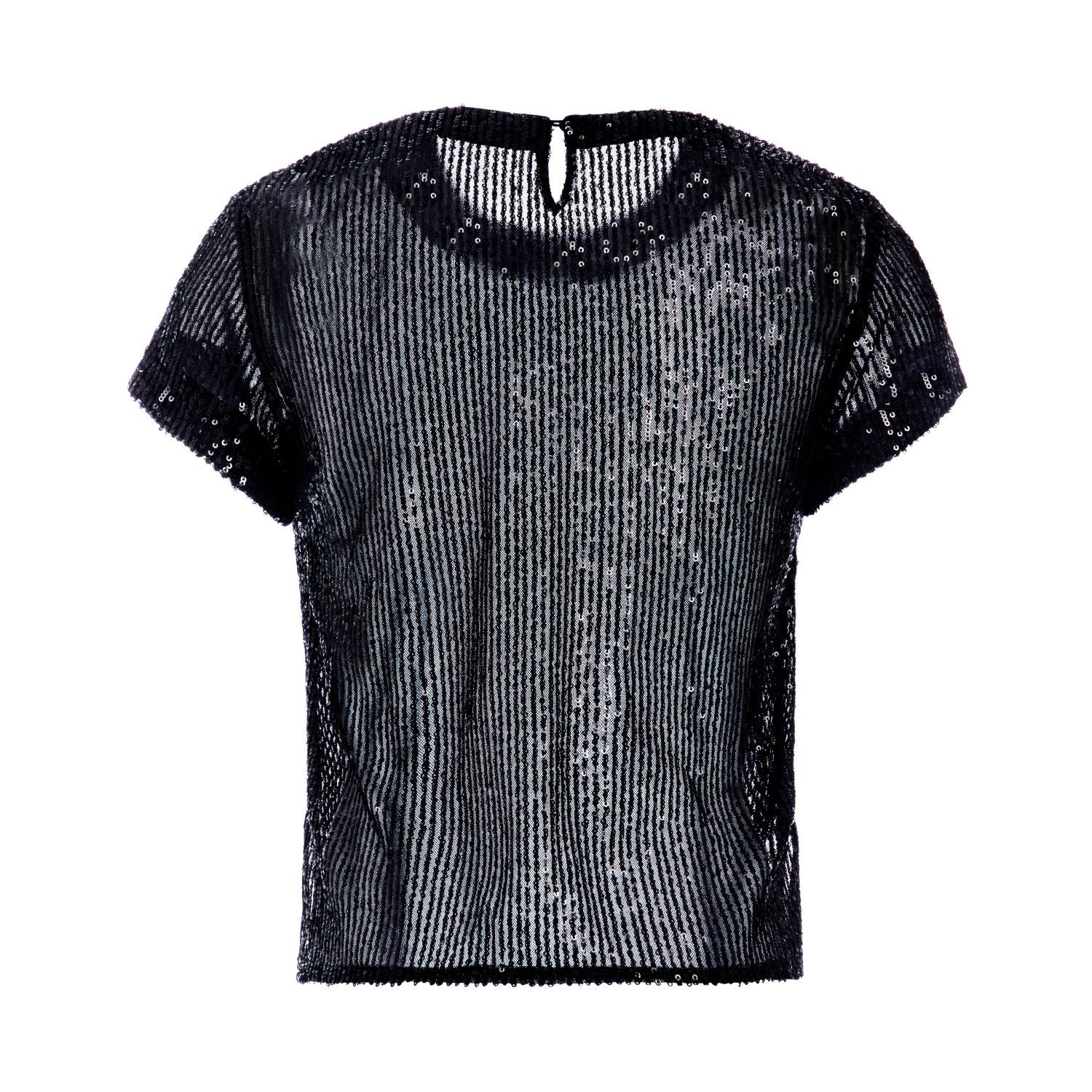 Elegant and sporty! This basic sequined t-shirt has satin piping at the collar. You will be very comfortable and chic at the same time. Perfect for nights out.