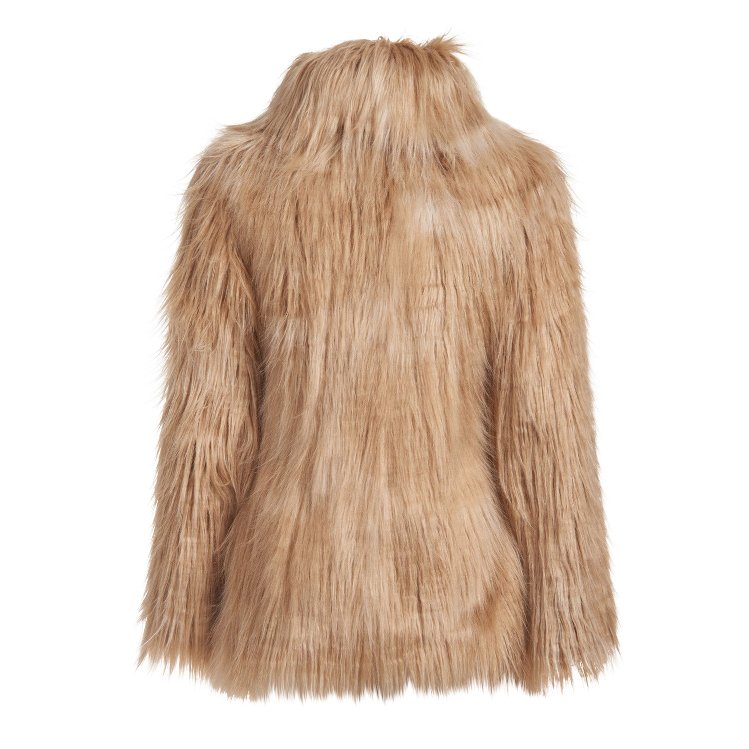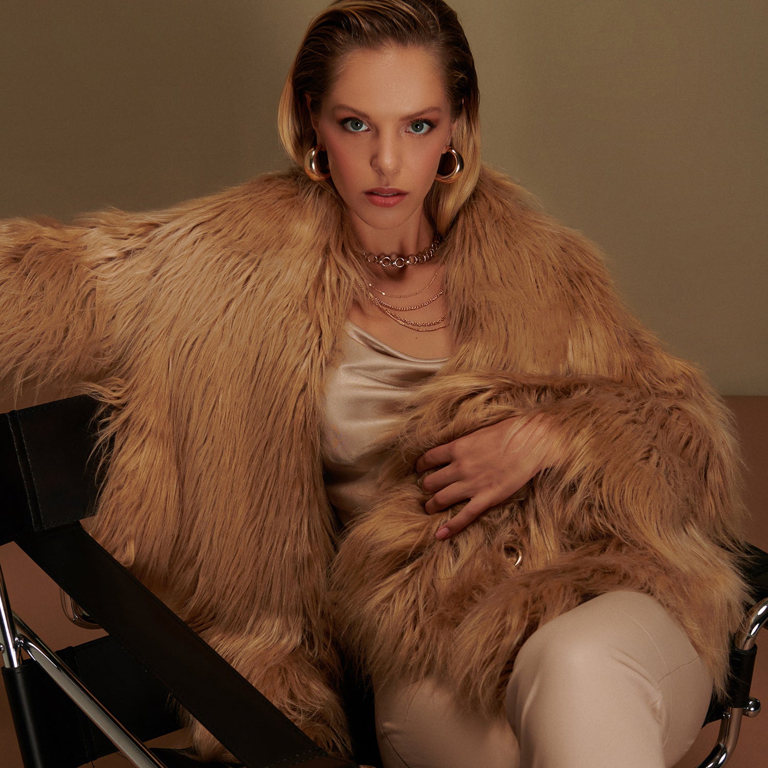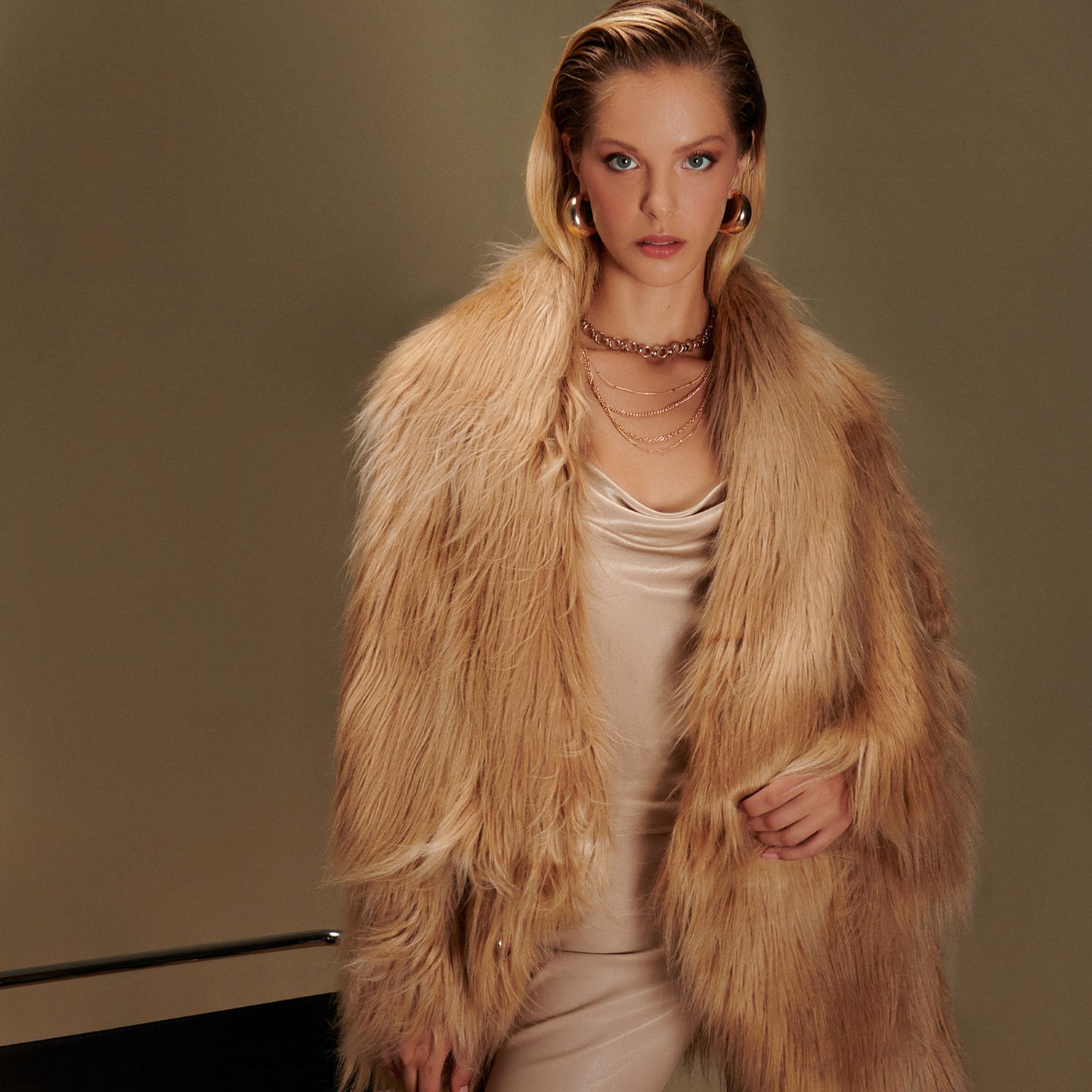 Wrap yourself in the relaxed style of this asymmetrical faux fur coat that can be worn open or closed with a beautiful draped front detail – cowl-draped cut with slit pockets and metal ring clasp.