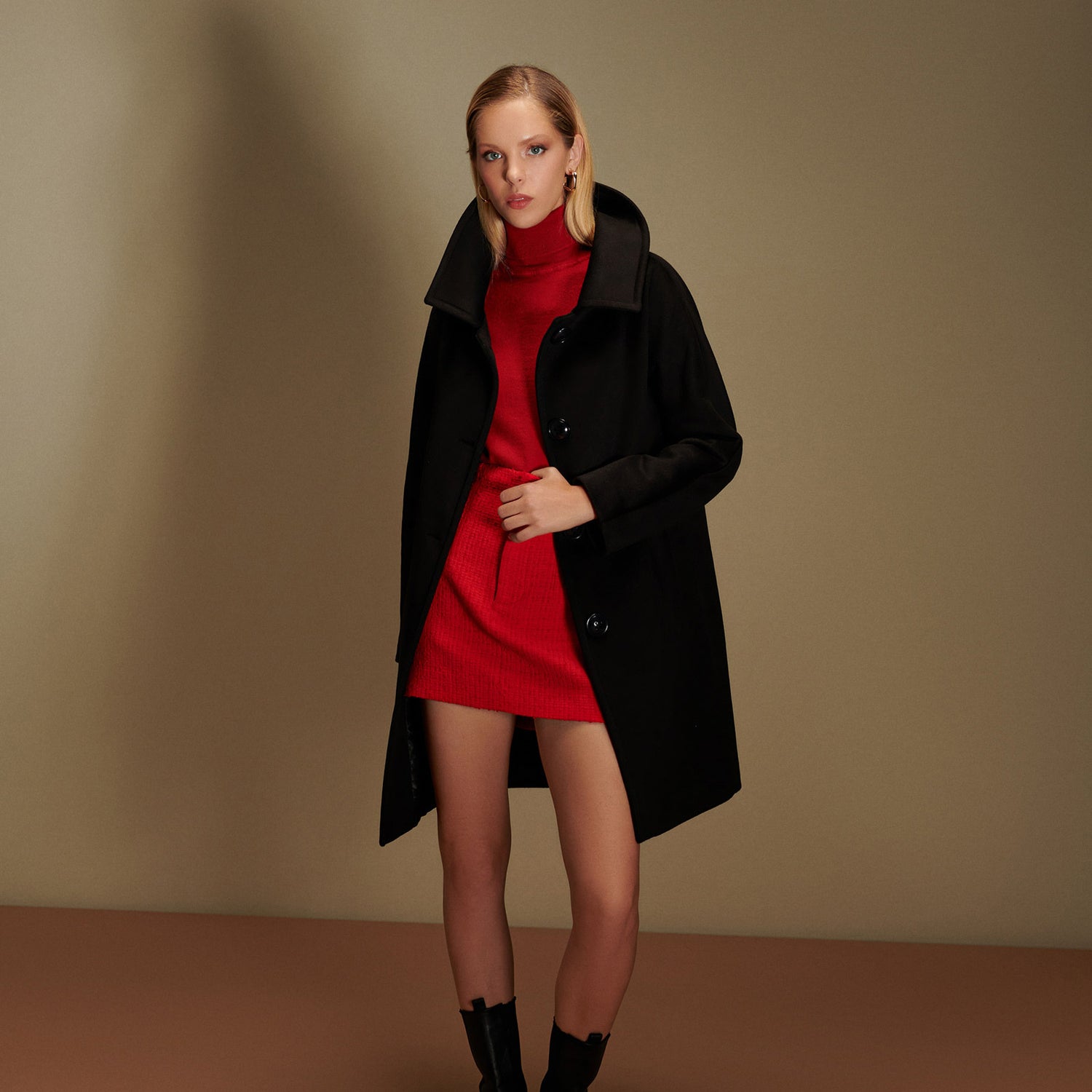 This short coat is an homage to the flirty yet sophisticated 60s. It is made of cashmere-like vegan fabric. The shape of the coat is fitted and a-line cut.