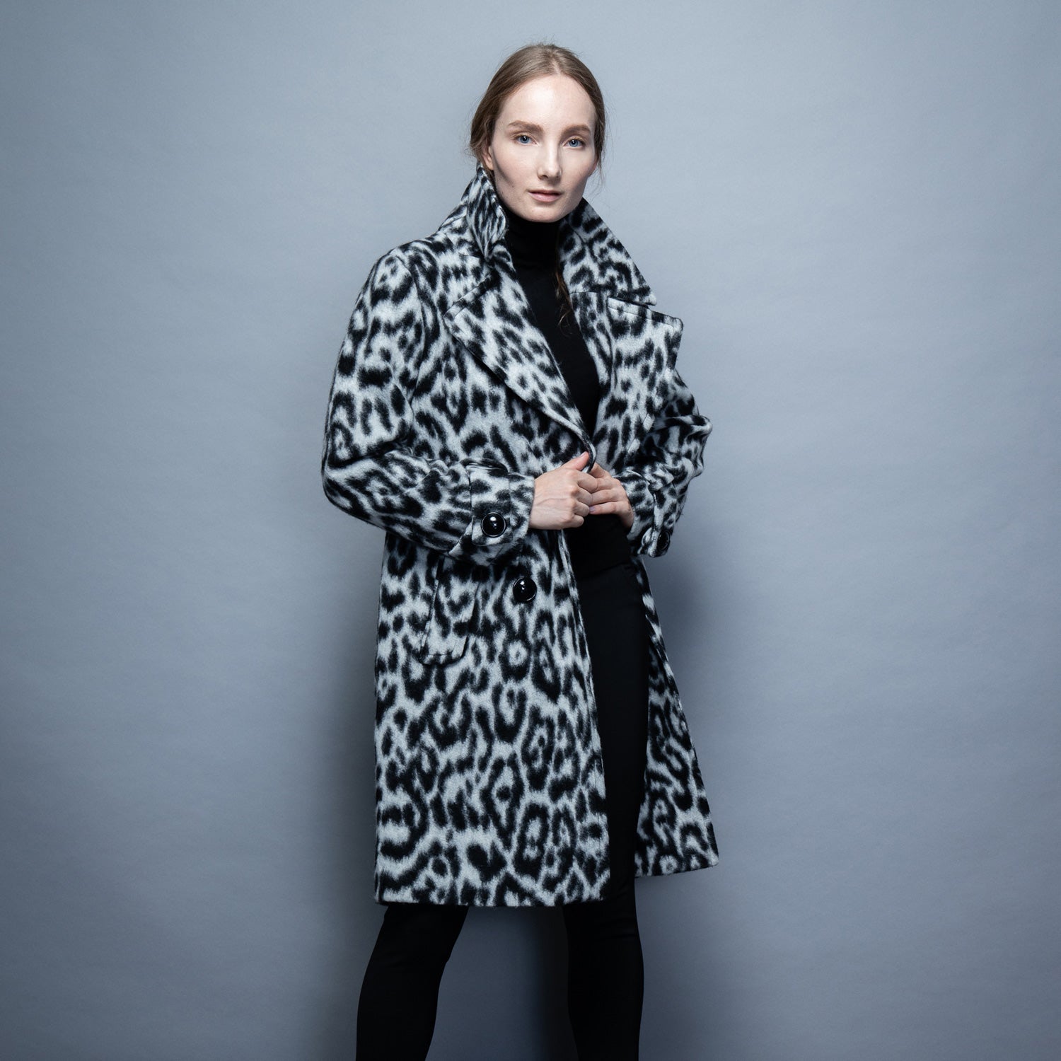 Black/gray leopard print soft wool-like fabric, relaxed roomy fit Worn open or buttoned